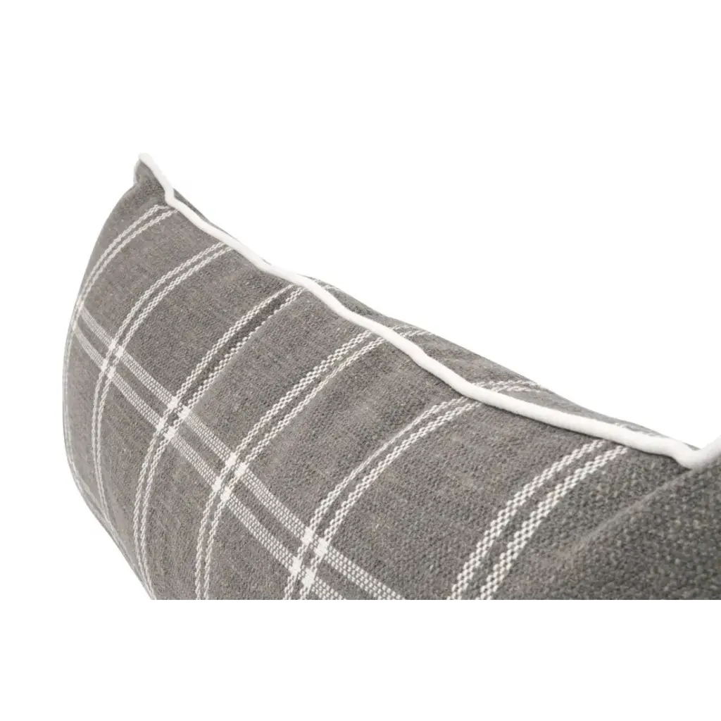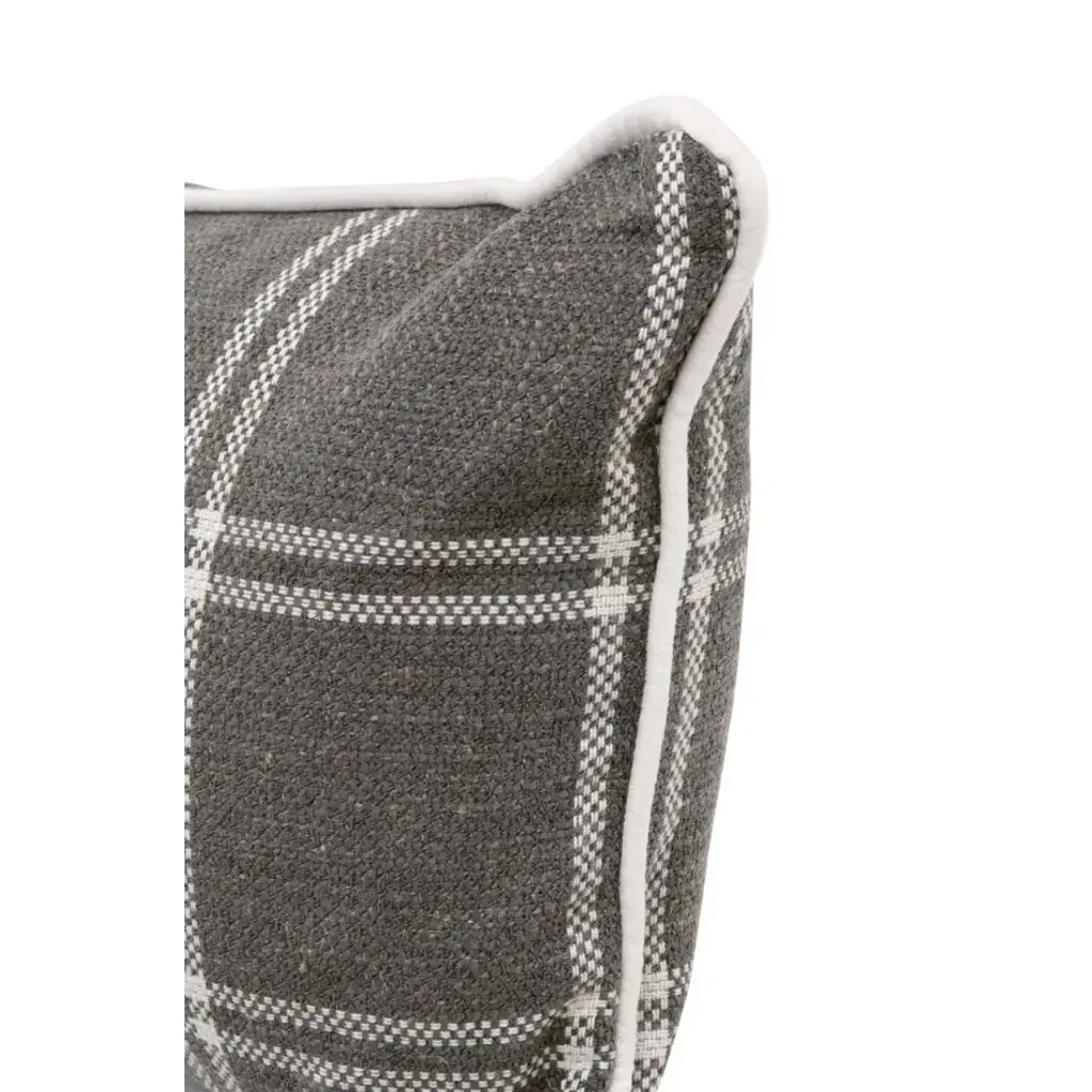 Add a touch of elegance to your living space with the Essentials For Living Not So Basic 34" Essential Lumbar Pillow. Designed with a transitional style, this pillow is perfect for any decor. It comes upholstered with a performance gray and white plaid and piped with LiveSmart machale-ivory material that provides a sleek and stylish look. The pillow's stain-resistant treated fabric ensures that it remains clean and spotless, making it a low maintenance accessory for your living room. The 100% down fill of the pillow offers unparalleled comfort and relaxation. It measures 34" wide, 5" deep, 13" high, creating an ideal pillow for back support or cozying up to. With its contrast piping detail, this is sure to add a sophisticated touch to any seating area.