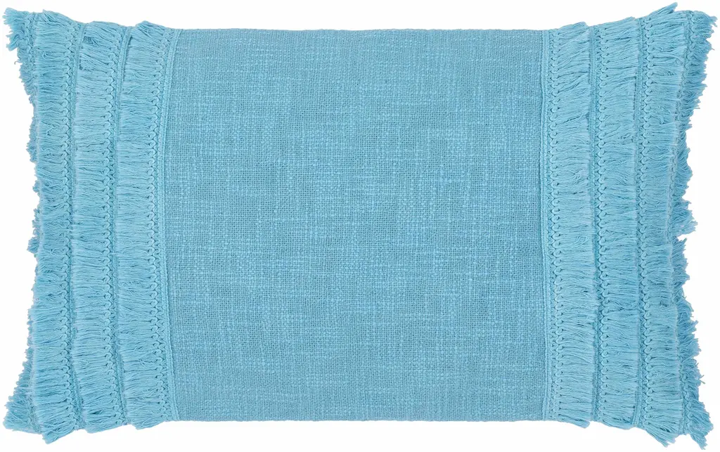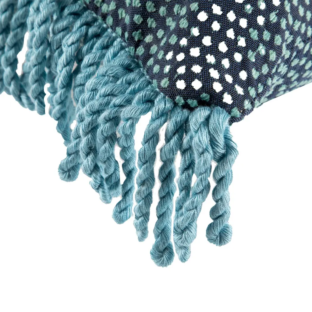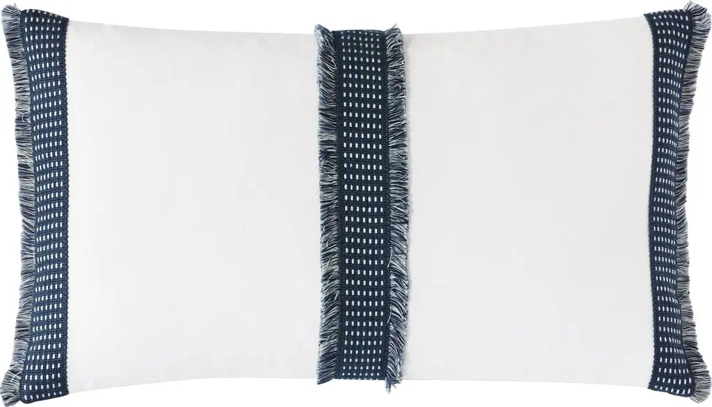 Designed by us and available only at One Kings Lane: Flirty fringe adds to the whimsy of this dotted lumbar pillow. Made of UV-resistant, water-resistant fabric, the pillow will maintain its good looks for seasons to come. The cushion fill feels as sumptuous as down, making the pillow equally welcome indoors.