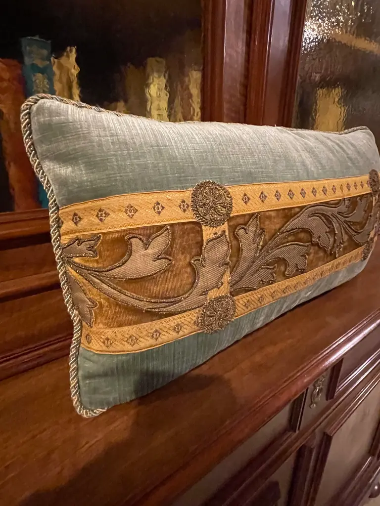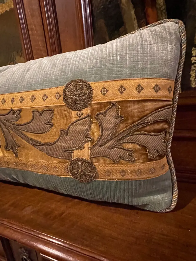 Antique raised gold metallic thread embroidery from antique religious vestments, bordered with antique European gold metallic galloon on Wedgwood Blue velvet. Hand trimmed. Down filled.