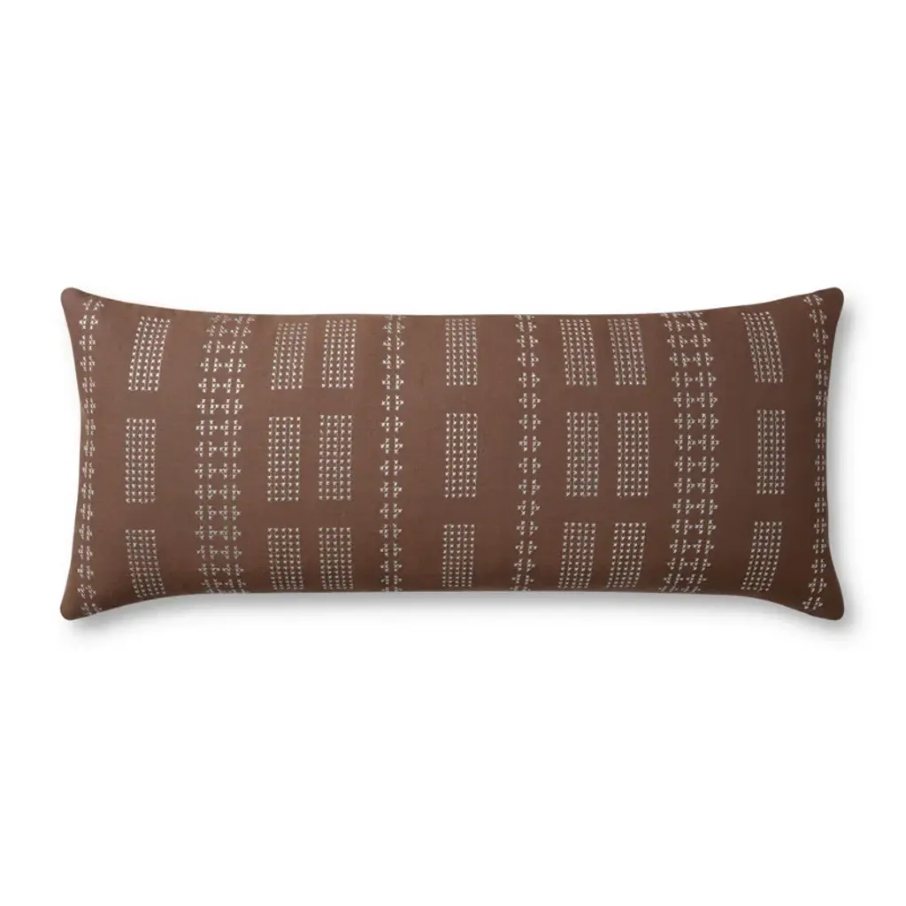 The throw pillow features intricate geometric embroidery that draws the eye toward this plush lumbar cushion. Designed by Jean Stoffer.