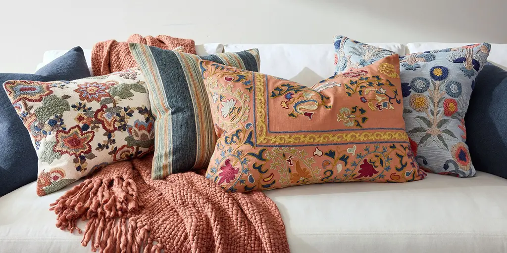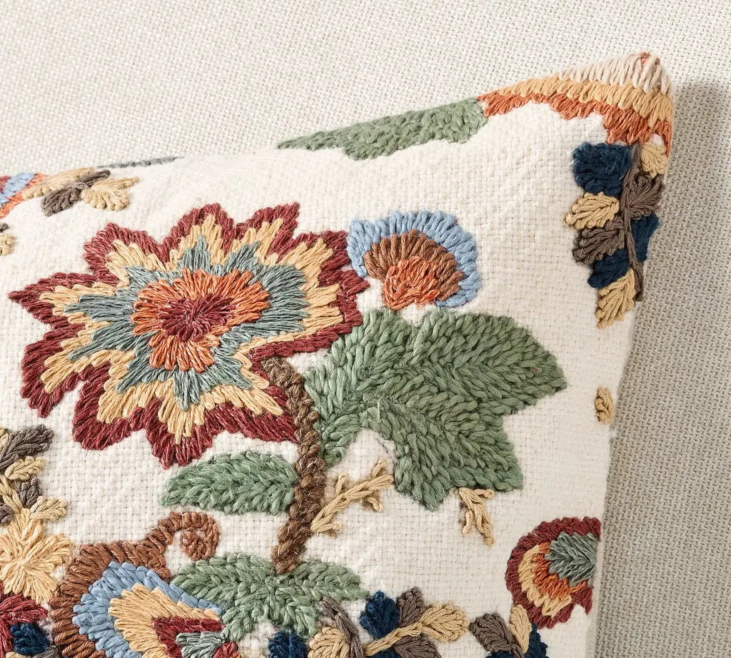Small in size, but statement-making in style, this pillow has a vibrant floral pattern in rich, autumnal colors. Thickly embroidered on a basketweave base, it brings texture and dimension to a room. It reverses to a bold solid in complementing hues, perfect for a chair, sofa, or bed.