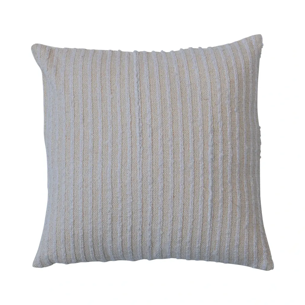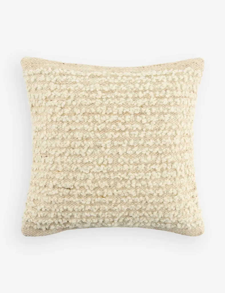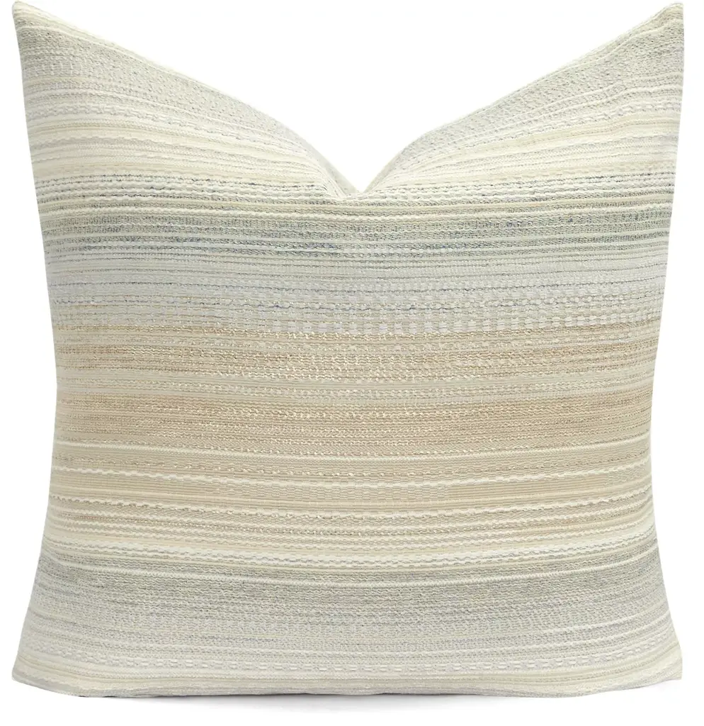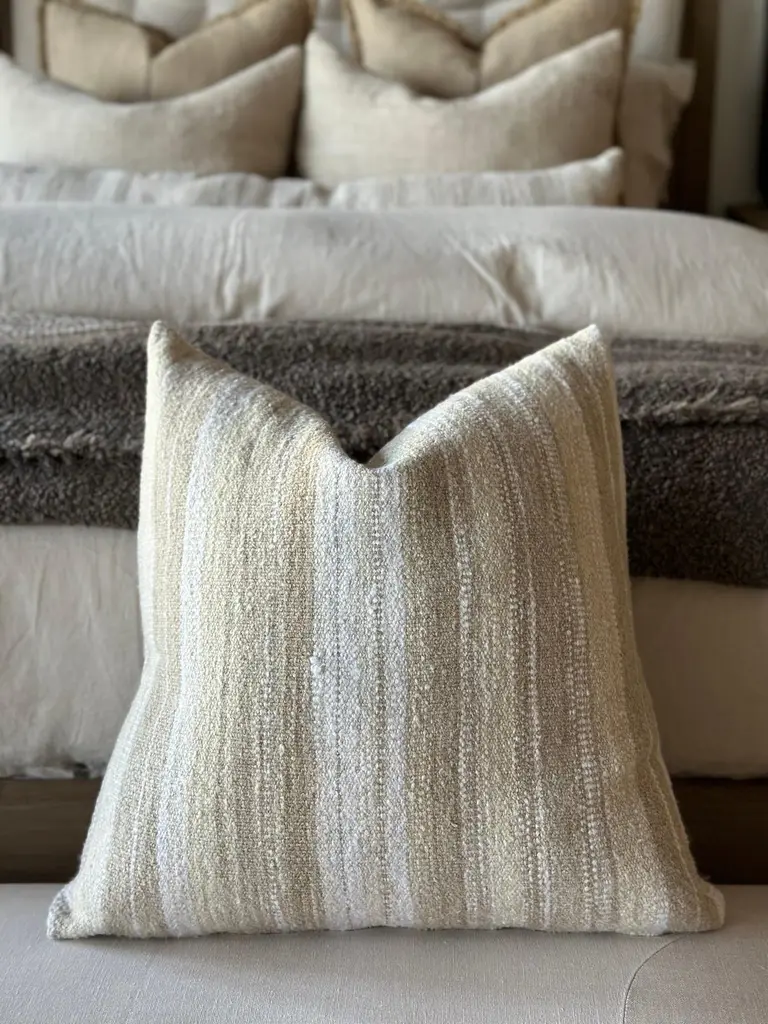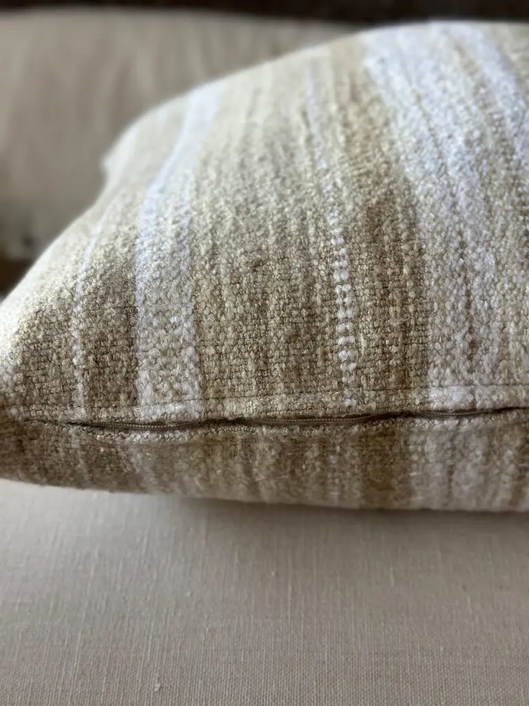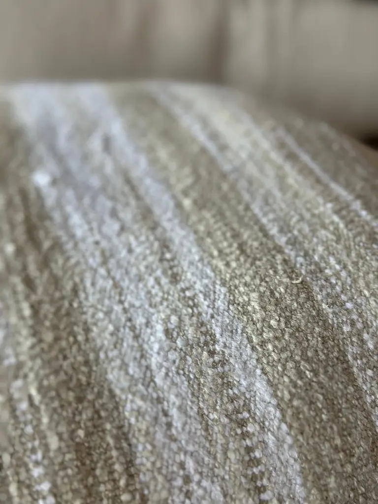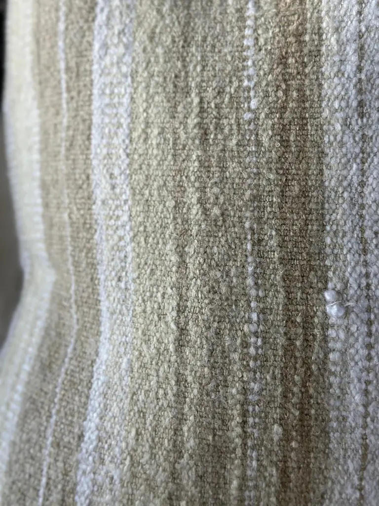 Woven in Belgium using traditional weaving techniques, Nagy combines Belgian linen with soft viscose. The slub like yarns alternating color along the warp create an inspired stripe from vintage textiles with some vibrant variations.Size: 23"x 23"Color: NATURAL / OAT / WHITEPillows are sewn to order, please allow 2-3 weeks for your pillow to be sewn before shipping.MADE IN USAContent: Linen 37%Viscose 36%Acrylic 24%Polyamide 2%Nylon 1%