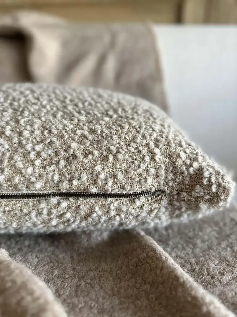 Hand Woven Wool and linen Petite Lumbar Pillow Extremely soft to the hand, this beautiful cloud gray colored boucle style lumbar pillow is a perfect accent to your space. Includes Down/Feather insert Size: 15X24 Zipper closure. Content: Wool,Linen,Viscose,PA Care: For best results dry cleaning is recommended.
