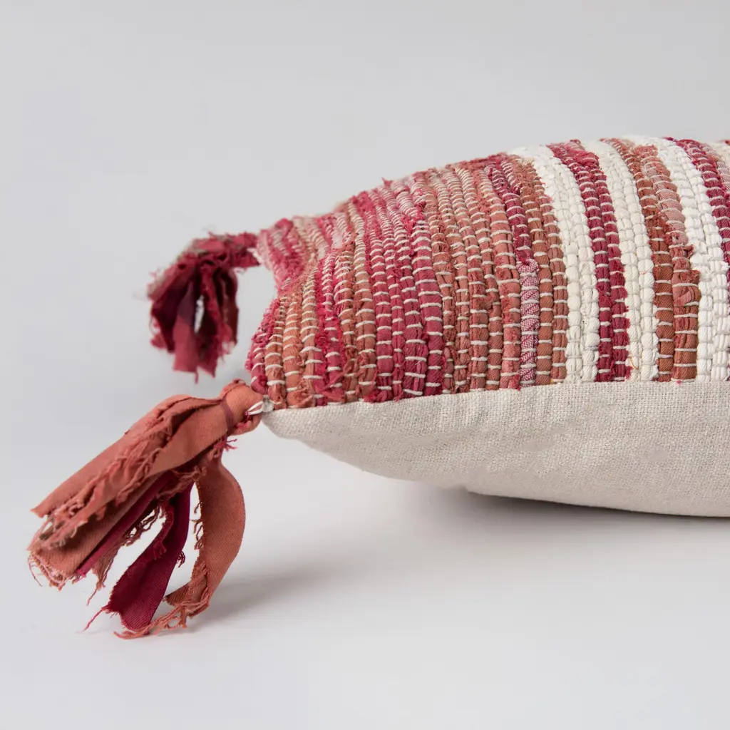This pillow is a concerted effort to keep garment wastes from contributing to the pollution of our planet. Our team gathers denim discards and repurposes them into weaving materials using their original colorations as artistic elements in creating a soft hand and an artisinally organically crafted piece of art. While the palette will be consistent, the placement of the respective colors may not be a perfect match as it will be determined by the materials at hand. The striping pattern will be maintained but the EXACT colors used may be altered. This is not a flaw but rather a way that we can repurpose and refrain from bleaching or dying products used in the craftiness of these recycled and repurposed products. Knife edged, this pillow features a solid coordinating cotton back with a hidden zipper closure.