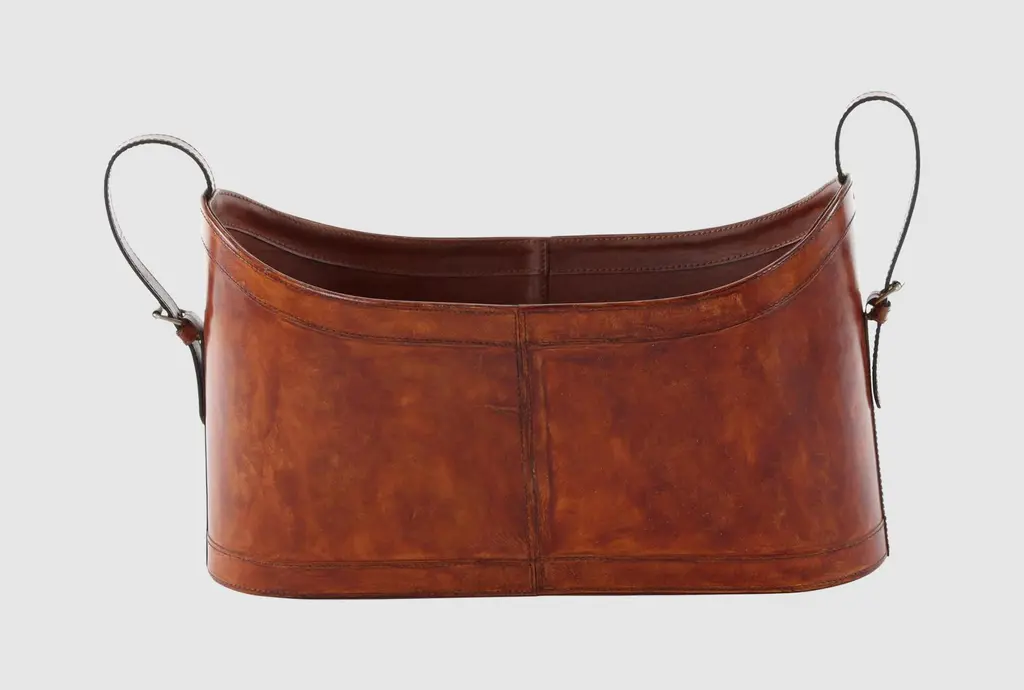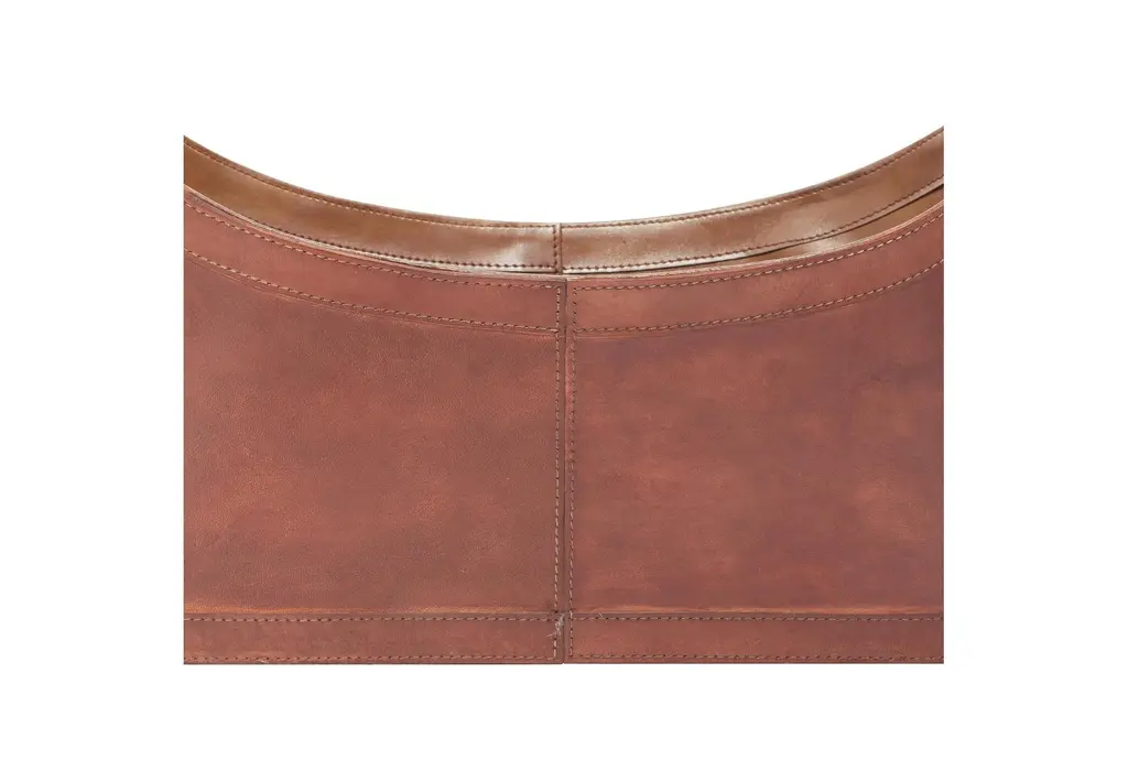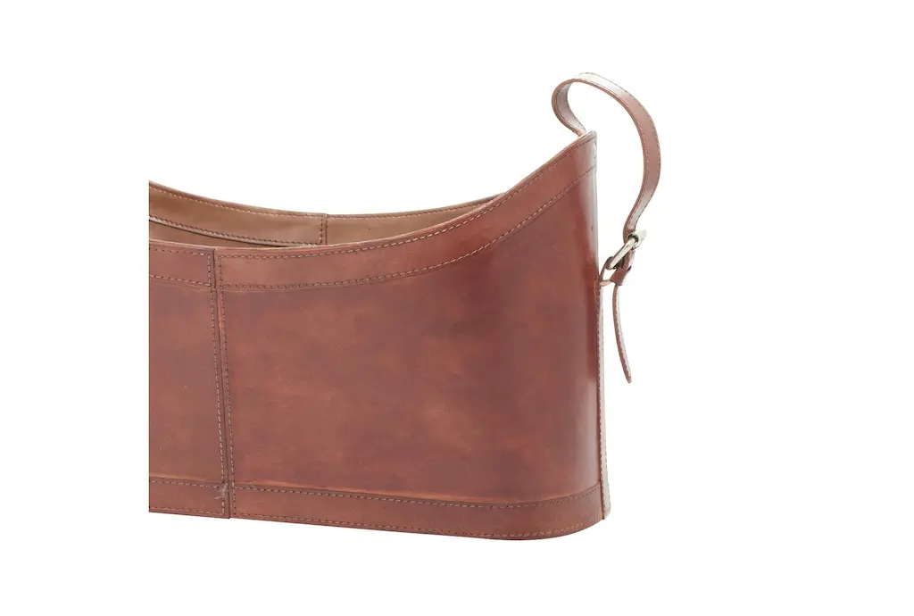 12 Inch Brown Leather Rustic Magazine Holder With Detail Stitching And Curved Handles