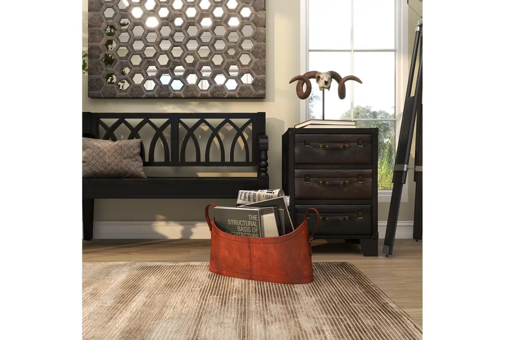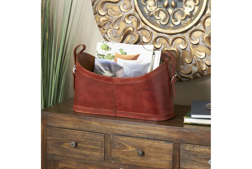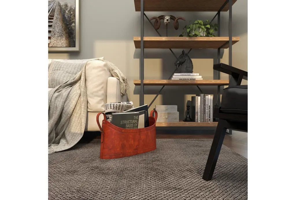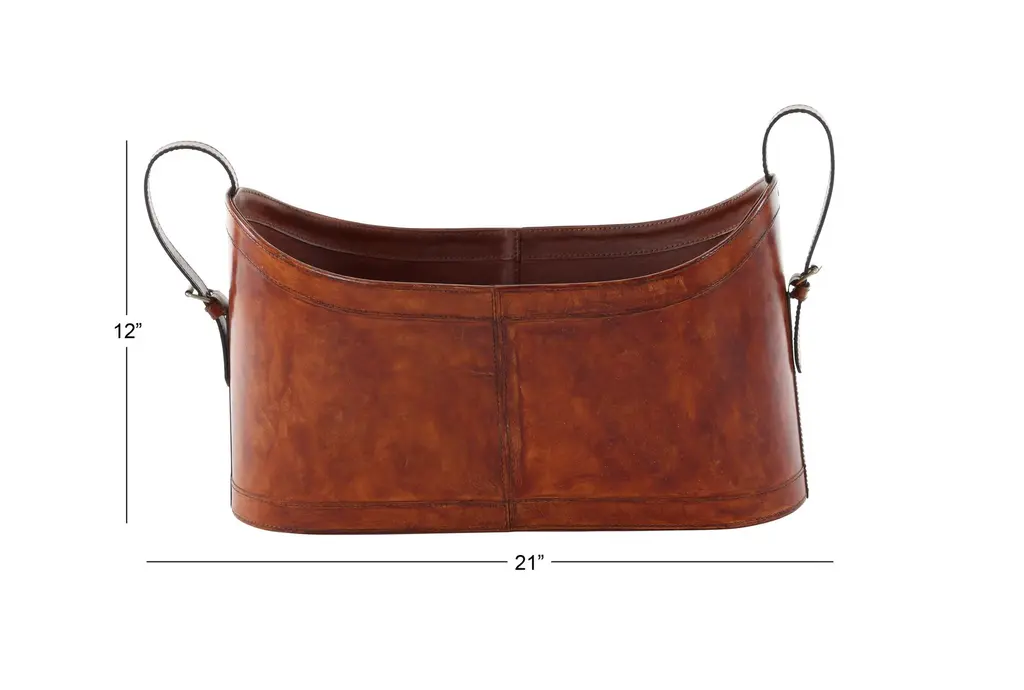 The perfect compact storage for your belongings while keeping your space free of clutter. Bring a finishing touch to your home with an inviting appeal with this chic magazine holder. This leather magazine organizer can serve as a reading material holder or as decorative container next to sofa sets in the living room. This item ships in 1 carton. Hard leather keeps shape. Leather magazine holder makes a great gift for any occasion. Due to the handmade nature of this item, no two will be alike, there will be slight differences in shape, size, and color. Suitable for indoor use only. This item ships fully assembled in one piece. Leather and hair on hide are natural products, and therefore no two will be alike. There may slight variations in pattern, natural blemishes, colors, and overall aesthetic of the product. Maximum weight limit is 15 lbs. Made in India. This is a single brown colored magazine rack. Rustic style.