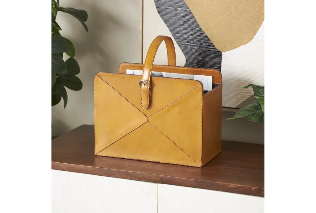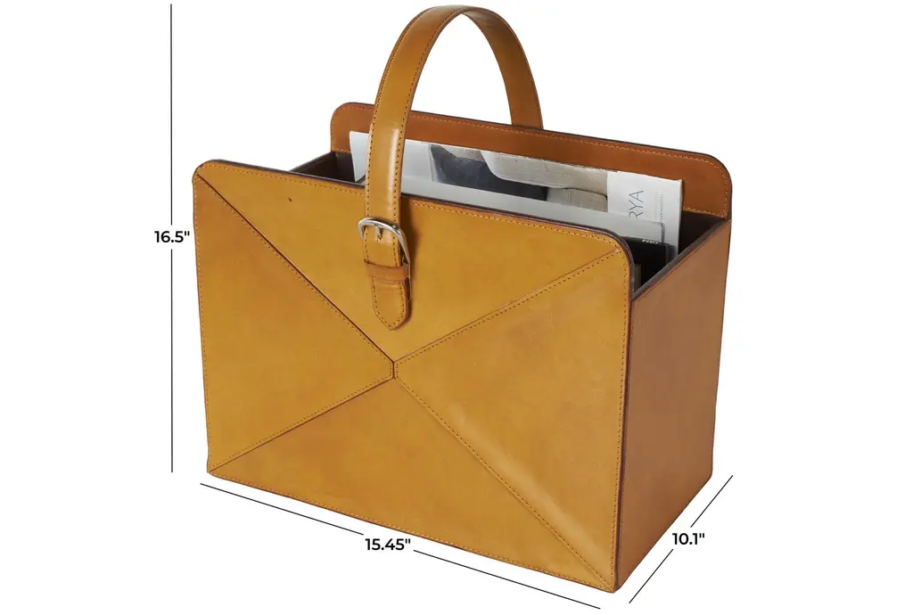 This 15" X 17" brown leather magazine holder is a perfect blend of style and functionality. Featuring a single slot with curved buckle handles, it is designed to keep your magazines organized while adding a sophisticated touch to your space. The hand-carved details enhance its minimalist design, making it a versatile accessory for any room.