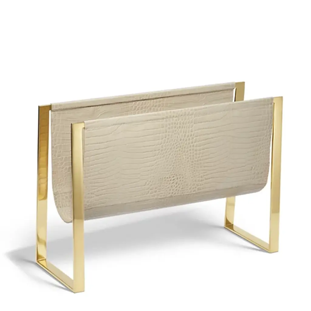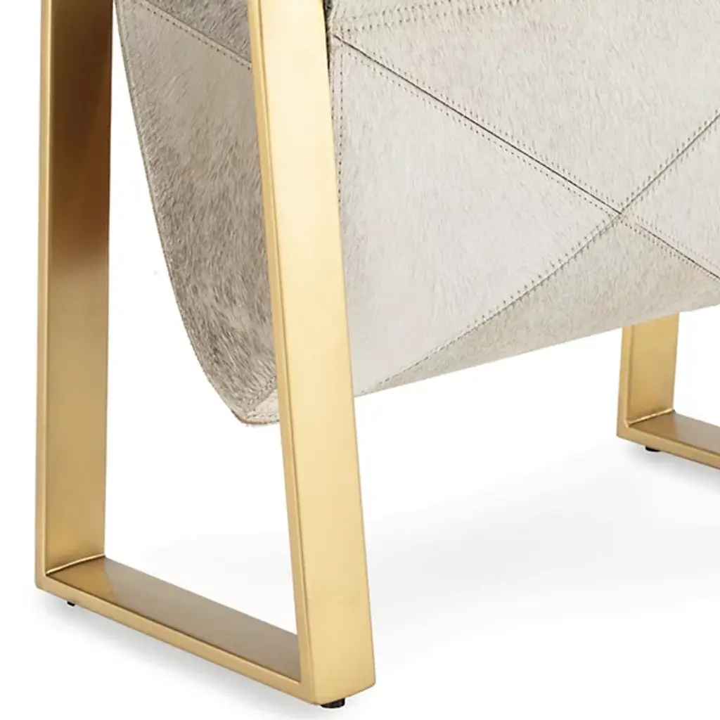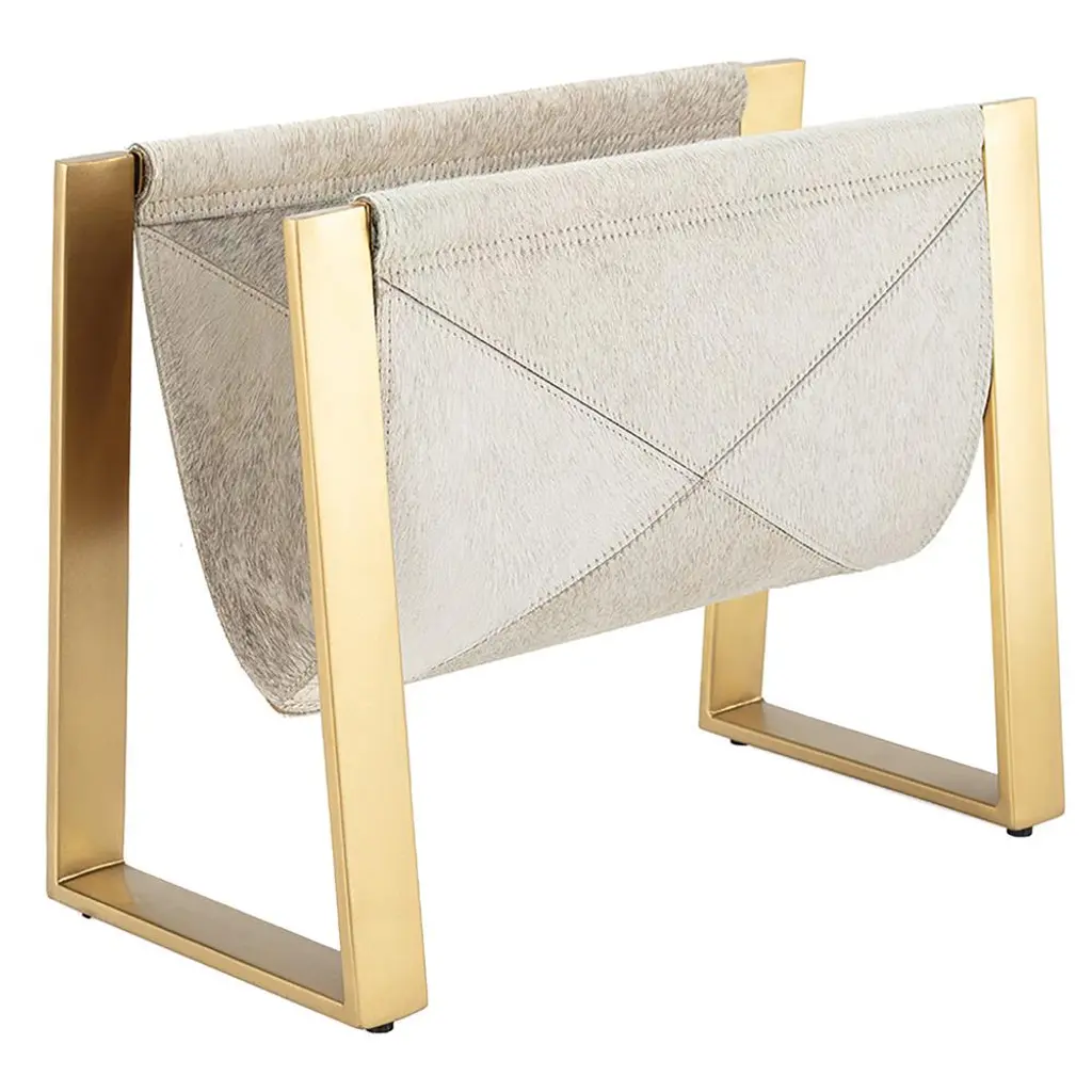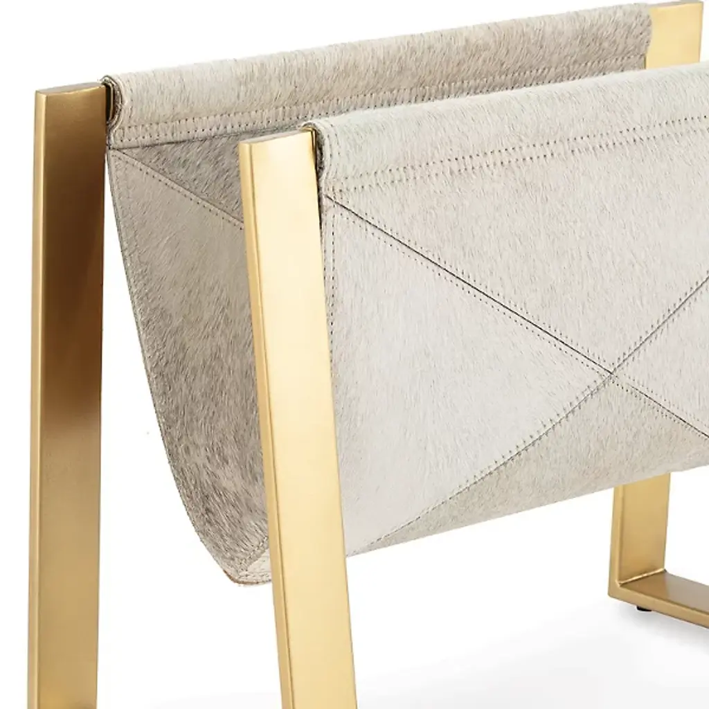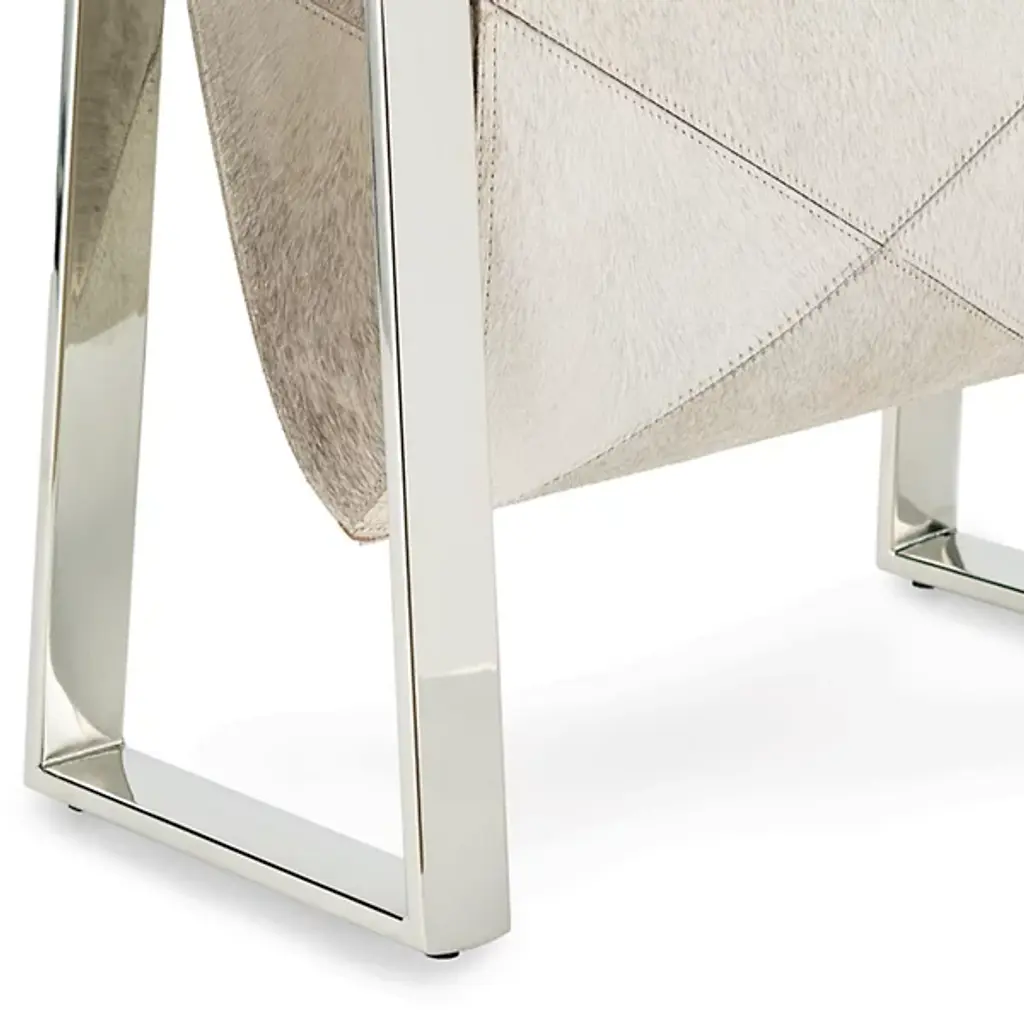 The Andres Hair on Hide Magazine Rack from Regina Andrew marries primal textures with sleek modernity. Its frame, a study in minimalist design, starkly contrasts the organic warmth of the hide. This piece stores magazines and displays them as art, transforming everyday reading material into curated collections. It adds a tactile dimension to any space while serving a practical purpose. It bridges the gap between nature and design, turning the act of reaching for a magazine into an experience of textural delight.
