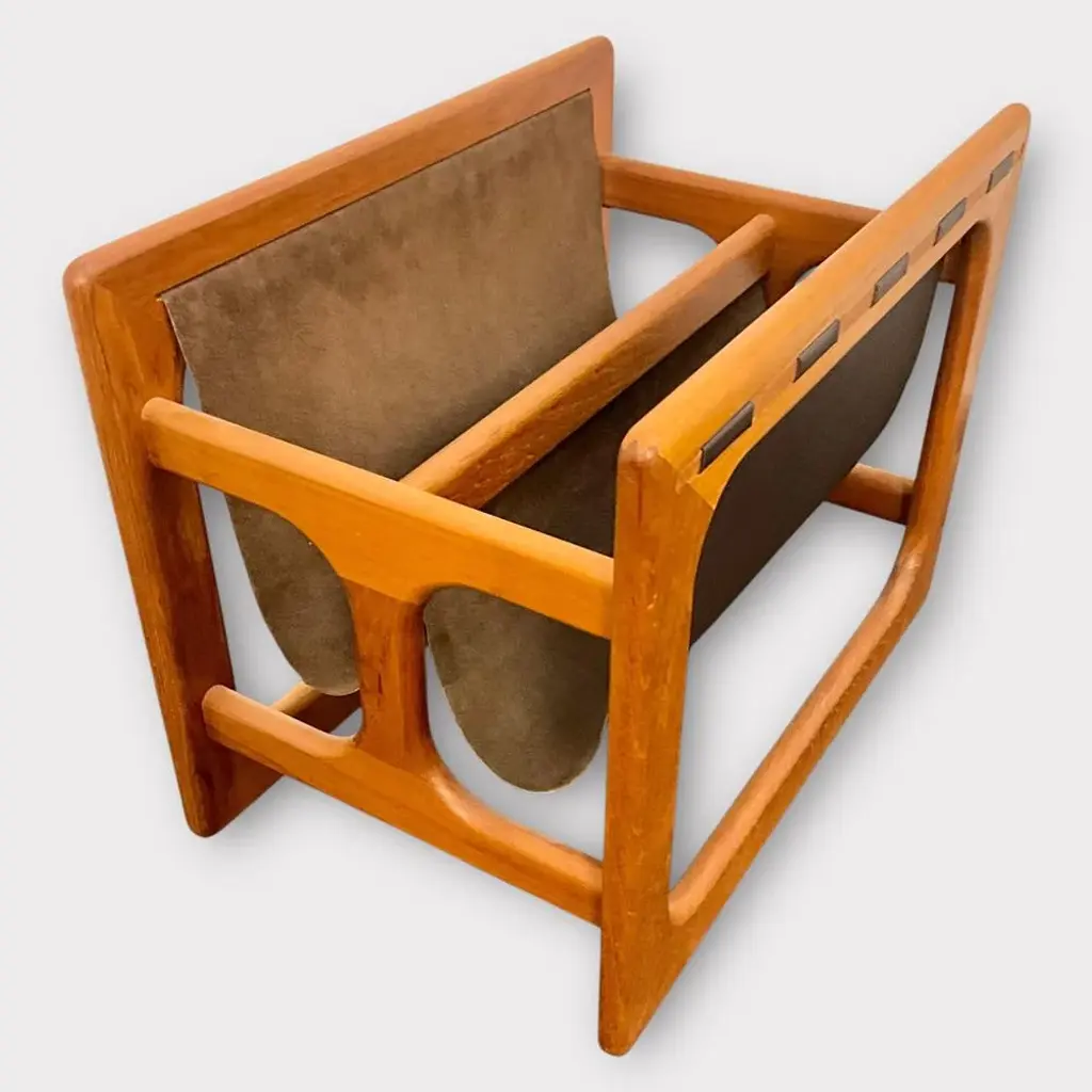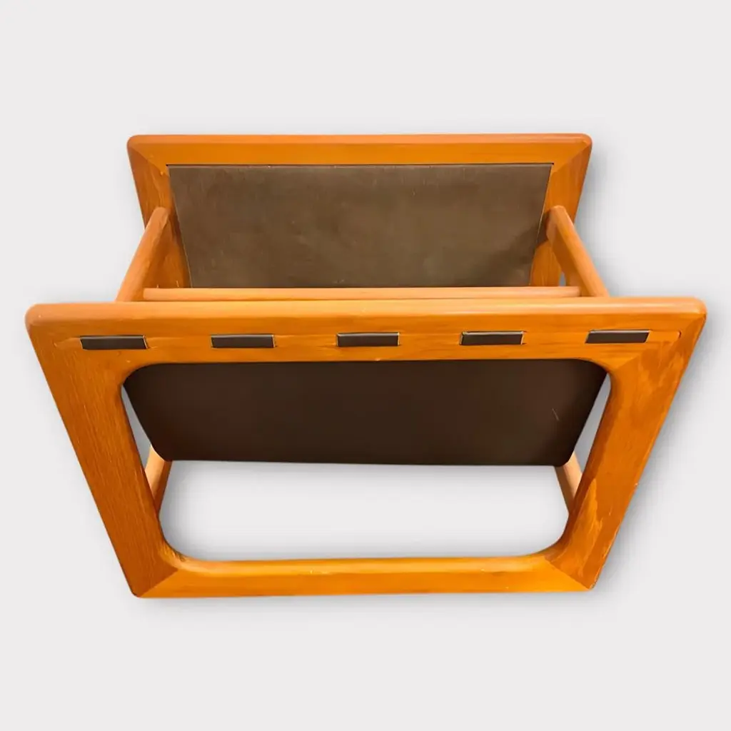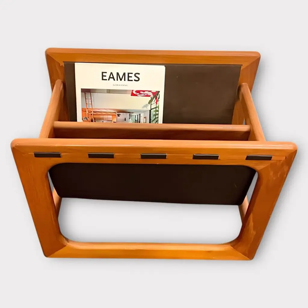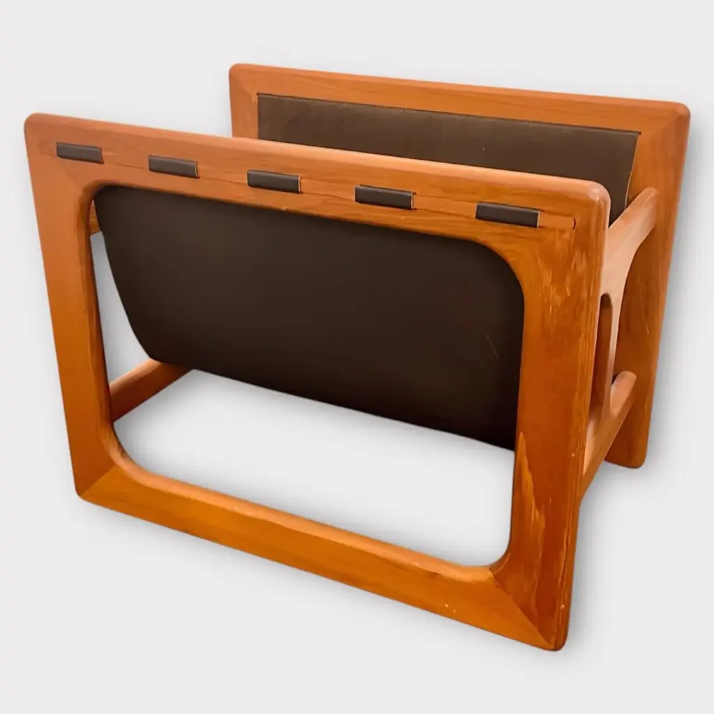 A danish modern newspaper holder / magazine rack design classic of the mid-century era is offered here. 1960s design by aksel kjersgaard for salin mobler in denmark. * the frame is made of elegant, solid teak. * in the rare version with two storage compartments made of genuine leather, in the color milk chocolate brown. * this design is characterized by perfect proportions and first-class quality in materials and workmanship. + the offer is for one newspaper holder, but we have two identical ones in comparable condition on offer. dimensions width 51.5 cm * height 40 cm * depth 33 cm condition the magazine rack is in good and beautiful vintage condition with occasional insignificant and minor signs of wear and age. + these are occasionally smaller surface scratches, scuffs and notches on the solid wooden frame. + the leather has a patina consistent with age and use, such as color differences due to light and use, and a few small scratches/ratchets on the leather. + the age-related signs of wear on both magazine racks of the same model are comparable but of course not identical. …… the traces are a little more visible on closer inspection but without being serious…… + the pictures are part of the condition and show the most noticeable signs of age and use, so we ask you to take a close look at the pictures. this piece is attributed to the mentioned designer/maker. It has no attribution mark and no official proof of authenticity, however it is well documented in design history. I take full responsibility for any authenticity issues arising from misattribution