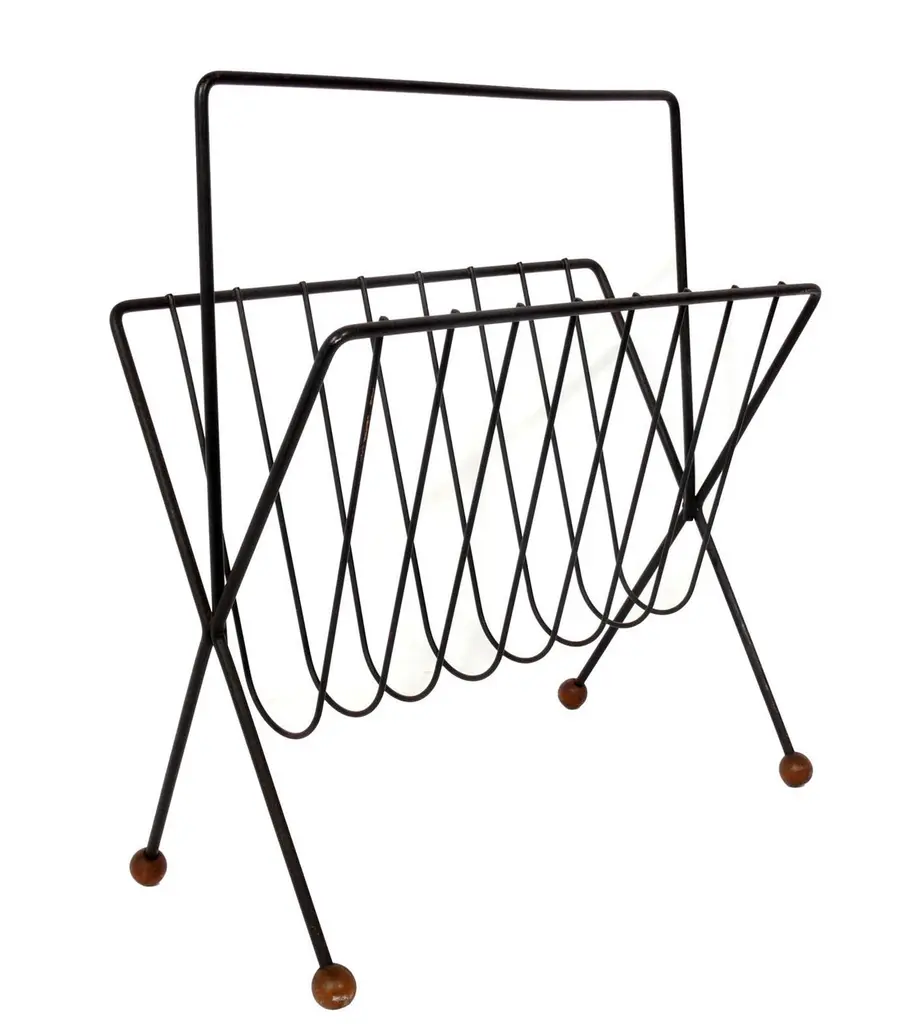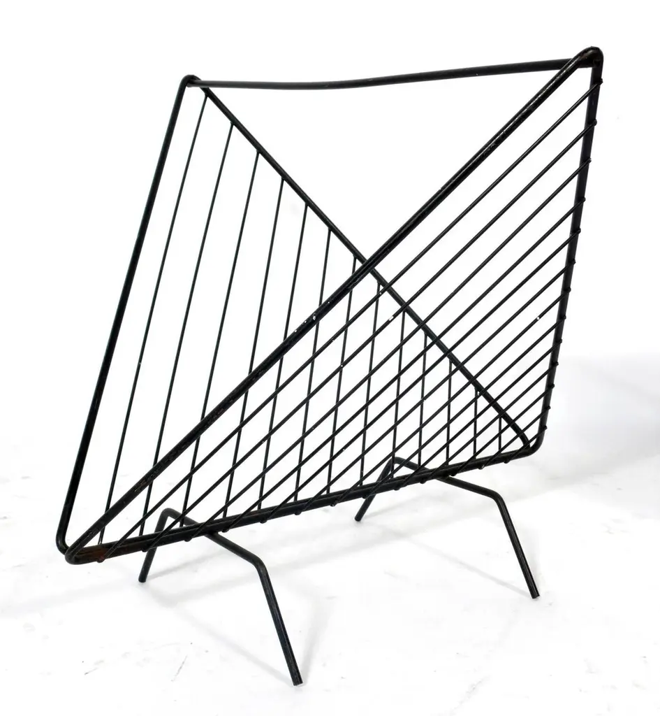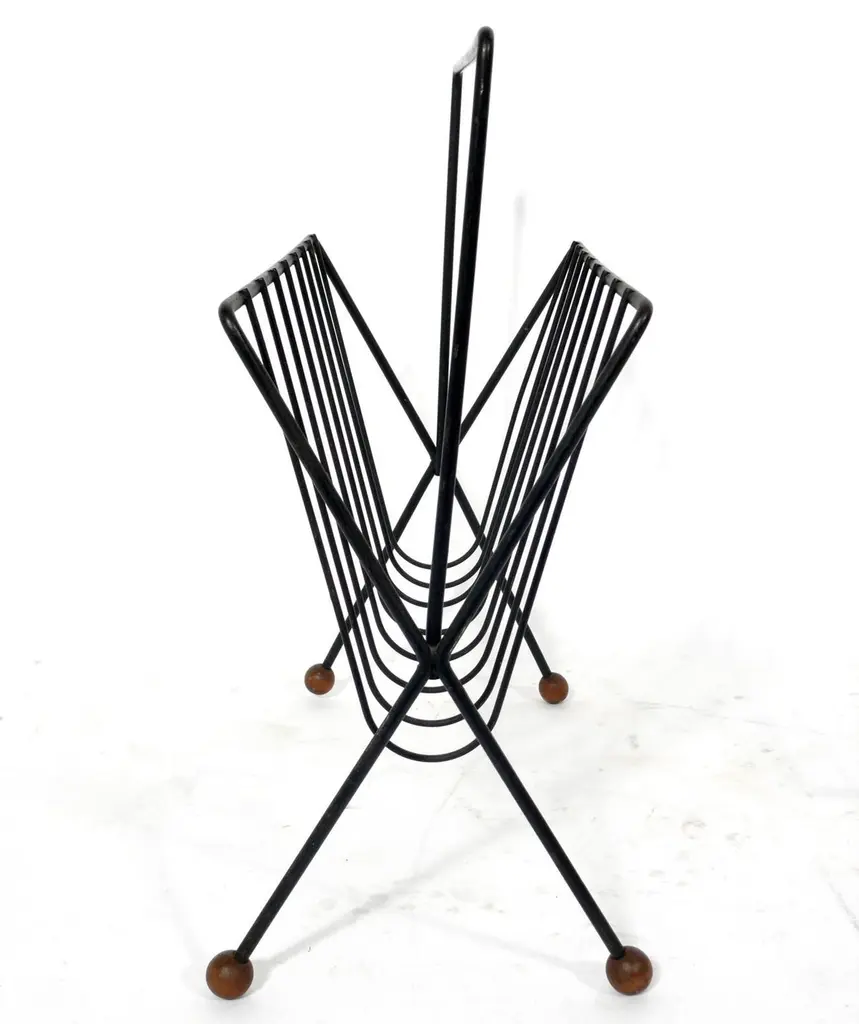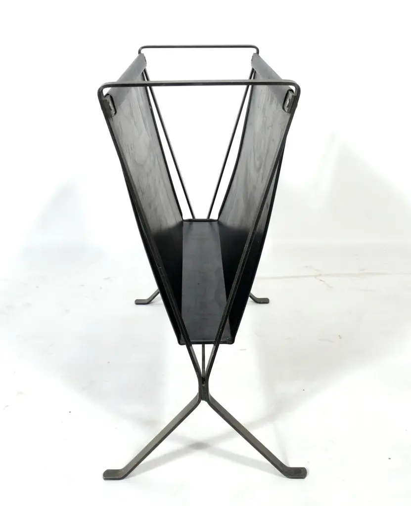 Selection of Mid-Century Modern magazine racks, circa 1950s. They are:1) Sculptural iron magazine rack, designed by Tony Paul, seen at the left. It measures 20.25" H x 8.25" D. 2) Sculptural iron magazine rack, seen at the center. It measures 20" H, 16" H x 18" W.3) Metal Mid-Century Modern magazine rack, made in England, seen at the right.They are priced at $550 each.