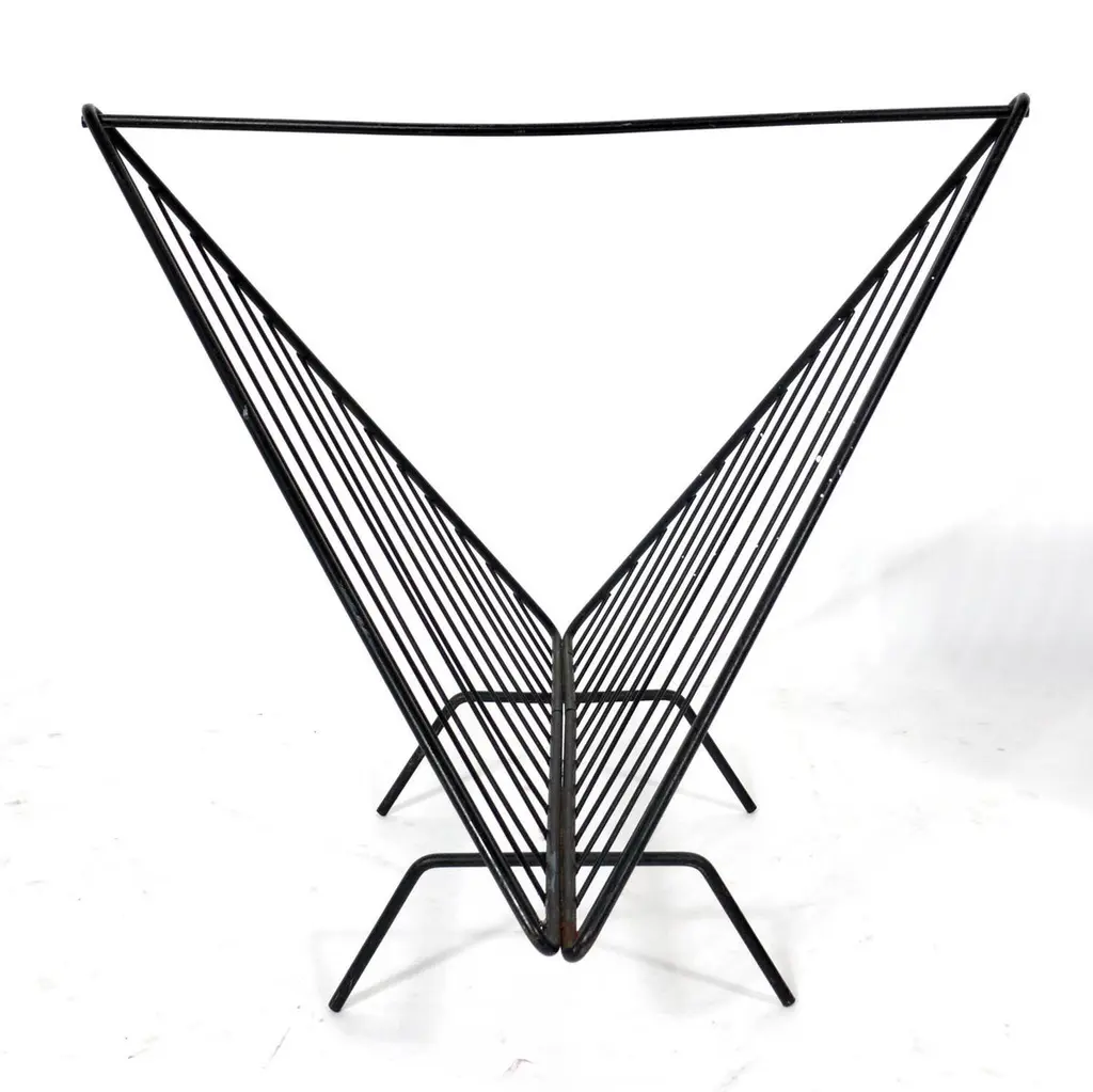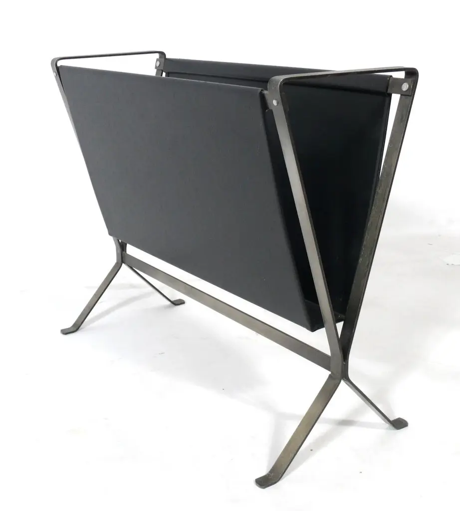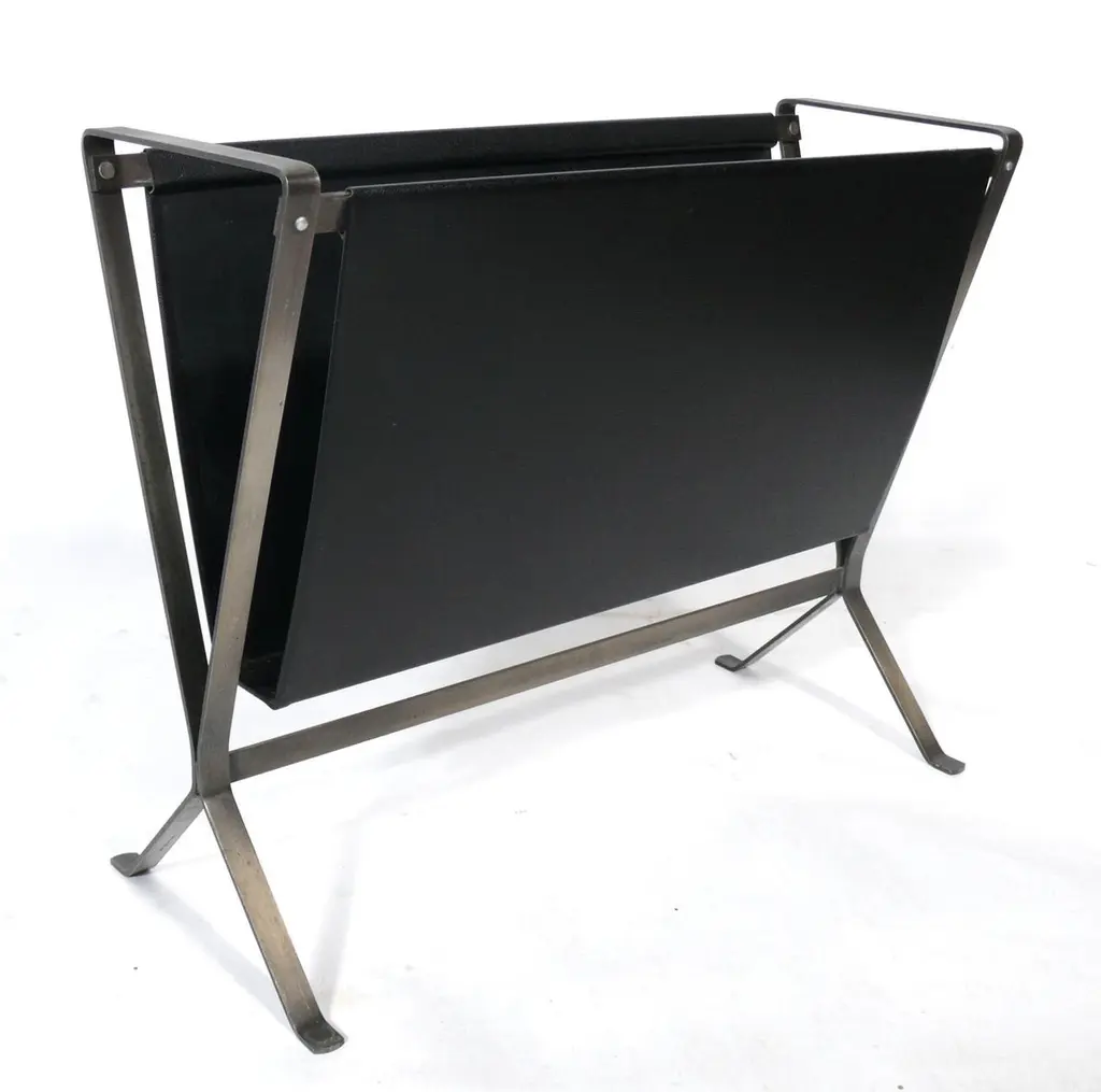Selection of Mid-Century Modern magazine racks, circa 1950s. They are:1) Sculptural iron magazine rack, designed by Tony Paul, seen at the left. It measures 20.25" H x 8.25" D. 2) Sculptural iron magazine rack, seen at the center. It measures 20" H, 16" H x 18" W.3) Metal Mid-Century Modern magazine rack, made in England, seen at the right.They are priced at $550 each.