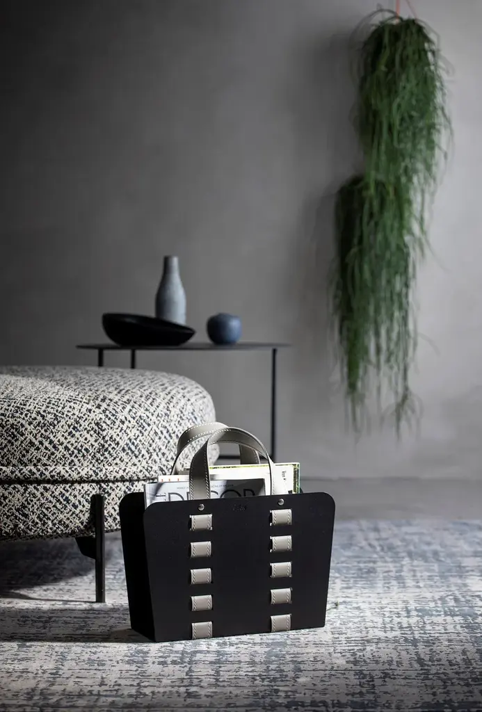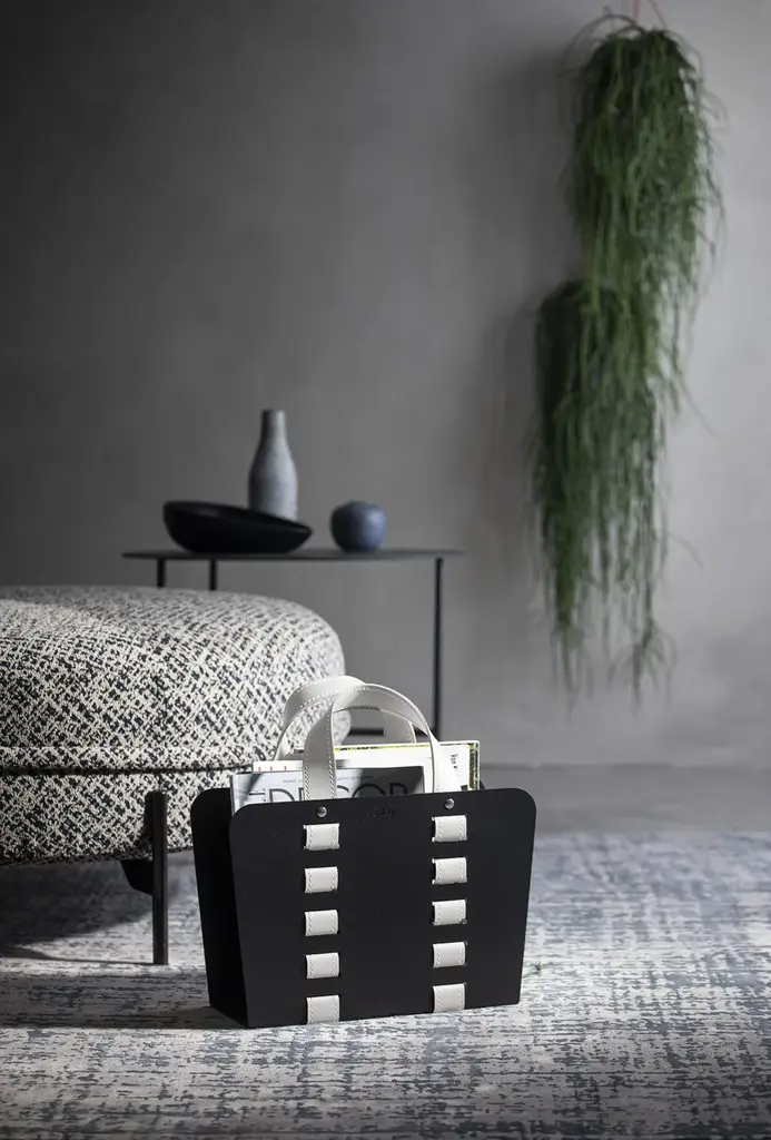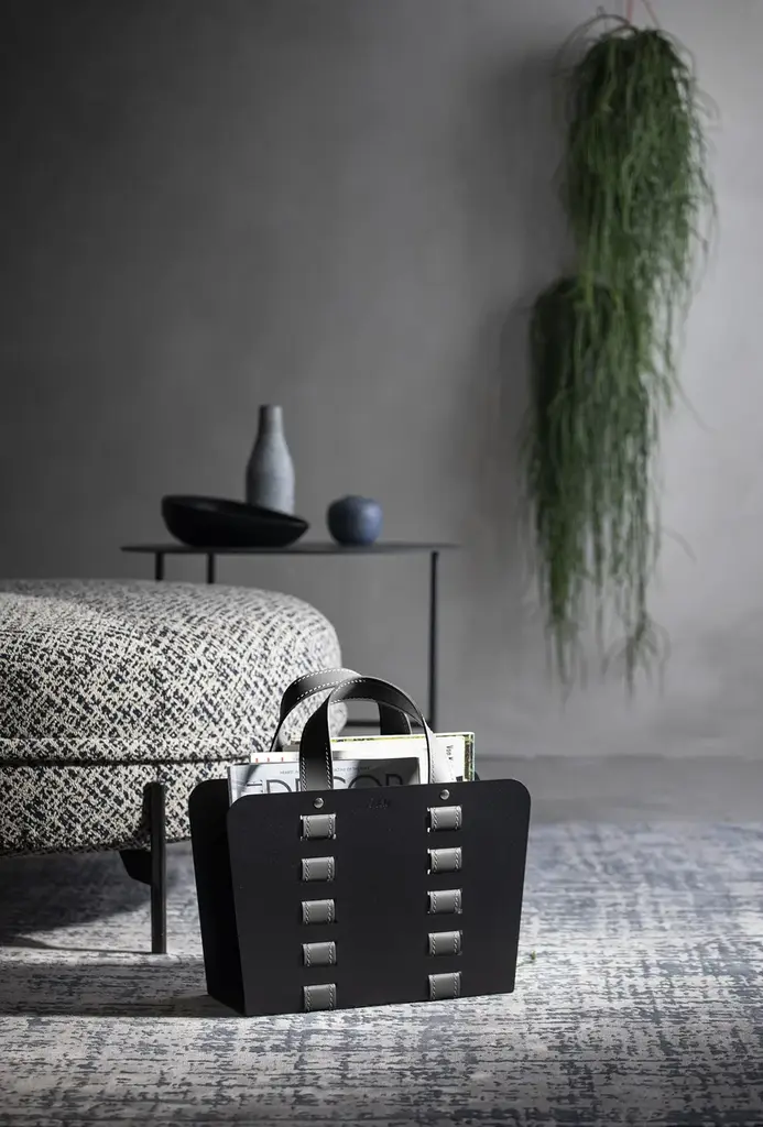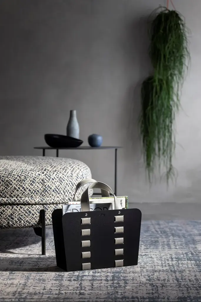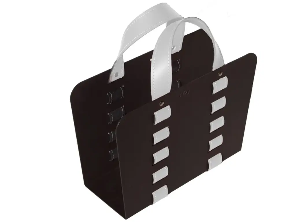L-Bag is a magazine rack made of steel with regenerated leather inserts, complite with silicone feet.