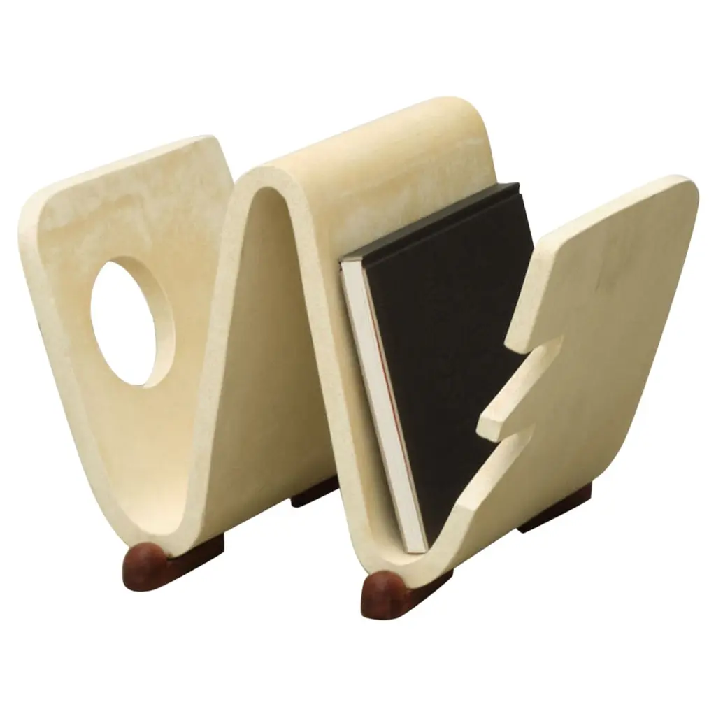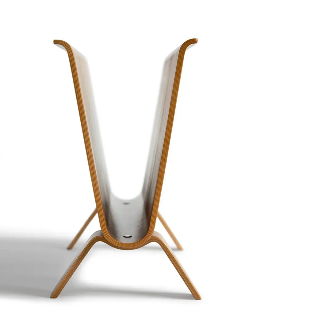 Made of plywood, this magazine rack balances flexibility and strength in one sophisticated design. The rack gently curves at the base, feet, and exposed plywood edges, and the overall shape bears the look of a cursive “v.” Finished with Ayous wood veneer, the design exudes a sense of mid-century warmth. Functional as well as beautiful, the rack provides for all of one’s light reading needs, holding magazines, newspapers, and paperbacks. An elegant addition to any home or office, the piece was designed by Saito Wood Company and made in Shizuoka, Japan.