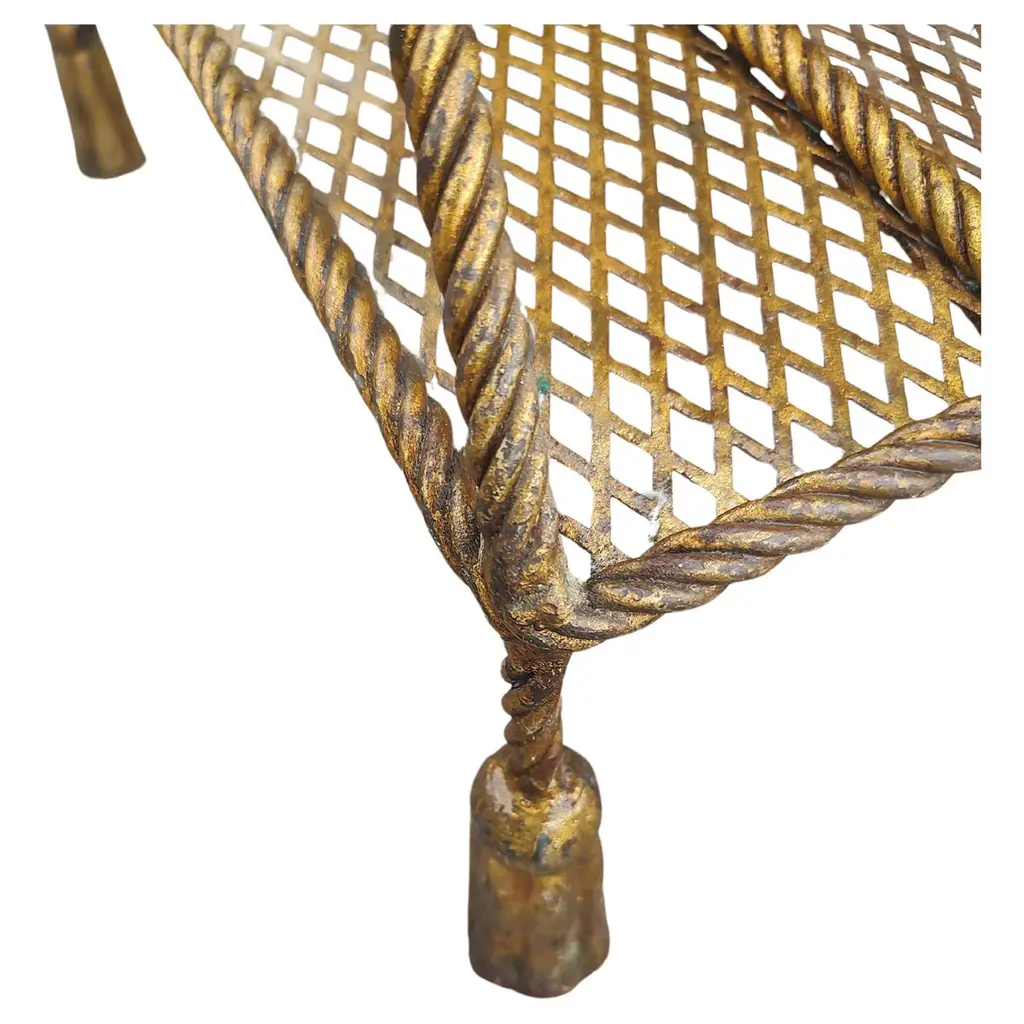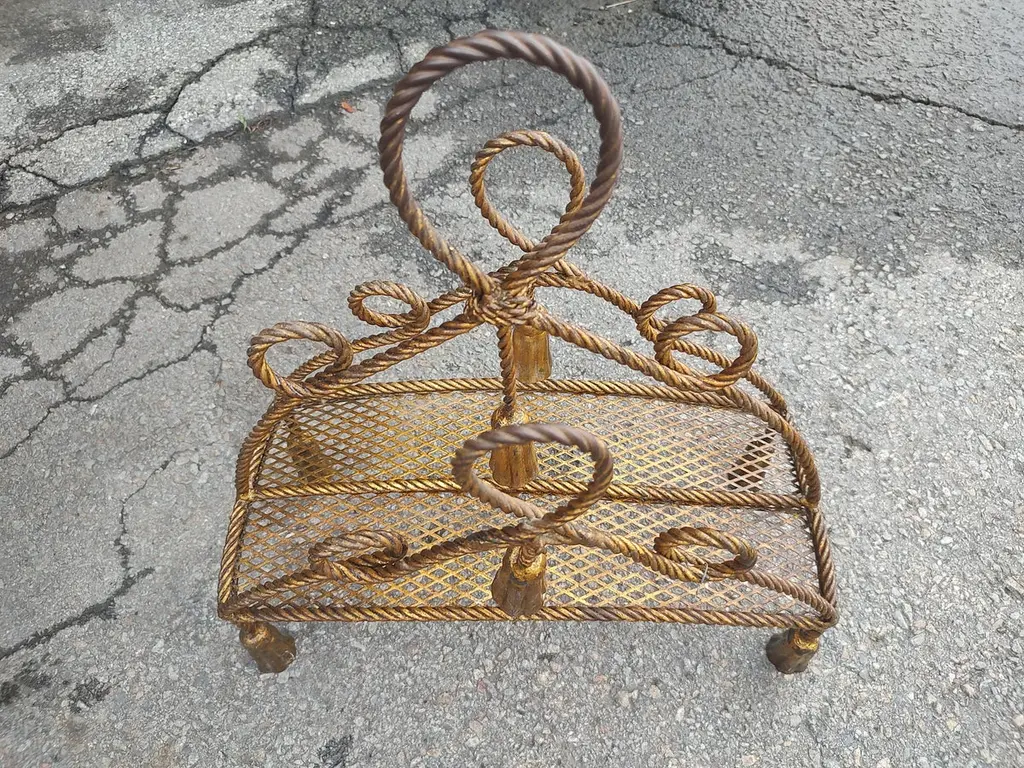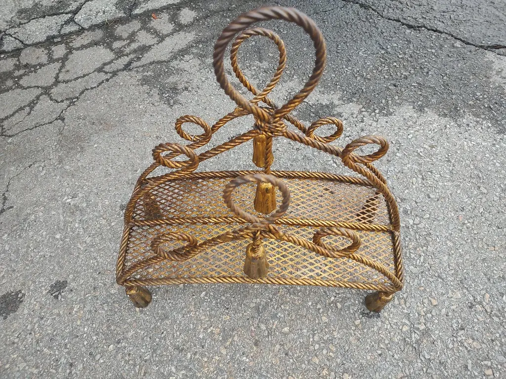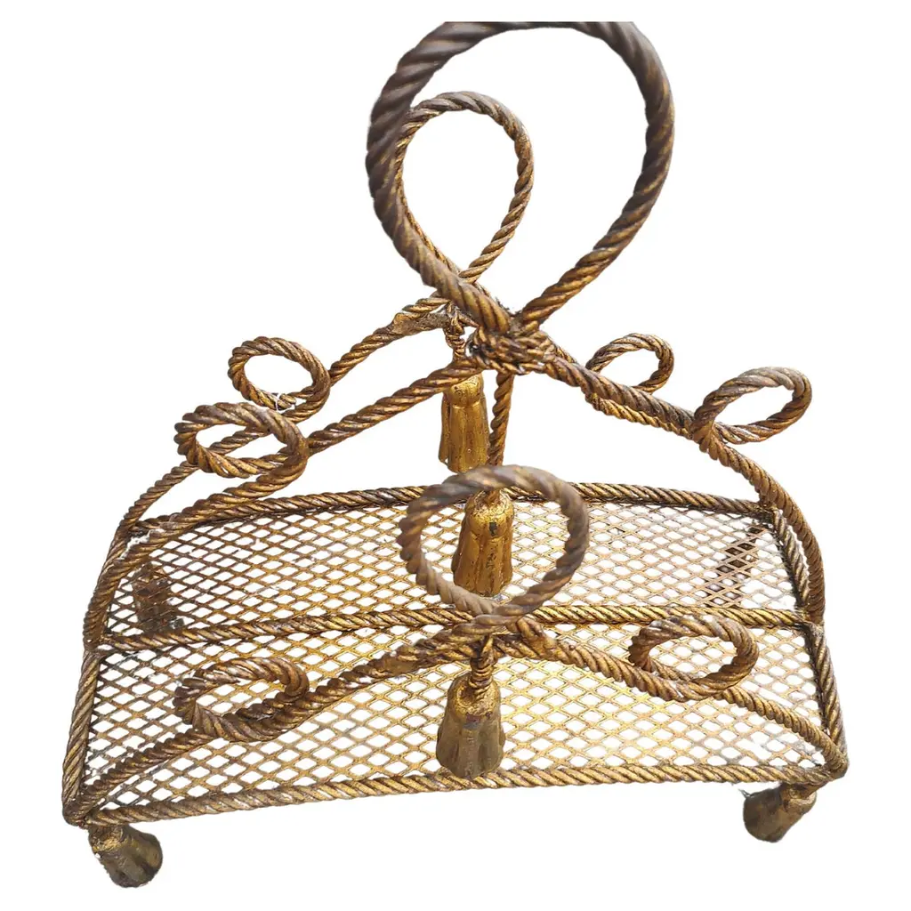 Fabulous pair of Gilt iron rope with tassels magazine racks holder from the mid fifties Italy. In excellent vintage condition with minimal wear to the Gilt. Some Gilt loss due to age related wear. One is a little darker than the other. Both excellent vintage condition. Priced and sold individually.
