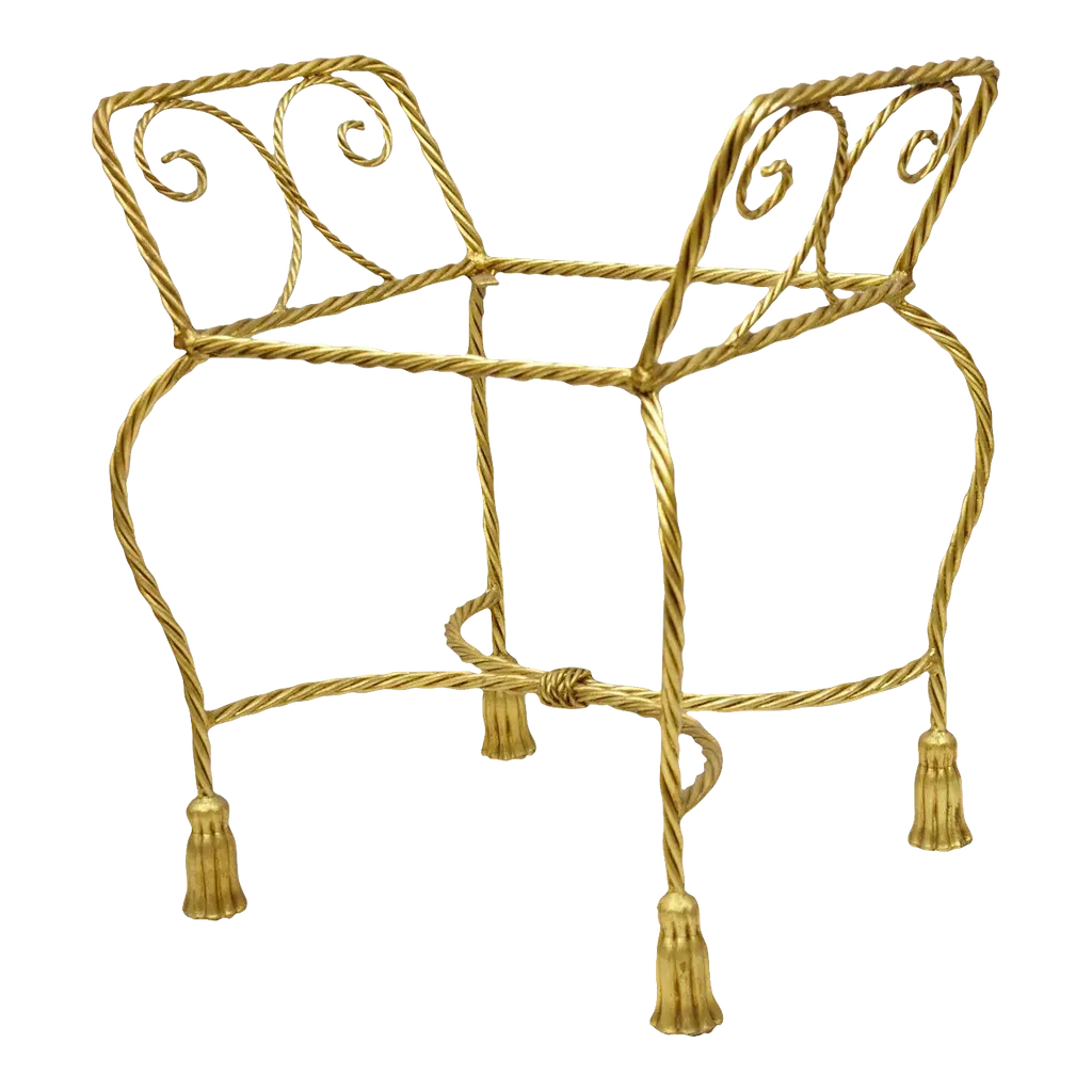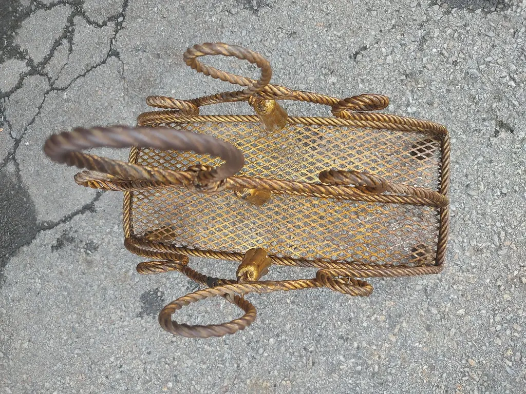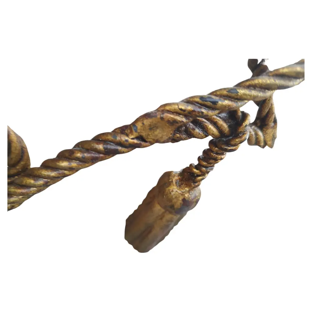 Fabulous pair of Gilt iron rope with tassels magazine racks holder from the mid fifties Italy. In excellent vintage condition with minimal wear to the Gilt. Some Gilt loss due to age related wear. One is a little darker than the other. Both excellent vintage condition. Priced and sold individually.