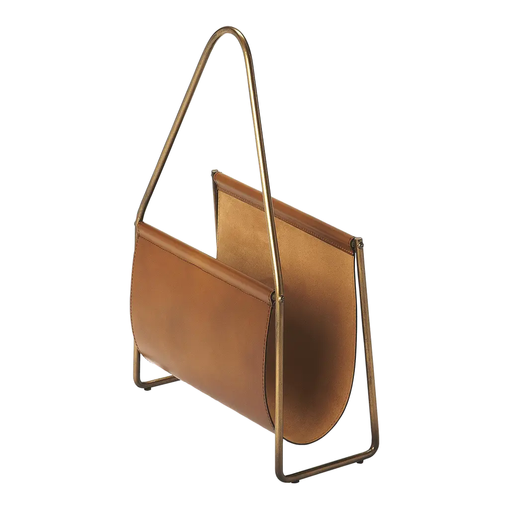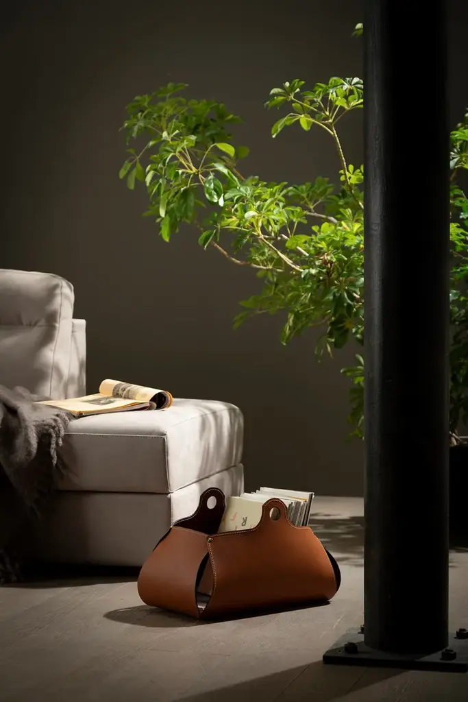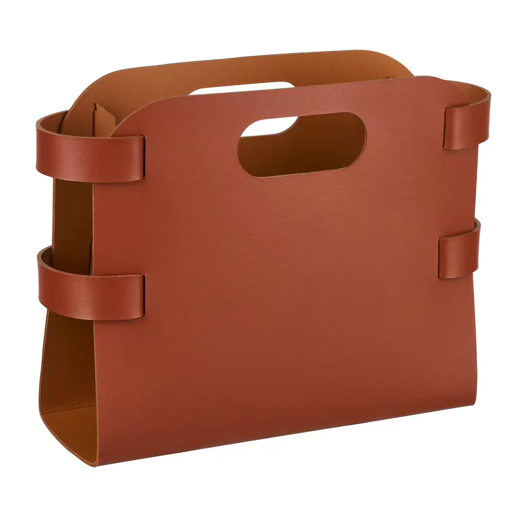 Design megazine rack of regenerated leather, in and outside, with lateral handles.