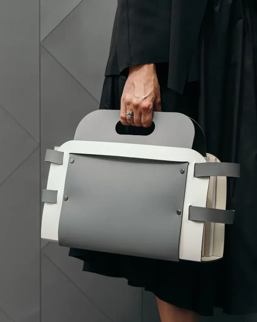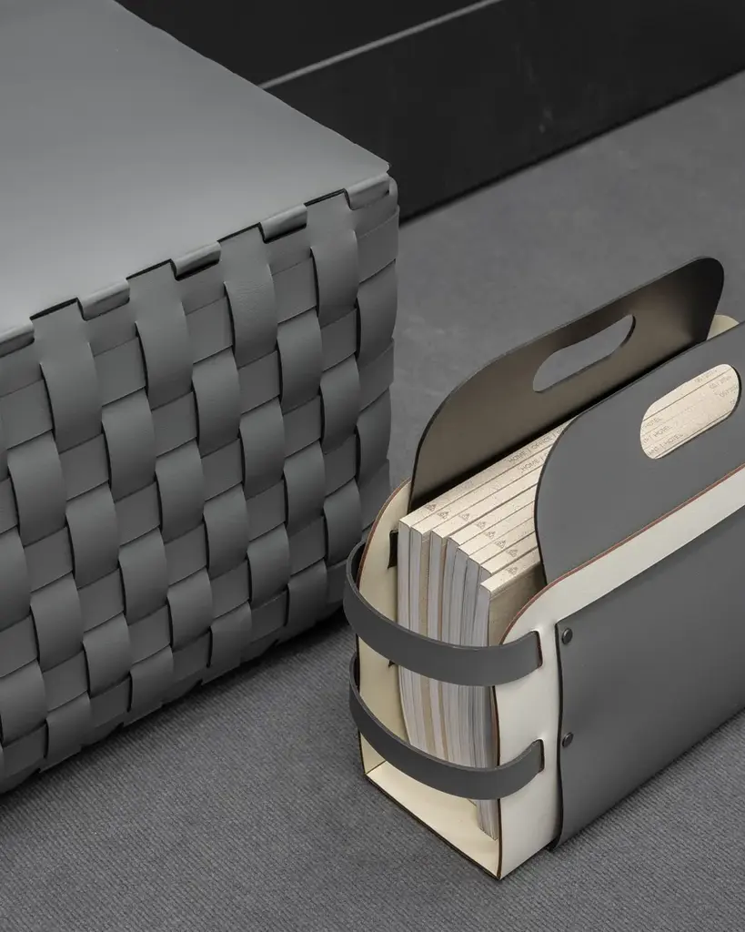 With the distinctive shape of a business handbag and a compact format, this black magazine holder is designed for elegant press storage. Made with two layers of leather, it ensures extra stability while maintaining a refined and functional look.Customizable on request with two exterior colors of your choice.