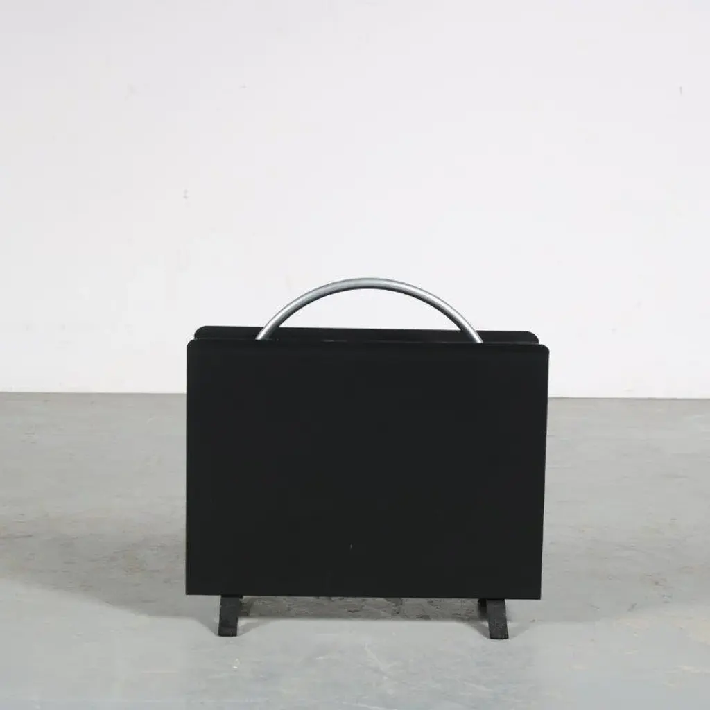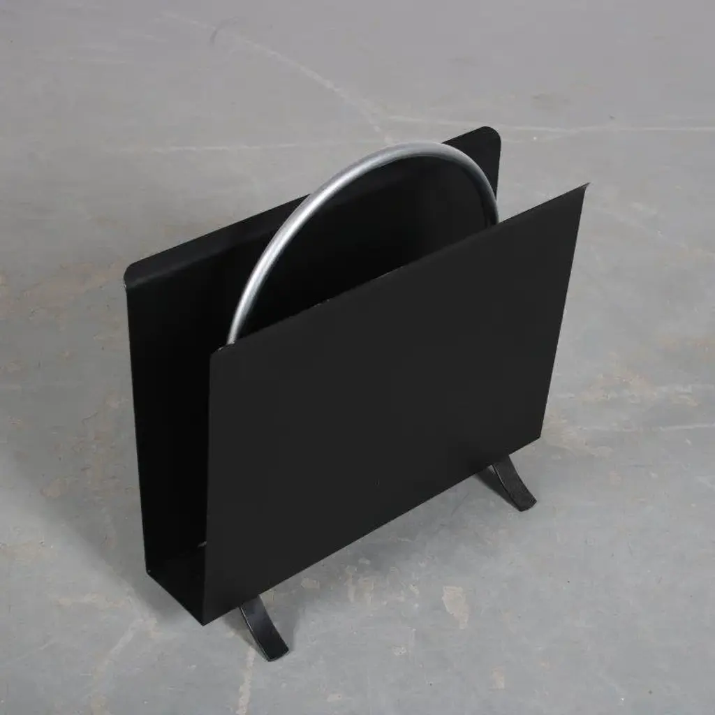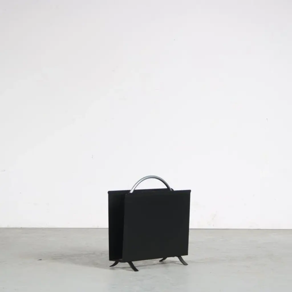 A lovely magazine rack designed by w.h. Gispen around 1950, recent production by dutch originals from the netherlands. the piece has a minimalist, modern design. Black lacquered metal sheet on metal legs with a nice chrome plated bent metal handle. It has a style that makes it fitting for many different kinds of decors. A lovely and most recognizable find of dutch design! it remains in good vintage condition with minor wear consistent with age and use, preserving a beautiful patina. i have official proof of authenticity such as vintage catalogs, designer records, or other literature sources and take full responsibility for any authenticity issues arising from misattribution