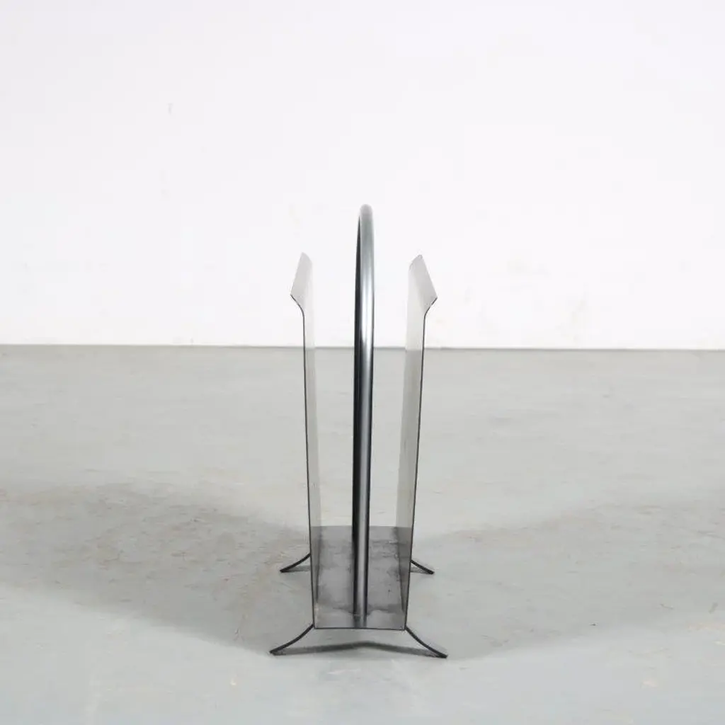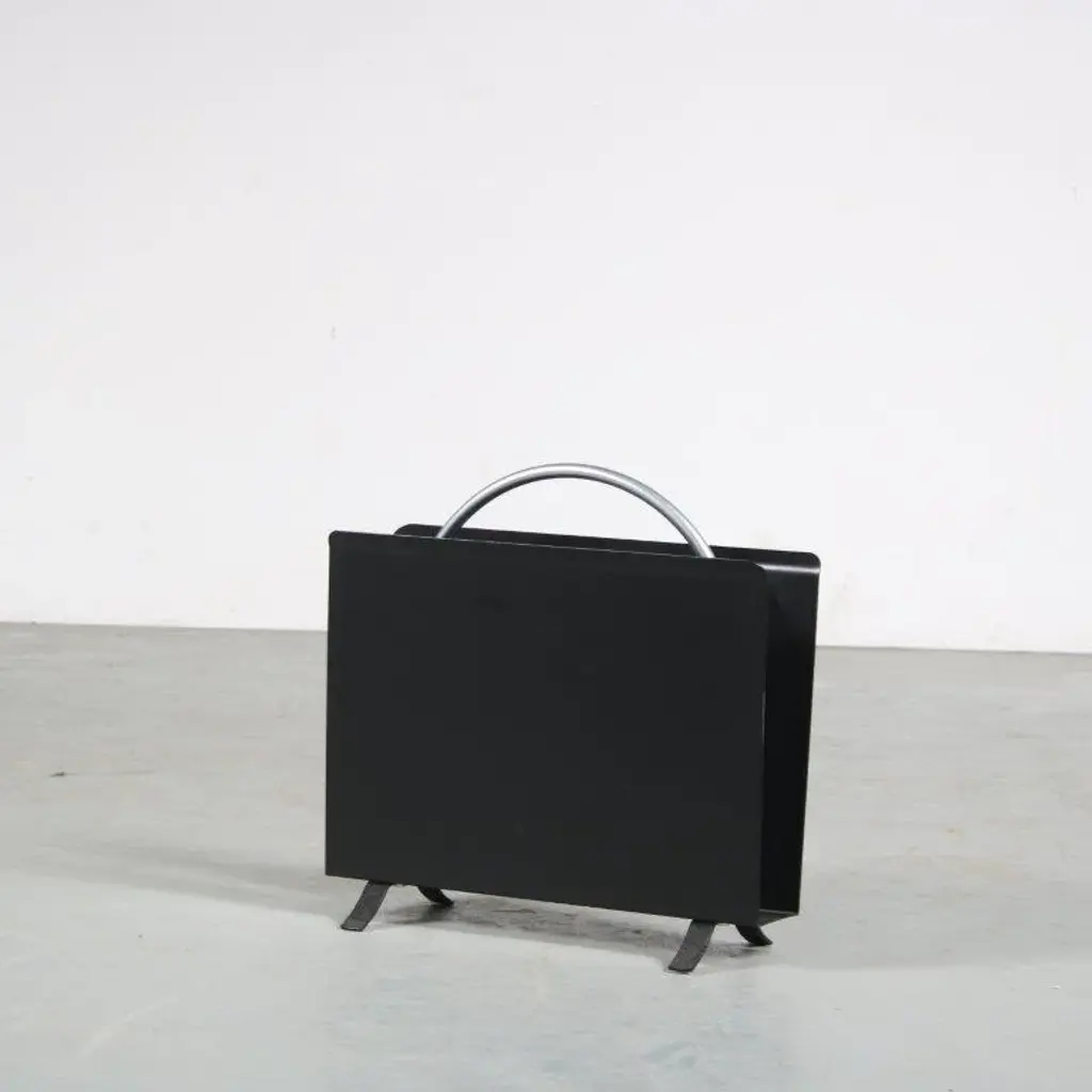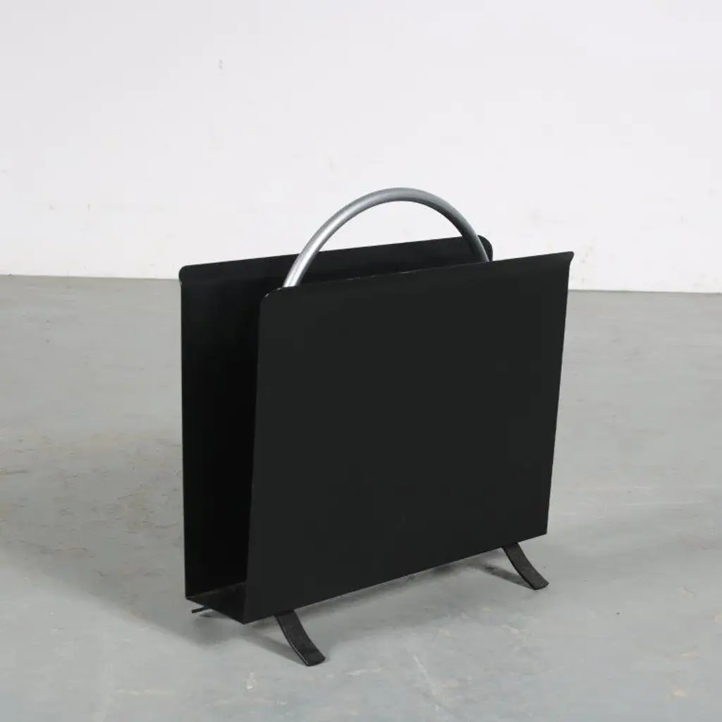 A lovely magazine rack designed by w.h. Gispen around 1950, recent production by dutch originals from the netherlands. the piece has a minimalist, modern design. Black lacquered metal sheet on metal legs with a nice chrome plated bent metal handle. It has a style that makes it fitting for many different kinds of decors. A lovely and most recognizable find of dutch design! it remains in good vintage condition with minor wear consistent with age and use, preserving a beautiful patina. i have official proof of authenticity such as vintage catalogs, designer records, or other literature sources and take full responsibility for any authenticity issues arising from misattribution
