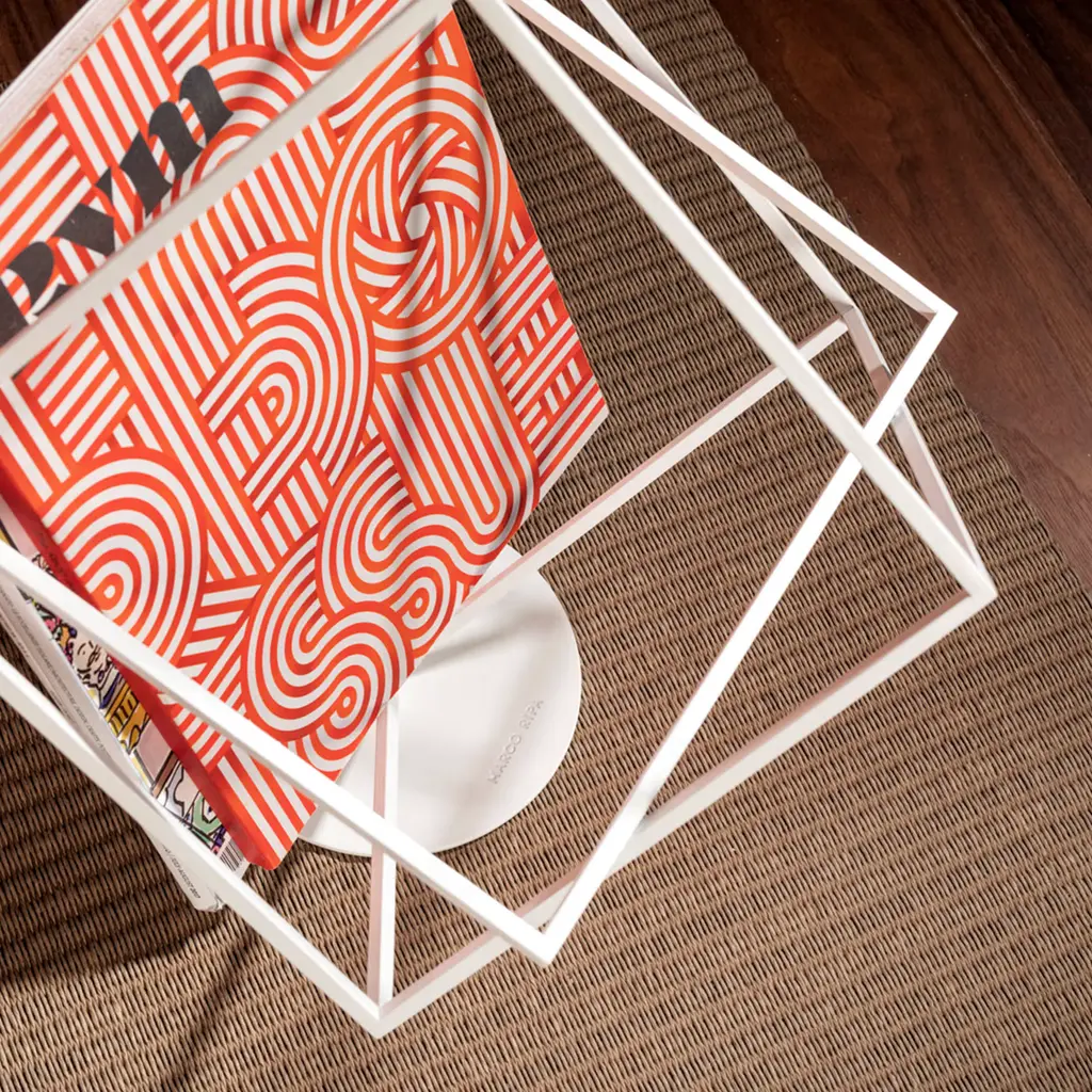 Inspired by modernist minimalism, this magazine rack explores geometric creativity with a hollow, cube-like frame. Marco Ripa’s design allows books and magazines to be arranged in original ways, transforming the piece into both a storage solution and an artistic statement. The sleek white iron construction is both sturdy and visually light, ideal for contemporary living spaces that crave a touch of refined structure.