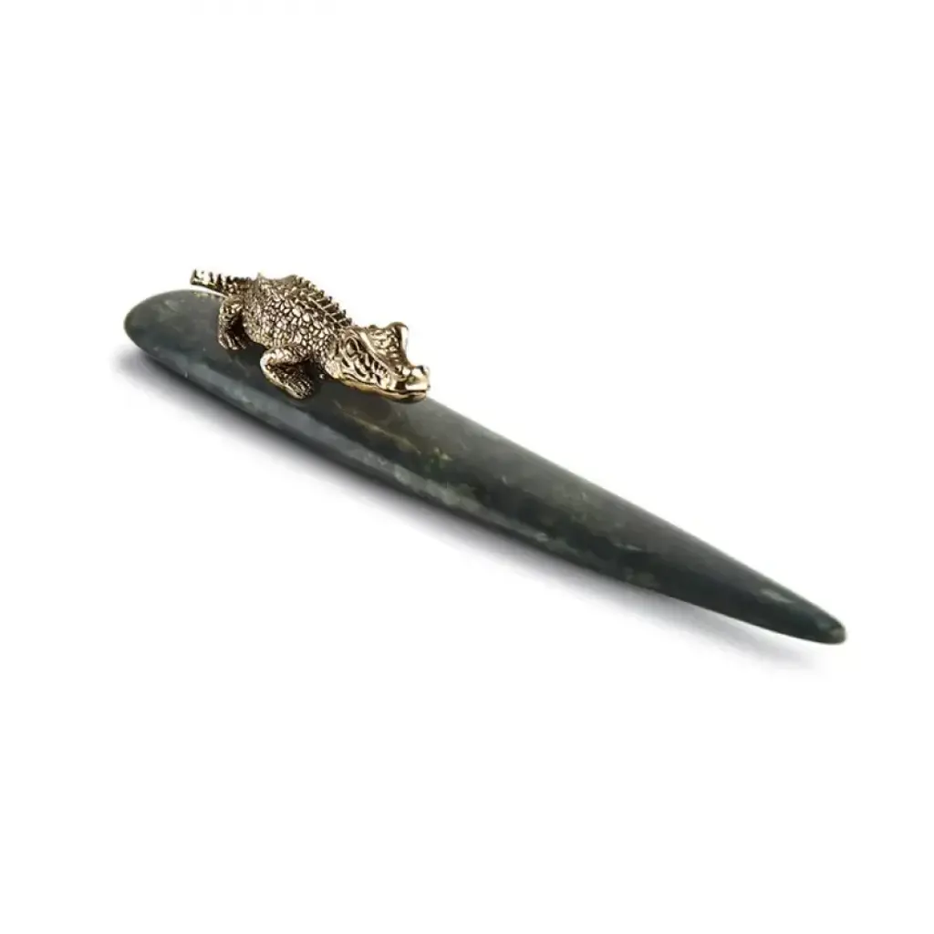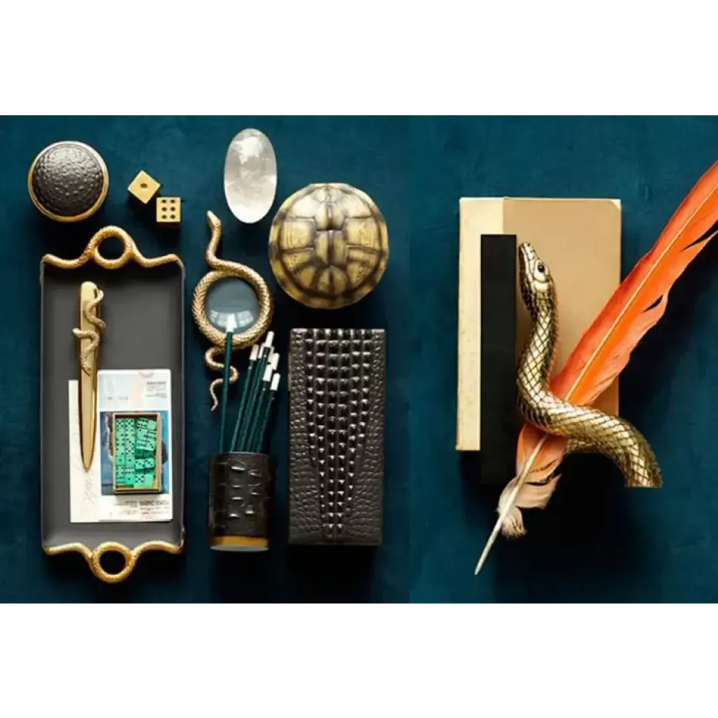 These Crocodile desk accessories from L'Objet are so stunning, they are almost like pieces of art. Each piece is meticulously handcrafted from Fine porcelain, glazed in matte black, and detailed with 14 kt gold. Individually packaged in a beautiful box for storage or gift giving. Prior to founding L’Objet in 2004, Israeli-born Elad Yifrach was a successful designer in Beverly Hills. He was creating beautiful interiors, but he was frustrated by the limited options available in home accessories, so he set out to create something better. L’Objet’s collections are diverse, but they are almost always inspired by nature and architecture. Many of his exquisite serving pieces rest in a base of hand-crafted gold foliage, other pieces feature intricate design and beadwork, and some of the most striking objects actually look like miniature buildings. And despite the lux feel, much of the line is practical with just a touch of whimsy.