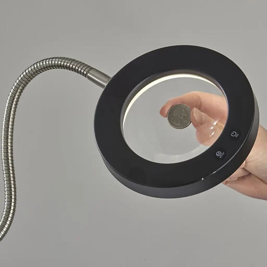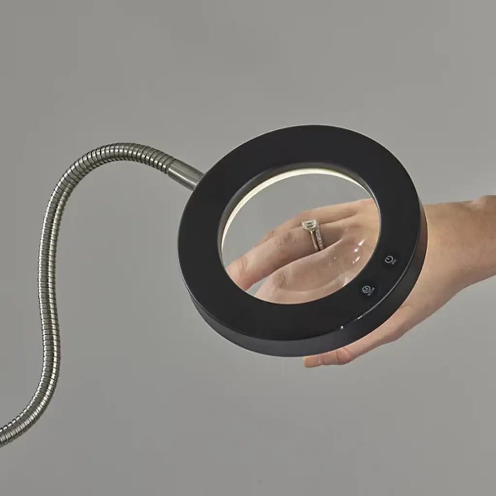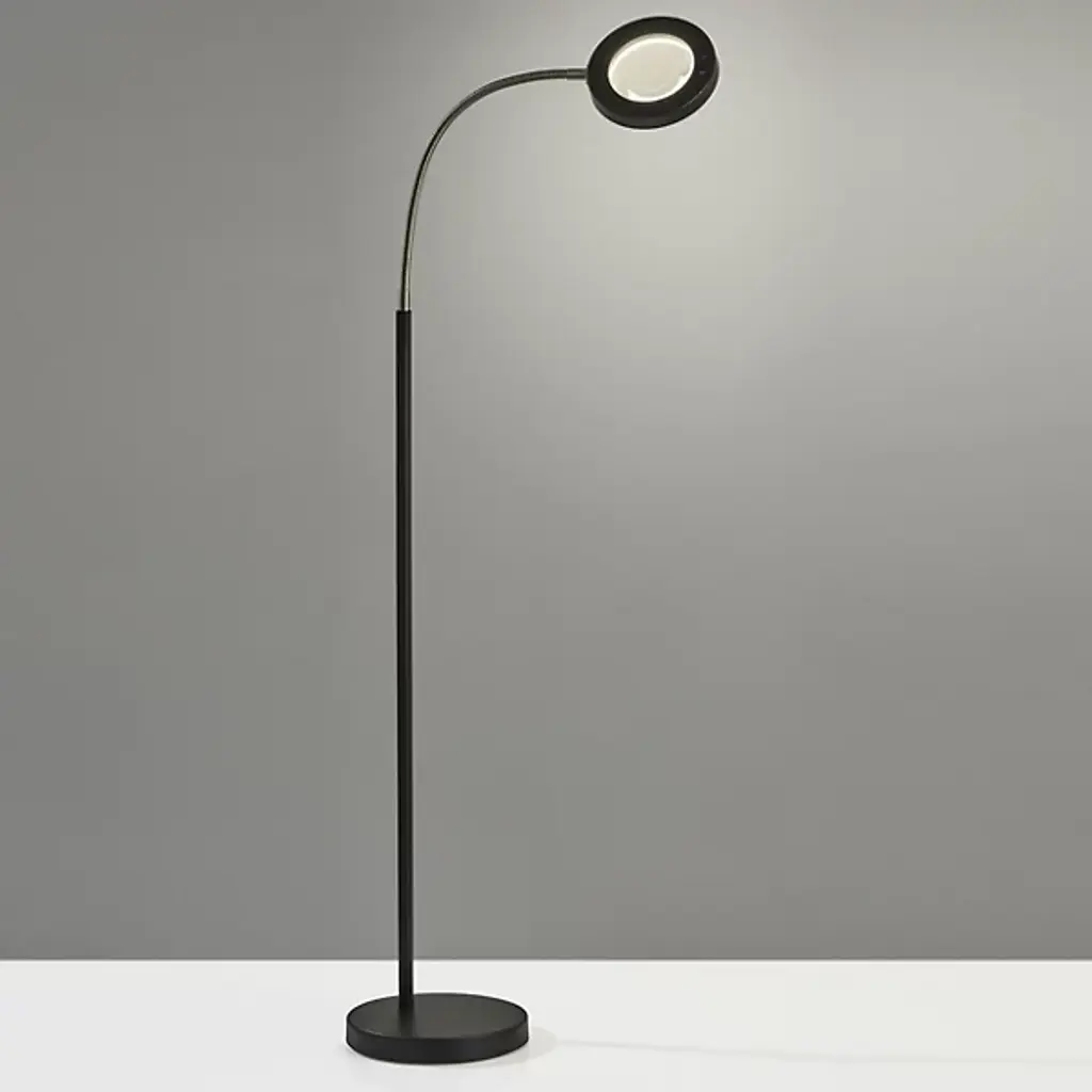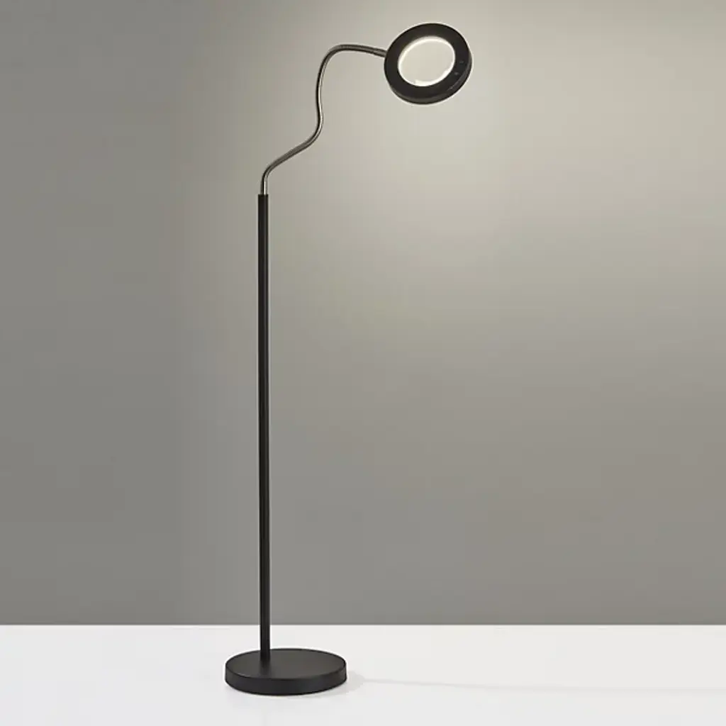 The Holmes LED Magnifier Floor Lamp with Smart Switch from Adesso satisfies in places of work or relaxation as a high-style and versatile lighting option. It features a ring lamp head fitted with an efficient LED array and a 3x magnifier. Underneath this lamp head, one finds a smart touch switch that offers easy adjusting to 3 separate color temperatures and dimming settings. A flexed arm connects the lamp head to the column in a fluid shape that bends to place light where needed. This arm can be positioned vertically for a tall figure. It anchors to a handsome base. This piece is great next to a lounge chair or desk.
