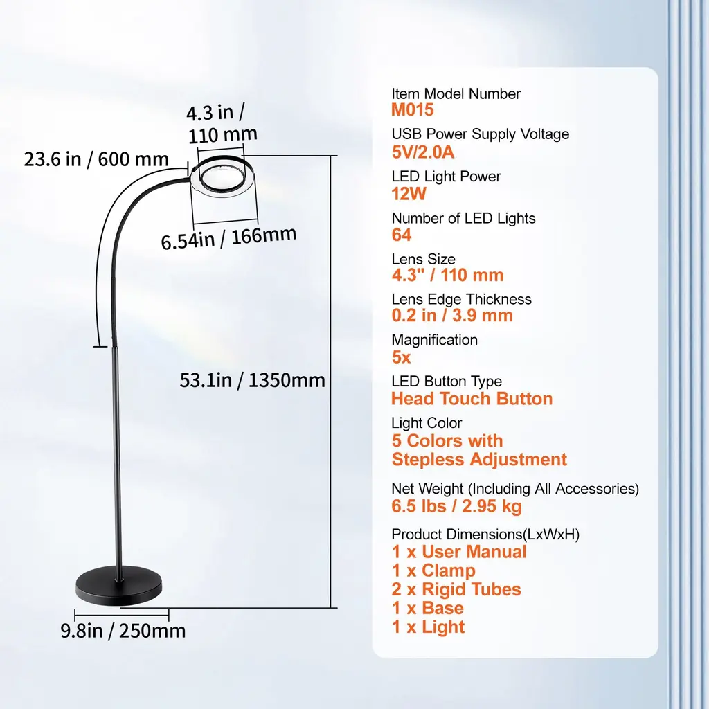 500% HD True Glass Lens: The distortion-free 4.3-inch high-definition lens allows you to see every detail clearly. Whether you're doing intricate work, reading small text, or conducting professional inspections, this magnifying floor lamp provides an exceptional visual experience. 5-Color Stepless Dimming: Our standing magnifying glass with light allows you to freely adjust the color temperature and brightness according to different environments and needs, helping you easily create your ideal lighting atmosphere. The light emitted is uniform and gentle, flicker-free, glare-free, and without blue light, ensuring a comfortable visual environment. Top One-Touch Control: The upgraded top touch control makes setting your desired mode directly on the lamp head easy. There is no need to bend down or fumble for the power switch. All settings can be easily adjusted with a simple touch. This floor magnifying glass with light is especially suitable for the elderly and visually impaired users. Flexible Support Arm: Say goodbye to limitations and enjoy the freedom of all-around lighting! The adjustable support arm design allows you to adjust the lamp to any angle, achieving illumination without dead spots. Whether in tight spaces or wide areas, the flexibility of the magnifying floor lamp with light meets all your lighting needs. 3-Level Height Adjustment: The support pole provides 3-level height adjustment with a versatile 3-in-1 design. This floor magnifier with light can be used as a desktop clamp lamp, converted into a high-mode floor lamp, or adjusted to a low-mode floor lamp. Whether for desktop tasks, standing work, or wide-area lighting, its flexible design adapts easily to your needs. Package Content 1 x Magnifying Floor Lamp 1 x User Manual 1 x Clamp 2 x Rigid Tubes 1 x Base 1 x Light