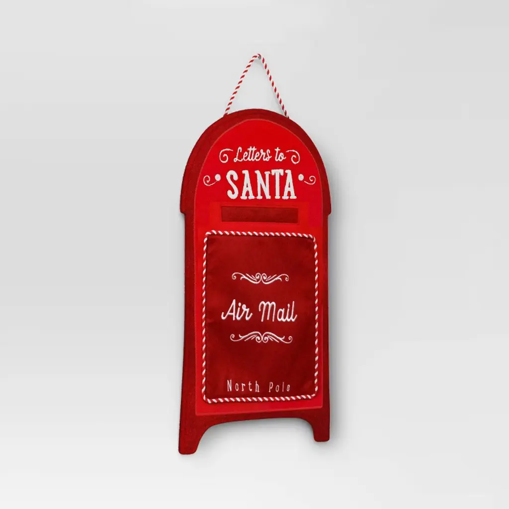 Add the classic magic of the North Pole to your festive decor with this 21-Inch Christmas Santa's Mailbox Wall Hanging Decor from Wondershop™. Made from fabric and felt, this wall hanging is designed to resemble a bright red mailbox with the white-lettered inscription "Letters To Santa Air Mail, North Pole." It features a candy cane-stripe trimmed patch pocket, designed to hold letters, holiday cards, wish lists, and sweet notes. Hang it by the entryway, in the hallway, near the Christmas tree, or near the mantel to create a magical mail stop for Santa.Welcome to the Wondershop™.