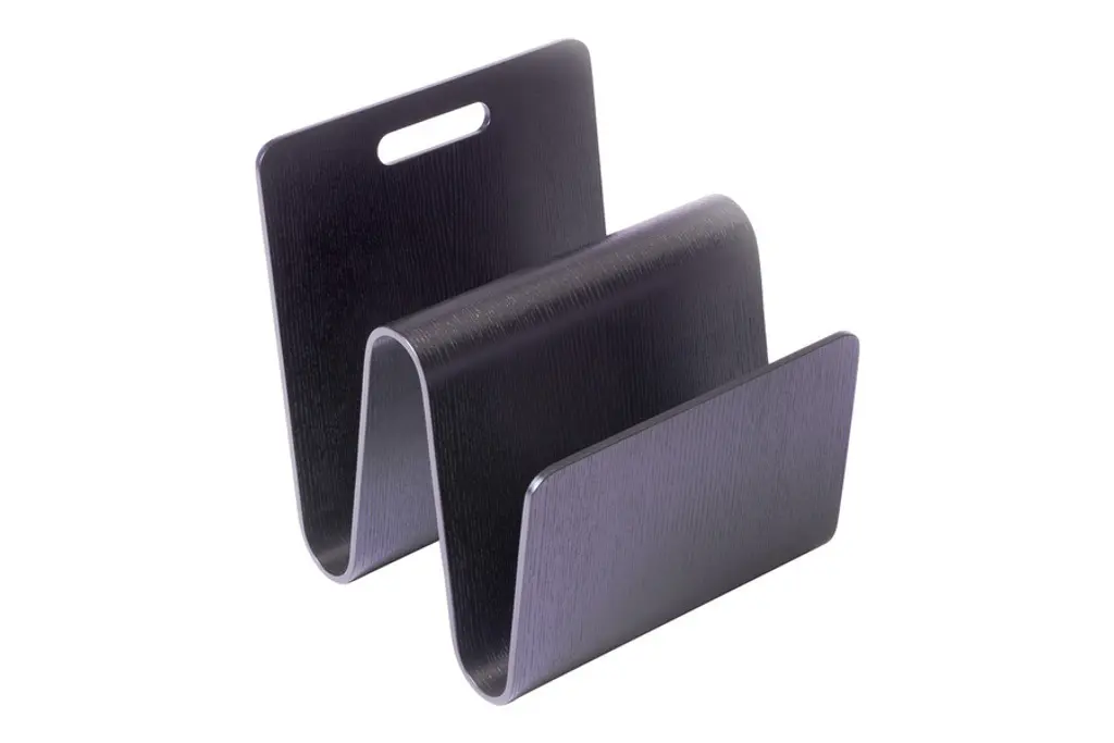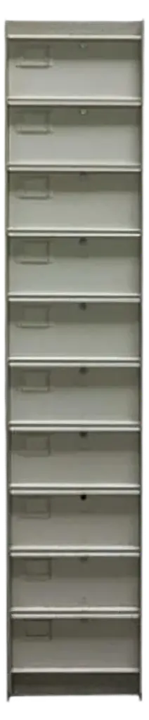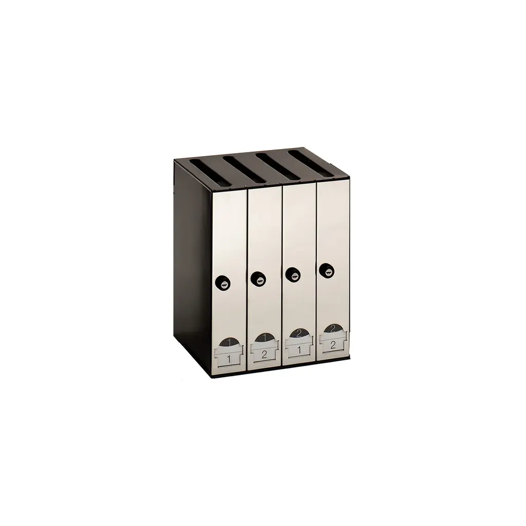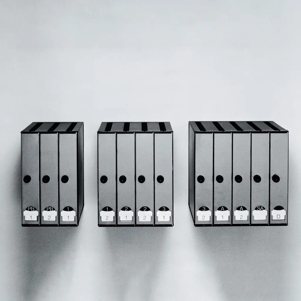 The 3-4-5 Mailbox Design features a tall, narrow, and deep structure, resembling books neatly aligned on a shelf. Constructed from black powder-coated steel sheets, it is paired with polished stainless steel doors that include transparent acrylic windows and white labeling cards for clear identification. Available in configurations of 3, 4, or 5 pigeonholes, it allows for adaptable installation by positioning multiple units against a wall. The design evolved from the 1975 'A Sardinel' concept, inspired by bricks in a wall or an encyclopedia on a shelf, forming a cohesive and orderly arrangement.