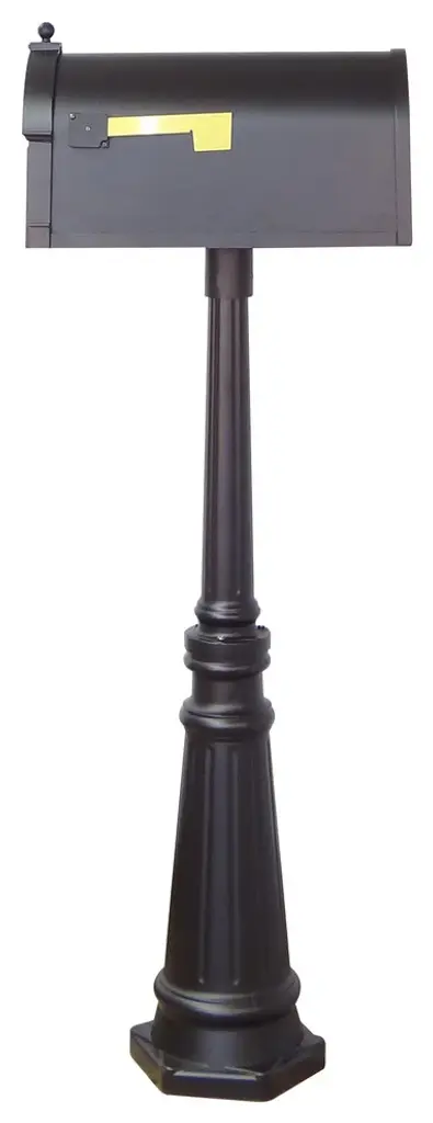 The Berkshire Curbside Mailbox presents an impressive face. The one piece cast aluminum door features deeply cut details with a rich, leather grain textured panel. The stainless steel spring hinge and magnetic catch will keep the door secure and the rust proof cast aluminum body construction creates a weather resistant mailbox. The Tacoma surface mount mailbox post is made of cast aluminum. Post dimensions are 42" H x 9" Dia. Base. A direct burial kit is included for easy installation into soil.