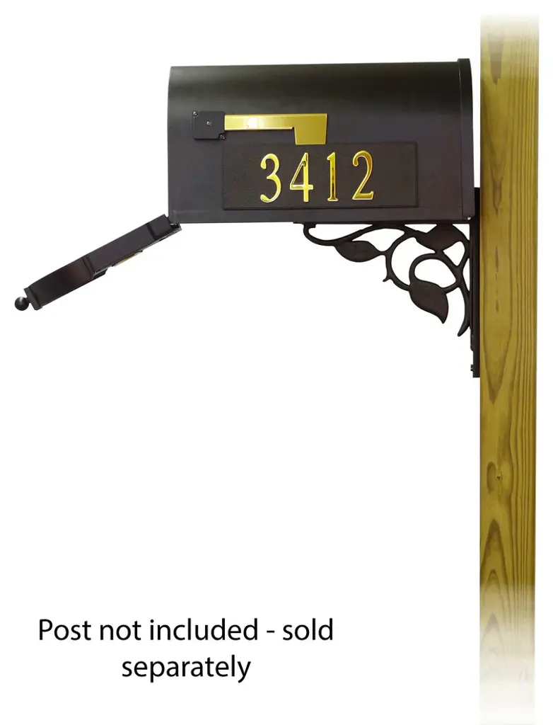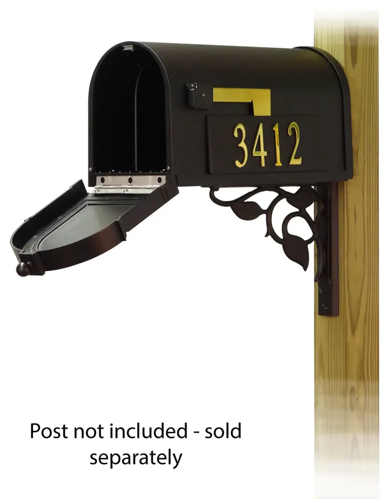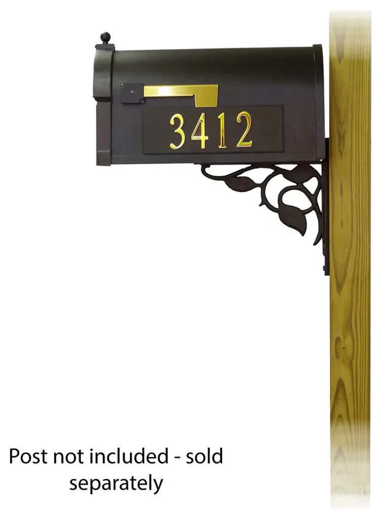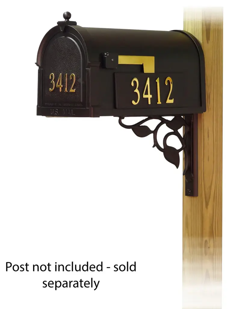 The Berkshire Mailbox and Floral mounting bracket combination presents a upscale alternative for the typical wood post curbside mailbox. The one piece cast aluminum door features deeply cut details with a rich, leather grain textured panel. The stainless steel spring hinge and magnetic catch will keep the door secure and the rust proof cast aluminum body construction creates a weather resistant mailbox. The Floral mounting bracket is a decorative cast aluminum bracket that will bring an elegant appearance to your mailbox. Mailbox and mailbox mounting bracket included. Also includes up to five 2 inch tall brass self adhesive front mount address numbers, side panels and 3 inch tall brass side mount address numbers. This set does NOT include a post as it is intended to be mounted on an existing wood post or solid surface, or a new wood post that can be purchased separately. Mounting hardware is included.