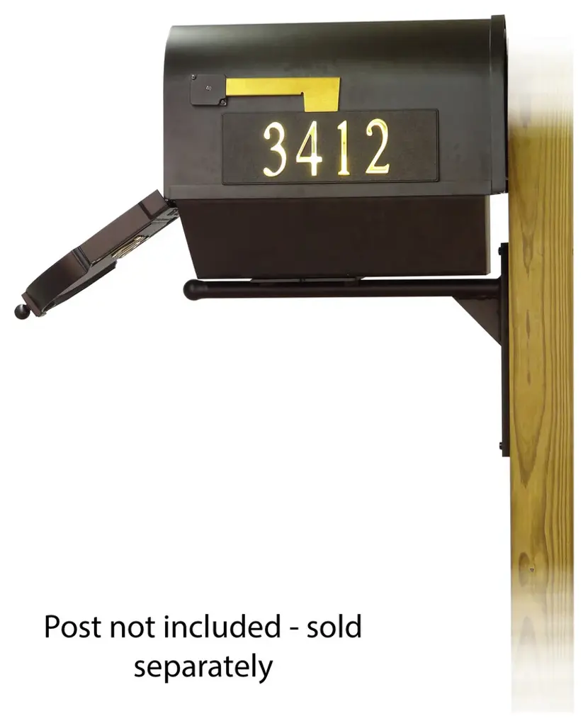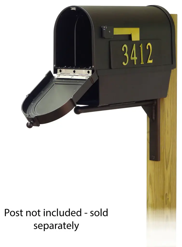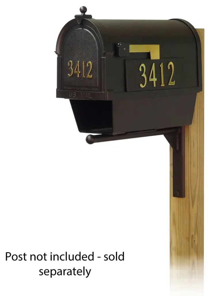 The Berkshire Mailbox and Ashley mounting bracket combination presents a upscale alternative for the typical wood post curbside mailbox. The one piece cast aluminum door features deeply cut details with a rich, leather grain textured panel. The stainless steel spring hinge and magnetic catch will keep the door secure and the rust proof cast aluminum body construction creates a weather resistant mailbox. The Ashley mounting bracket brings a simplistic, contemporary look to your mailbox. Newspaper tube, mailbox and mailbox mounting bracket included. Also includes up to five 2 inch tall brass self adhesive front mount address numbers, side panels and 3 inch tall brass side mount address numbers. This set does NOT include a post as it is intended to be mounted on an existing wood post or solid surface, or a new wood post that can be purchased separately. Mounting hardware is included.