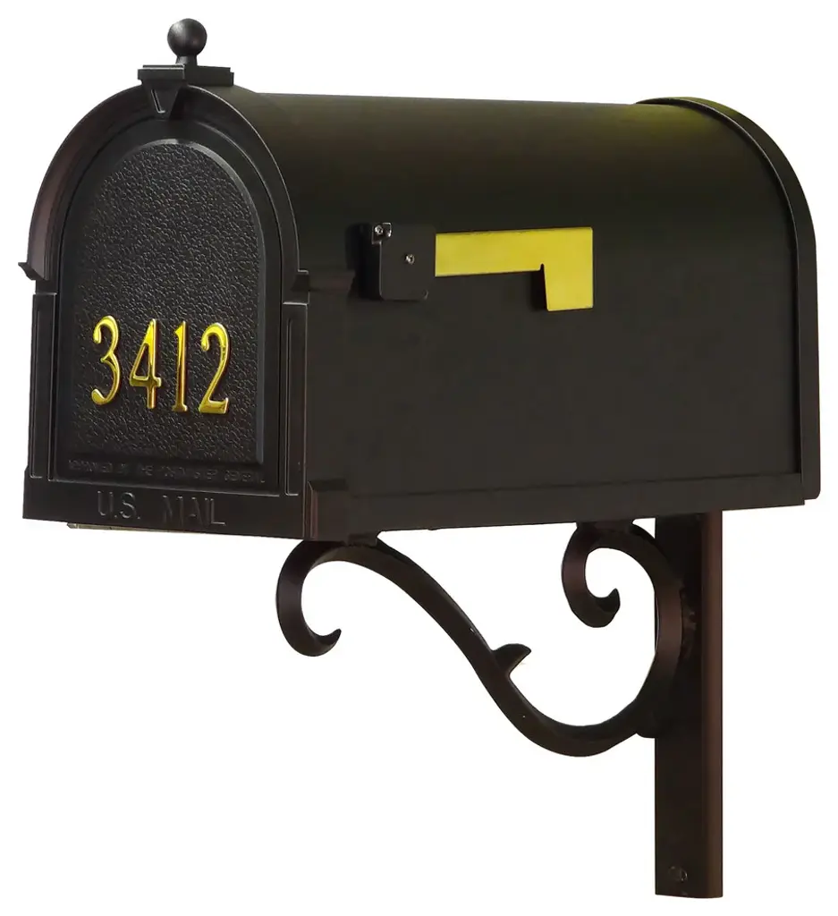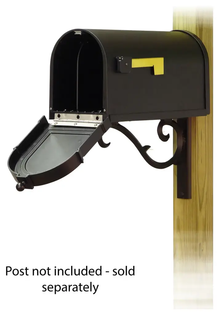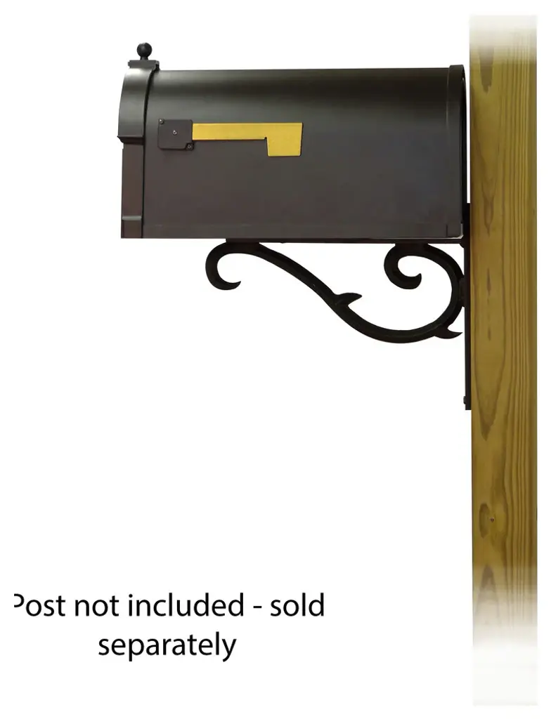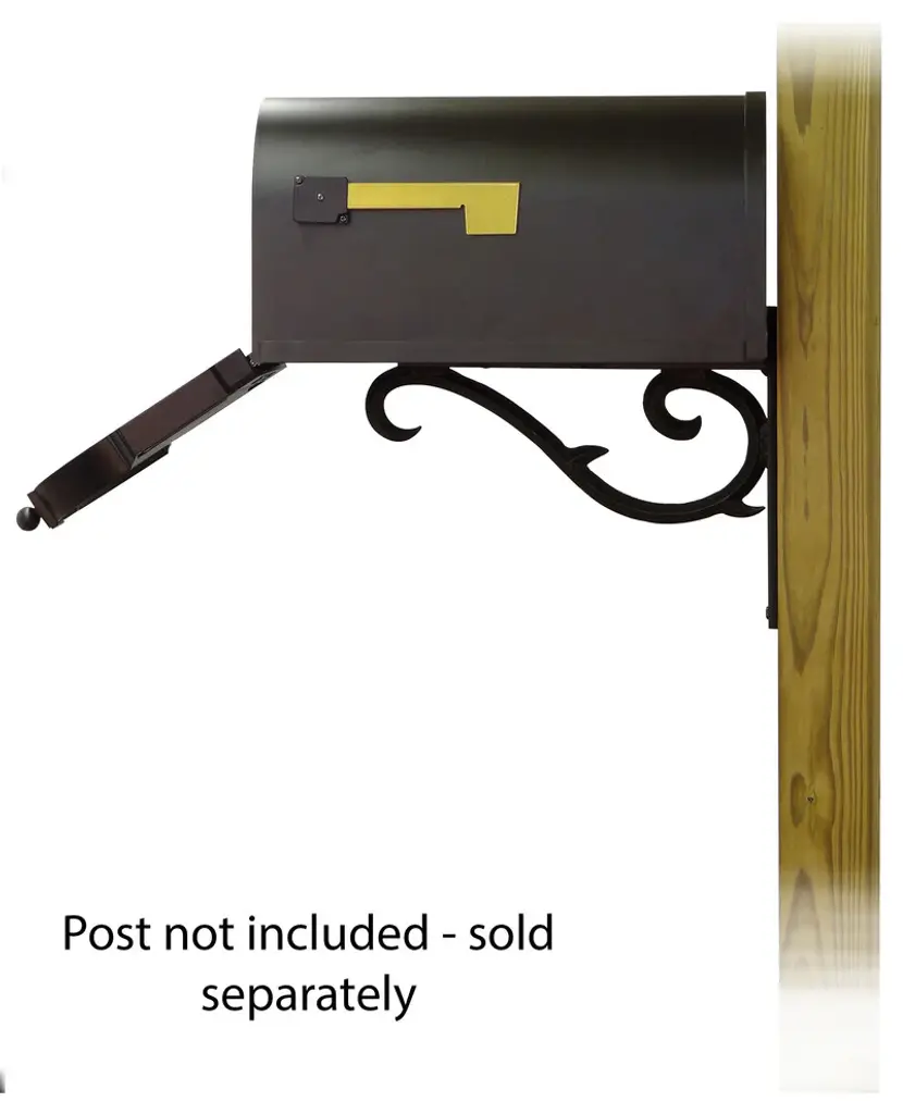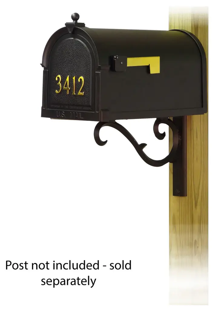 The Berkshire Mailbox and Sorrento mounting bracket combination presents a upscale alternative for the typical wood post curbside mailbox. The one piece cast aluminum door features deeply cut details with a rich, leather grain textured panel. The stainless steel spring hinge and magnetic catch will keep the door secure and the rust proof cast aluminum body construction creates a weather resistant mailbox. The Sorrento mounting bracket is an elegant cast aluminum scroll that will give a high class, decorative appearance to your mailbox. Mailbox and mailbox mounting bracket included. Also includes up to five 2 inch tall brass self adhesive address numbers. This set does NOT include a post as it is intended to be mounted on an existing wood post or solid surface, or a new wood post that can be purchased separately. Mounting hardware is included.