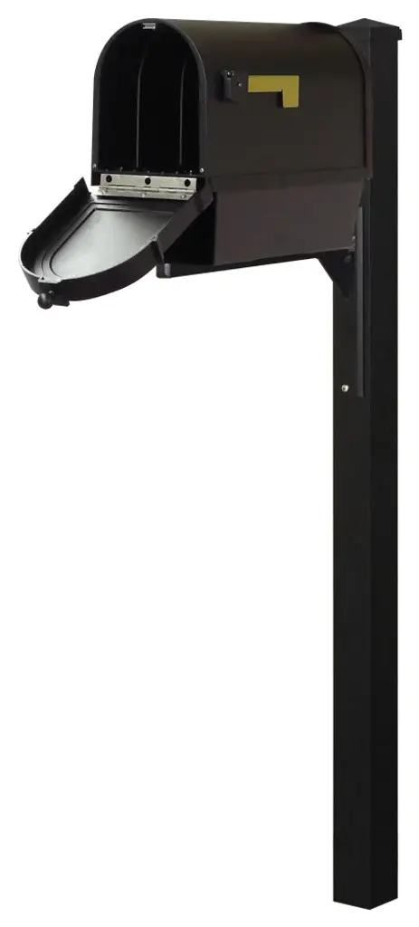 The Berkshire Curbside Mailbox presents an impressive face. The one piece cast aluminum door features deeply cut details with a rich, leather grain textured panel. The stainless steel spring hinge and magnetic catch will keep the door secure and the rust proof cast aluminum body construction creates a weather resistant mailbox. Newspaper tube is included.The traditional square mailbox post design with a decorative upgrade! Sturdy with clean lines theWellington post fits perfectly with any style of home architecture. Quick and easy direct burial will make assembly simple. No wood post needed! This is not a sleeve like many other companies use. This is a single 3" x 3" aluminum sturdy bodied post capped with a pyramid topper. The contemporary aluminummounting bracket easily attaches to the post. Made entirely of aluminum with stainless steel components to eliminate rusting. Direct burial installation is required.