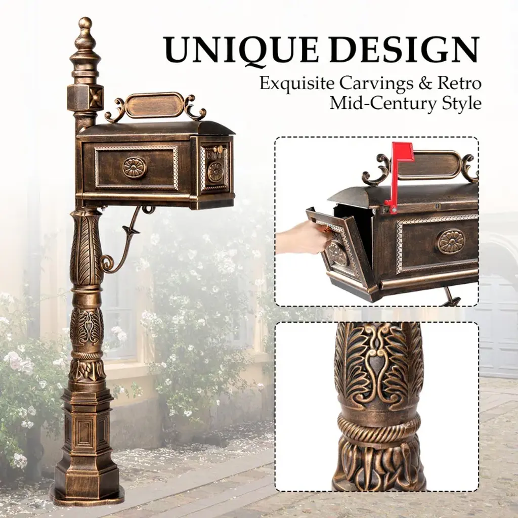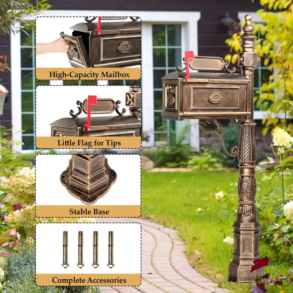 IntroductionThe classic cast aluminum mailbox is designed to offer an elegant and secure means to hold your mail. It offers a timeless design in unique finishes to complement any home, selected quality craftsmanship added strength and durability for years of enjoyment. Also, the cast aluminum pedestal mailbox is a charming and lavish way to keep your mail secured and solid construction can accommodate generous amount of incoming mail to withstand all four seasons.Please install the mailbox on the cement!The item comes in two boxes and may not arrive at the same time
