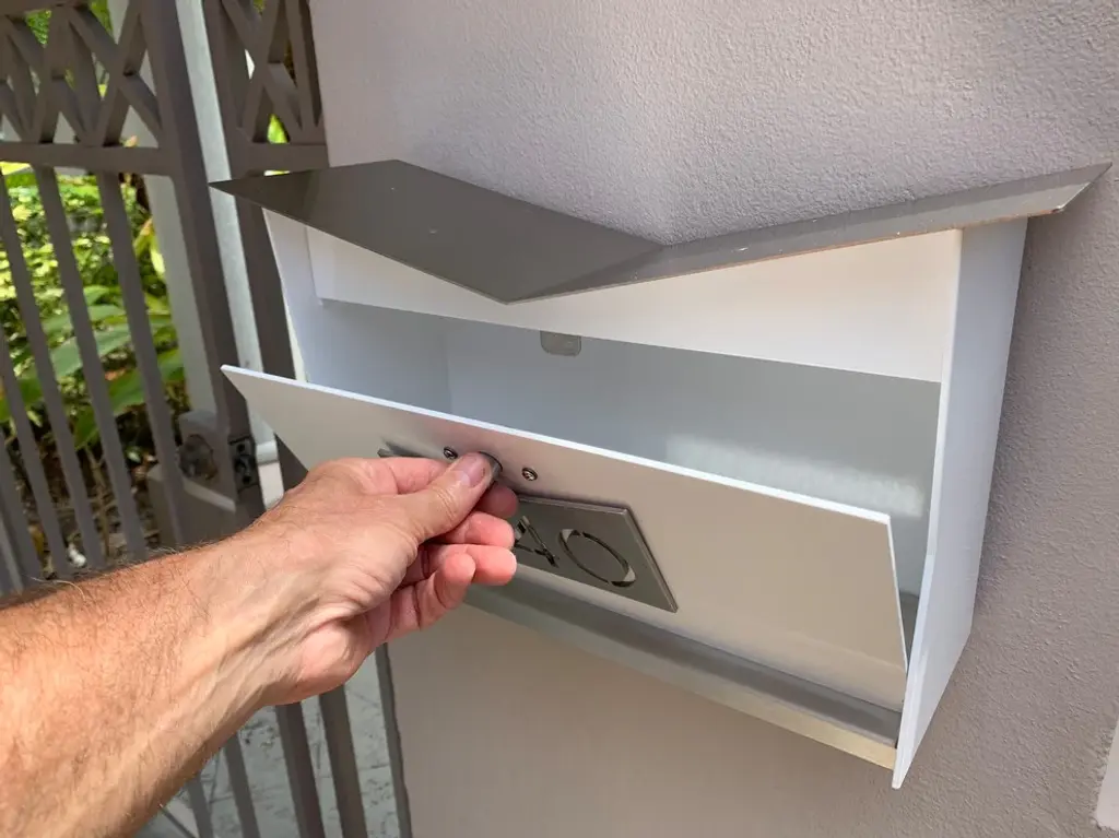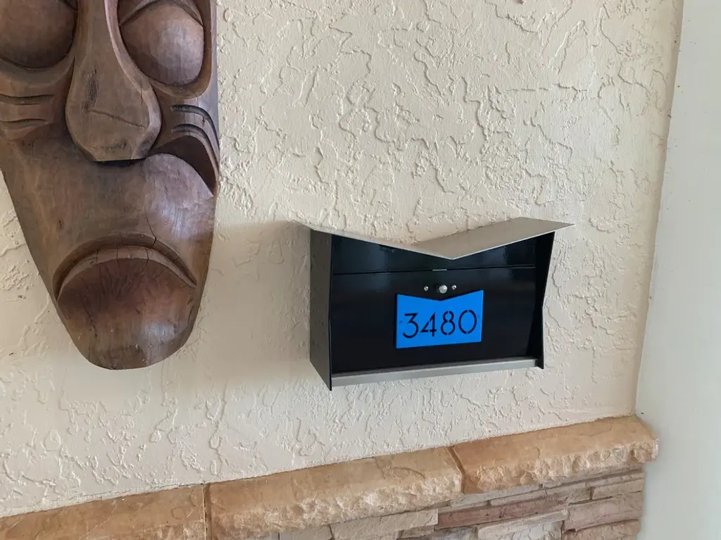 -The ButterFly Box is a Mid-century modern inspired wall mounted mailbox, the perfect curb appeal for your home, office, condo or development. Made of quality materials, here in the USA. -Give a little midcentury modern touch to any architectural style with the ButterFly Box.-Each ButterFly Box body is made out .125"? 5052-H32 aluminum, powder coated with marine grade paint with a laser anodized aluminum number plate. The base and "ButterFly" is made out of 16 gage #4 finish stainless steel. Each box has a custom laser cut address number plate.The mail Box is 15"? wide, 5-5/8"? deep and 10"?tallNote: Box should be installed in an area with an overhang. IMPORTANT, PLEASE REACH OUT TO THE SELLER WITH THE ADDRESS YOU WANT LASER CUT ON THE NUMBER PLATE WHEN CHECKING OUT.Ships in 1 to 2 weeks