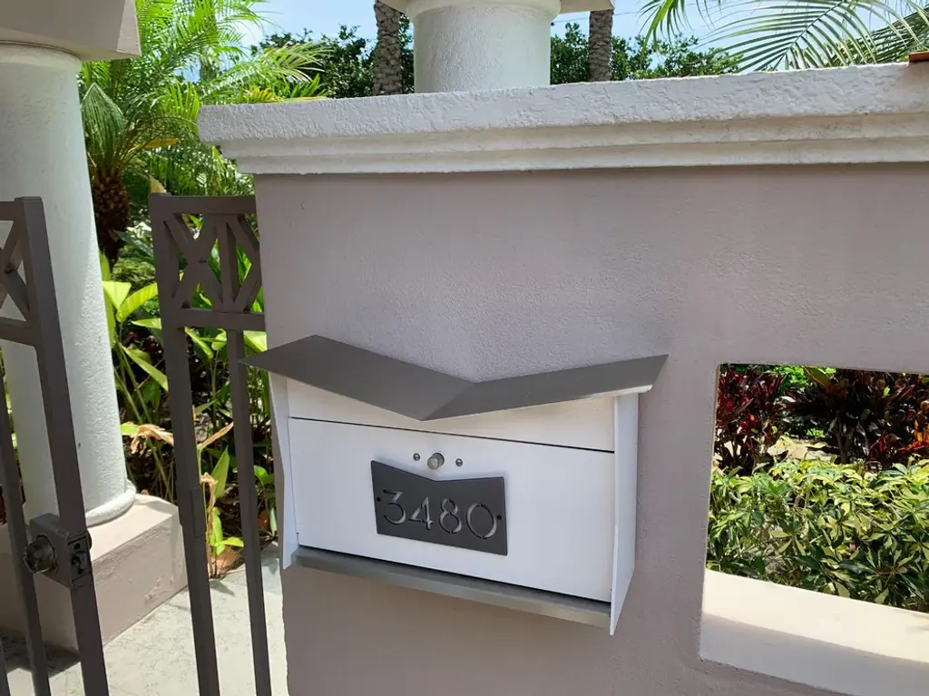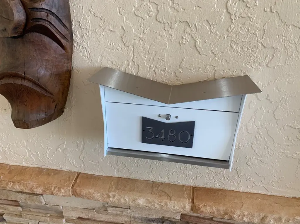 -The ButterFly Box is a Mid-century modern inspired wall mounted mailbox, the perfect curb appeal for your home, office, condo or development. Made of quality materials, here in the USA. -Give a little midcentury modern touch to any architectural style with the ButterFly Box.-Each ButterFly Box body is made out .125"? 5052-H32 aluminum, powder coated with marine grade paint with a laser anodized aluminum number plate. The base and "ButterFly" is made out of 16 gage #4 finish stainless steel. Each box has a custom laser cut address number plate.The mail Box is 15"? wide, 5-5/8"? deep and 10"?tallNote: Box should be installed in an area with an overhang. IMPORTANT, PLEASE REACH OUT TO THE SELLER WITH THE ADDRESS YOU WANT LASER CUT ON THE NUMBER PLATE WHEN CHECKING OUT.Ships in 1 to 2 weeks