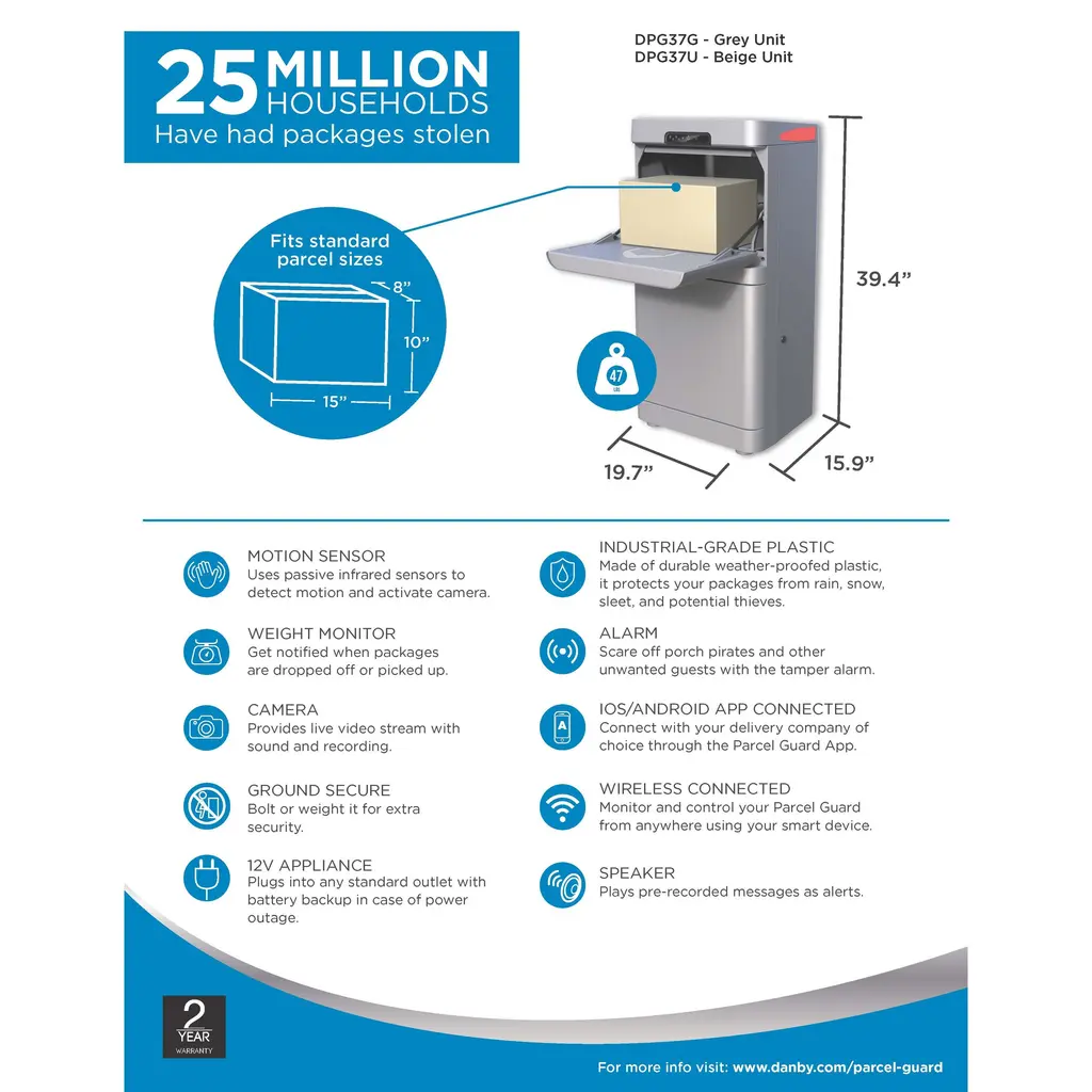 The Danby DPG37G Parcel Guard Smart Mailbox is the ultimate solution for homeowners tired of worrying about missed deliveries, parcel theft, and weather-damaged boxes. With an anti-theft drop slot, this smart mailbox keeps all your online deliveries safe until you get home. The video camera and motion detection features provide live and captured video with sound, and the cloud service comes with no subscription costs. Additionally, the mailbox's alarm can scare off unwanted activity and can be bolted to your porch, a wall, or weighted down to prevent tampering. The Danby Parcel Guard also fits both small and large parcels, with standard parcels fitting in the top drop-down compartment and larger packages fitting in the bottom door using a burner code. You can control your Wi-Fi connected Danby Parcel Guard from anywhere with Apple/Android apps or unlock it from any smart device. The heavy-duty industrial-grade materials are designed to withstand all North American weather conditions and tamper-resistant. With backup battery and interior light features included, the Danby DPG37G Parcel Guard Smart Mailbox is the perfect solution for secure and convenient package deliveries.Features: