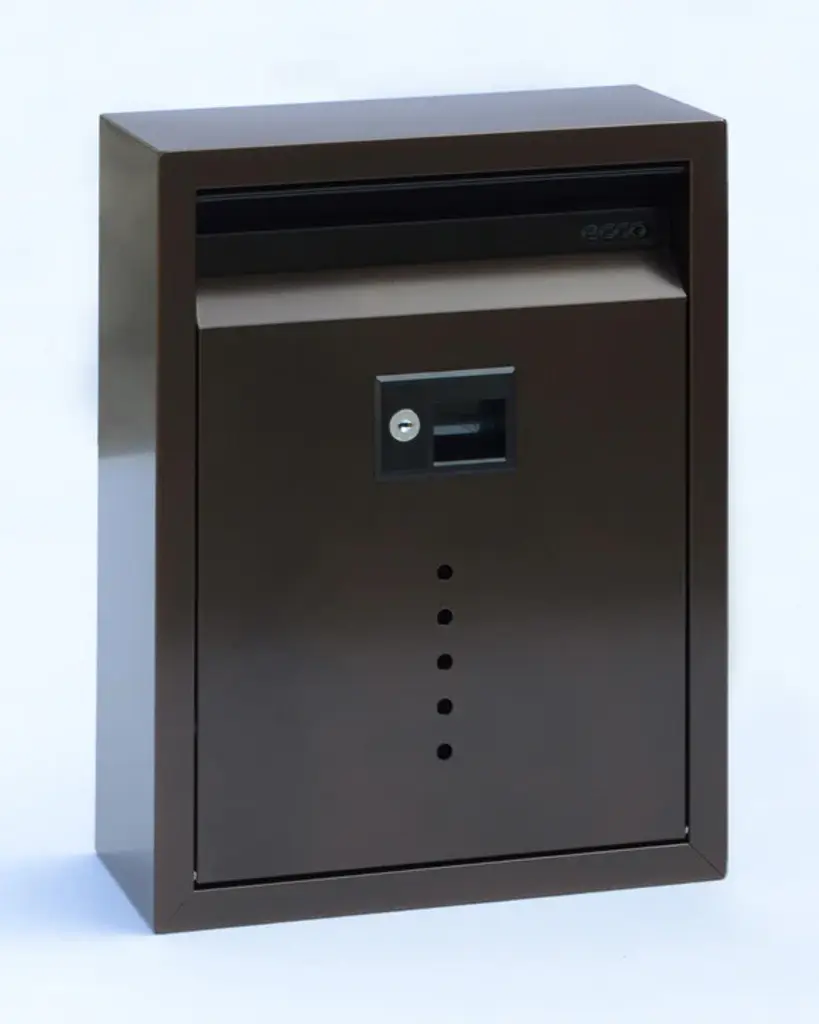 The E9 and E10 are commercial grade locking wall mailboxes made of 20 gauge 304 stainless steel with a smooth satin finish and galvanized steel with a powder-coat paint finish. The lock assembly features a built in recessed finger pull with a combination spring loaded latch and key lock allowing the door to be used with of without locking.The incoming mail slot is protected from the elements by a self closing angled flap finished in a satin black paint or stainless steel in the black model. The front door opens downward to 80 degrees preventing contents from falling out.