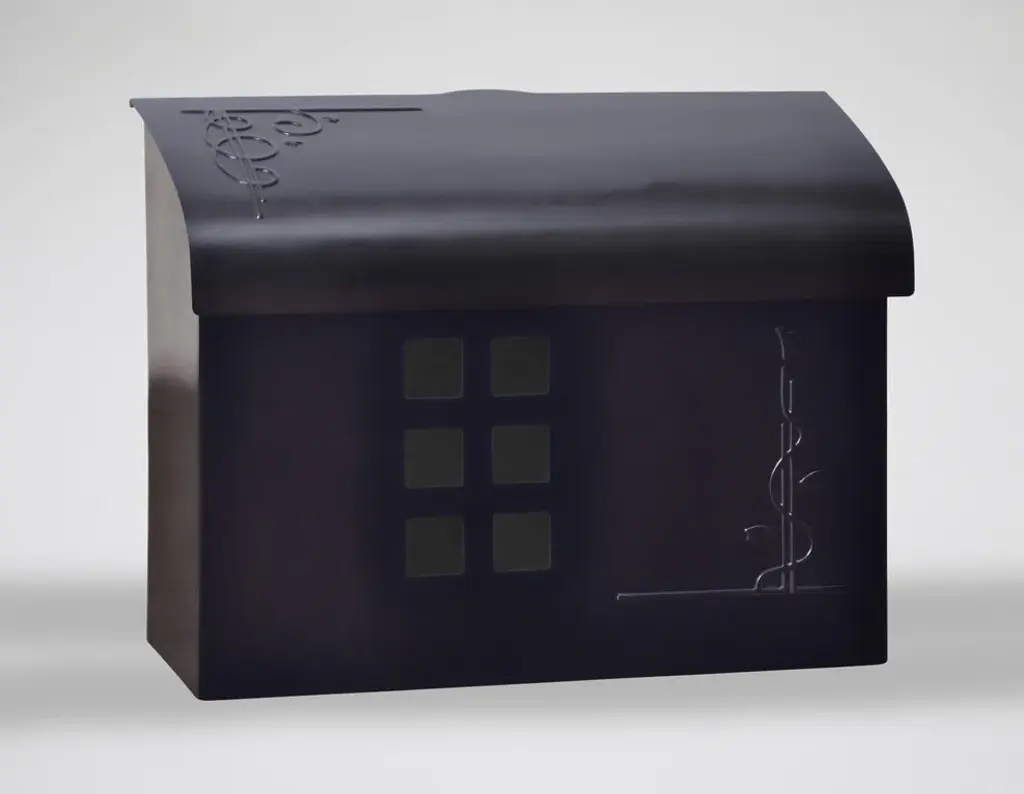 The E7 mailbox is designed in the tradition of the Arts & Crafts Movement. Accentuated ornaments are in relief on its curved lid and front panel. The horizontal configuration allows for a wider opening for easier retrieval of mail. The clear acrylic covered square windows allow spotting of contents from a distance. The mailbox is crafted in 18-gauge non-rusting brass material and plated in six metal colors