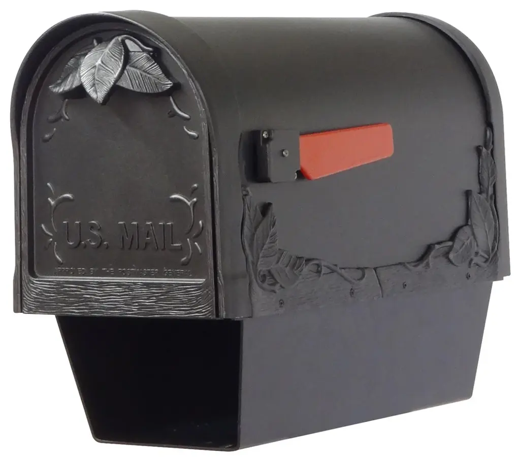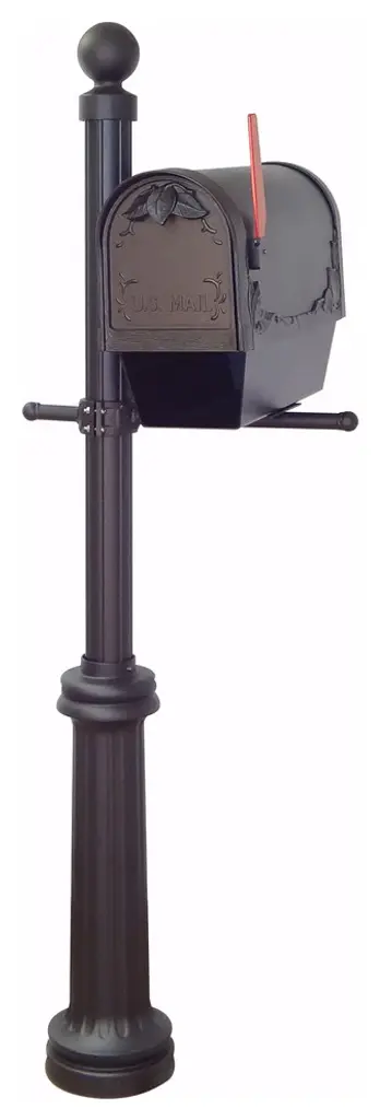 The traditional mailbox shape gets a decorative upgrade with our Floral curbside mailbox. Deeply embossed leaf designs on all sides gives the Floral curbside a charming apperance suitable for either a country of suburban home. Newspaper tube is included.This Fresno Direct Burial Mailbox Post is made of durable cast and extruded aluminum with a powder coated finish for a lifetime of beauty. 3" outer diameter x 76" H Fluted Post. Includes decorative mailbox mounting bracket and cannon ball post topper and wrap around base.
