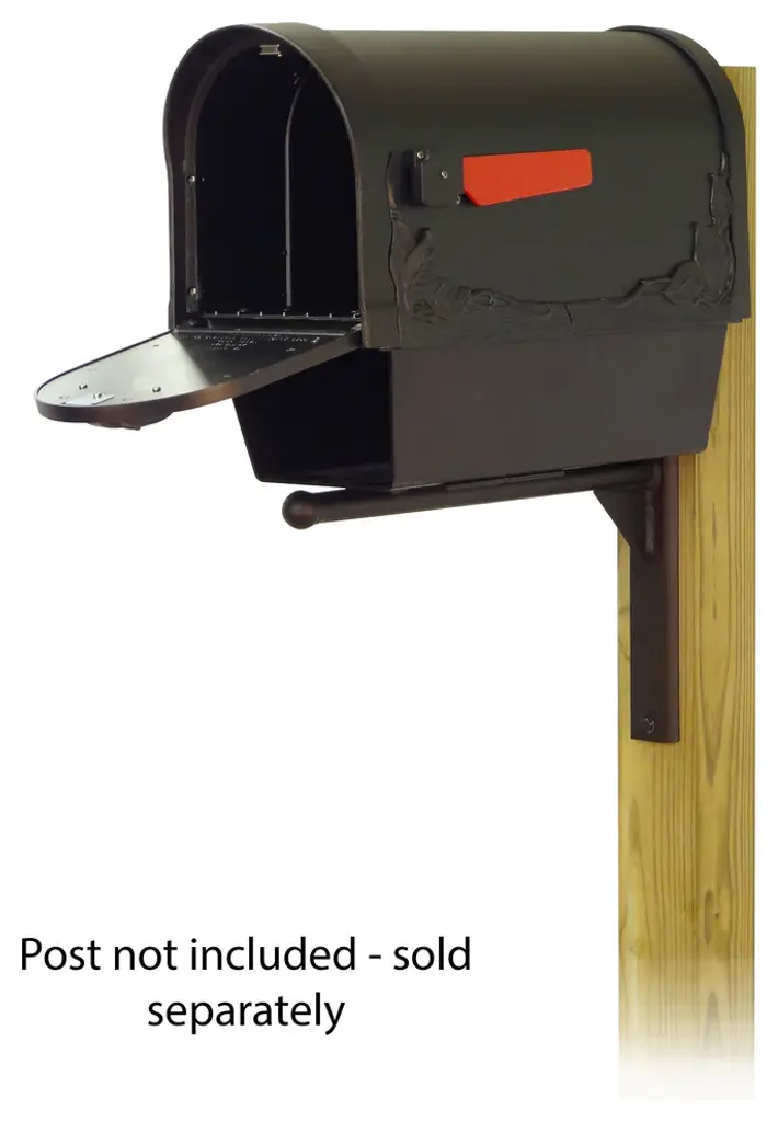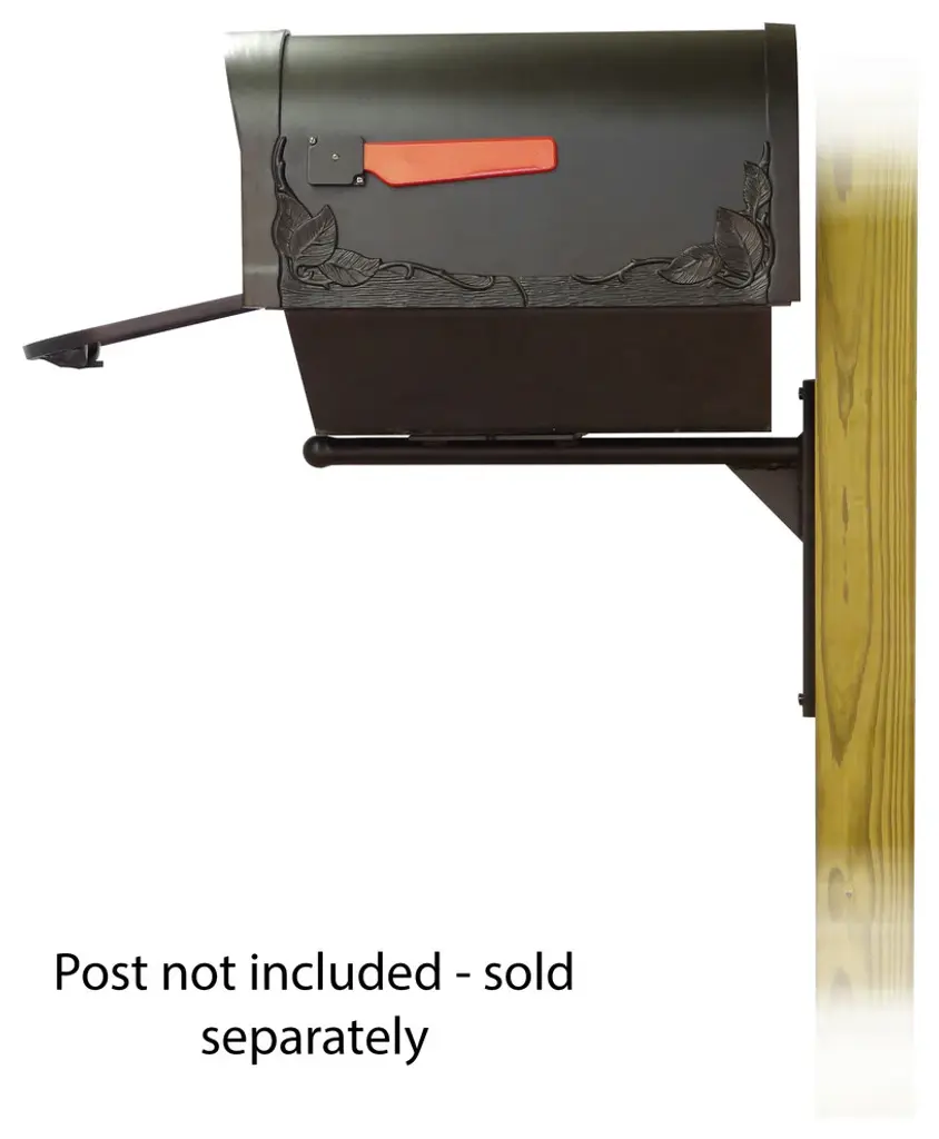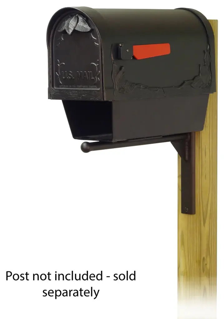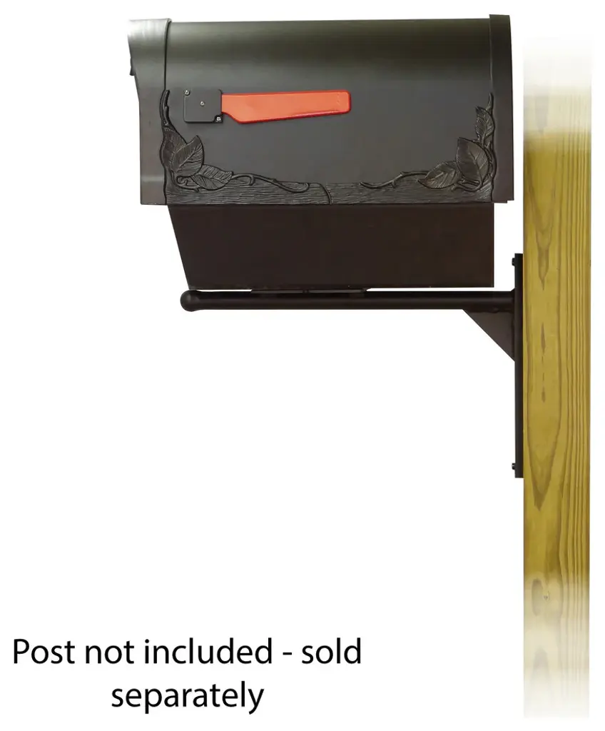 The Floral Mailbox and Ashley mounting bracket combination presents a decorative option for the typical wood post curbside mailbox. The traditional mailbox shape gets a decorative upgrade with our Floral curbside mailbox. Deeply embossed leaf designs on all sides gives the Floral curbside a charming appearance suitable for either a country or suburban home. The Ashley mounting bracket brings a simplistic, contemporary look to your mailbox. Newspaper tube, mailbox and mailbox mounting bracket included. This set does NOT include a post as it is intended to be mounted on an existing wood post or solid surface, or a new wood post that can be purchased separately. Mounting hardware is included.