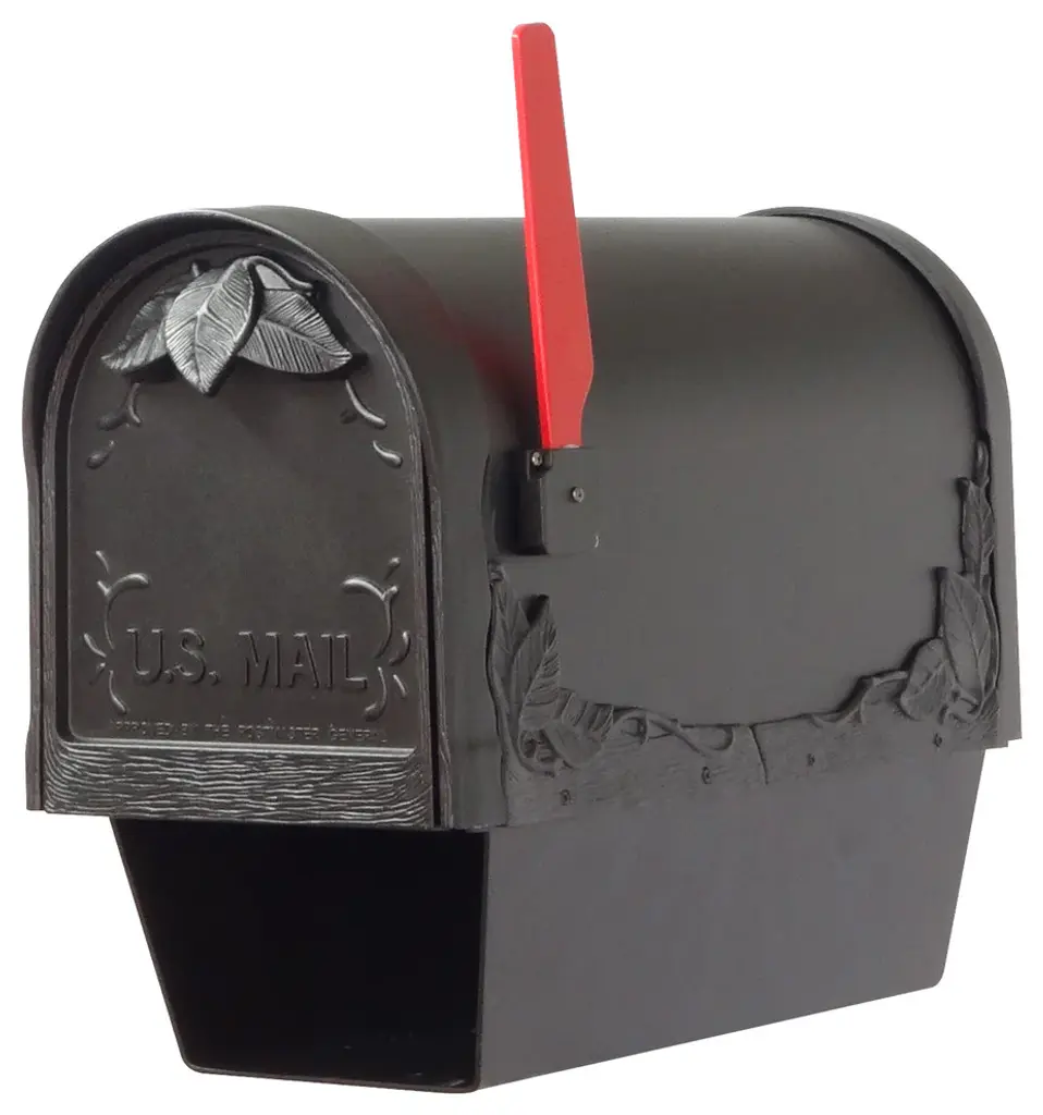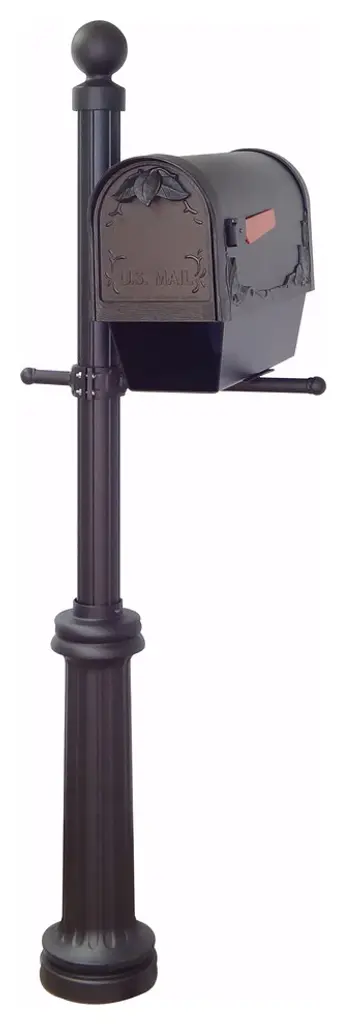 The traditional mailbox shape gets a decorative upgrade with our Floral curbside mailbox. Deeply embossed leaf designs on all sides gives the Floral curbside a charming apperance suitable for either a country of suburban home. Newspaper tube is included.This Fresno Direct Burial Mailbox Post is made of durable cast and extruded aluminum with a powder coated finish for a lifetime of beauty. 3" outer diameter x 76" H Fluted Post. Includes decorative mailbox mounting bracket and cannon ball post topper and wrap around base.This mailbox combination also includes an easy to install locking insert, to help protect from identity theft. Manufactured from rust free powder coated aluminum, the Lock Box firmly attaches to the bottom of the mailbox and cannot be removed without the key. The Lock Box insert is easly installed with four screws (included). Consult your local postmaster regarding regulations governing the installation of locking inserts.
