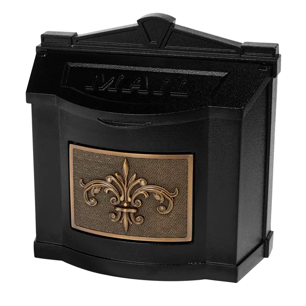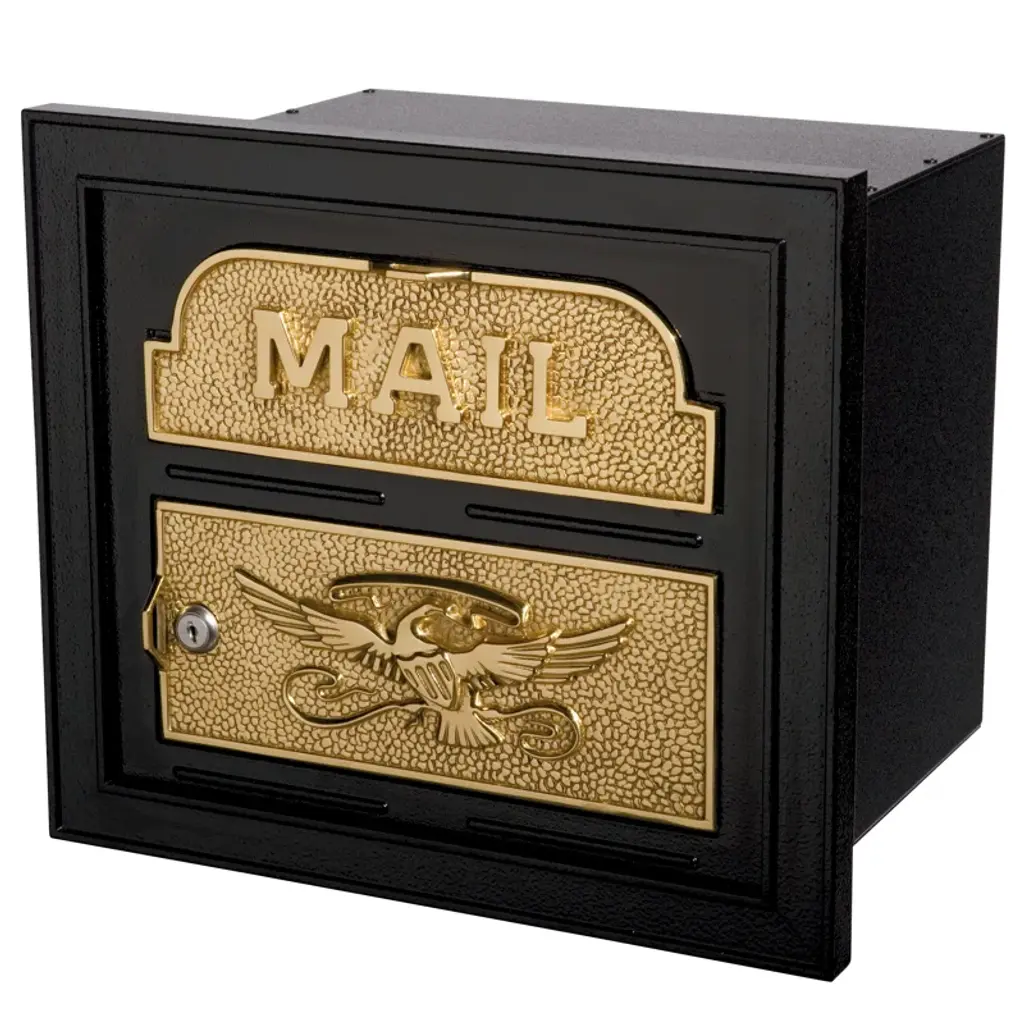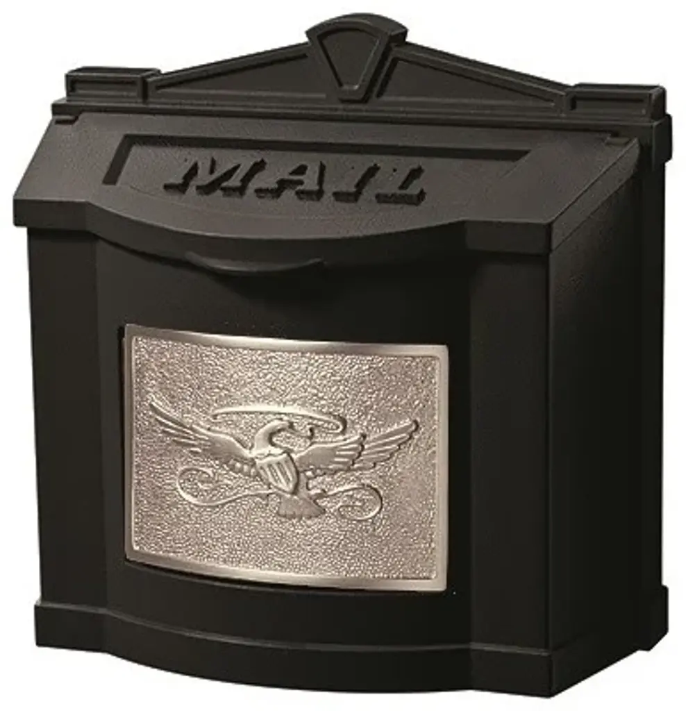 Special Note: OPTIONAL LOCKING INSERT NOT INCLUDEDFrom its elegant design, to its five-stage powder-coated paint process, Gaines Manufacturing continues to impress with their full line of residential wall mounted mailboxes.All of Gaines MFG wall mounted mailboxes are designed to hold numerous pieces of mail, magazines and small packages. The mailbox door stays upright when mail is being deposited and when it closes it lands softly on pads for quiet operation. Gaines line of wall mounted mailboxes were engineered to give you years of lasting beauty.Gaines Level Two Black Wall Mount Series Mailbox with Eagle accent include:Durable Aluminum constructionFive-stage powder-coated paint processComplete with mounting hardware, installation instructions and mounting templateOptional Locking insert to protect against identity theftMeasures 14 3/8"H x 14 7/"W x 7 1/"D.Made in USA!