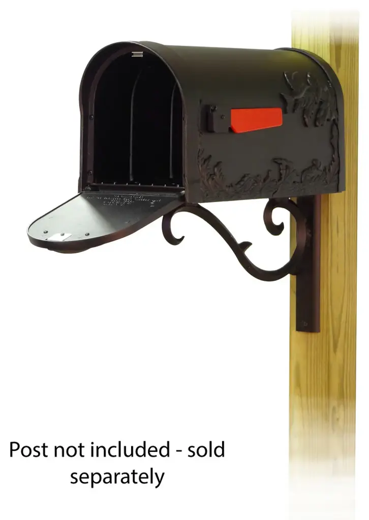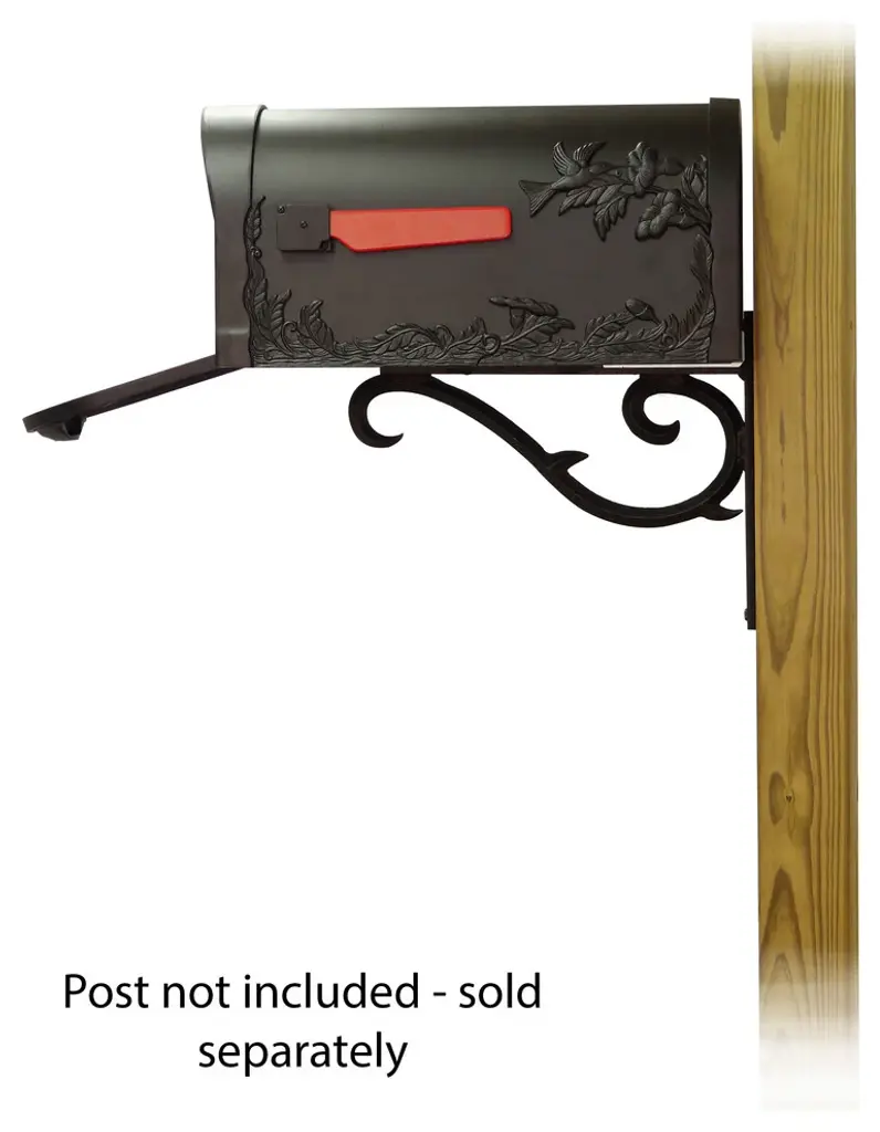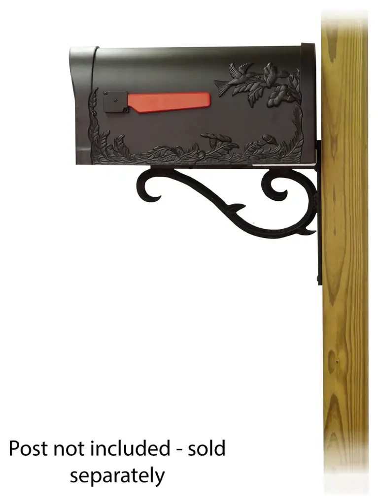 The Hummingbird Mailbox and Sorrento mounting bracket combination presents a decorative alternative for the typical wood post curbside mailbox. The striking hummingbird details on both sides and the front of this mailbox make it more than your average mailbox. The deeply embossed designs show your love of nature and will last through a lifetime of weathering. The Sorrento mounting bracket is an elegant cast aluminum scroll that will give a high class, decorative appearance to your mailbox. Mailbox and mailbox mounting bracket included. This set does NOT include a post as it is intended to be mounted on an existing wood post or solid surface, or a new wood post that can be purchased separately. Mounting hardware is included.