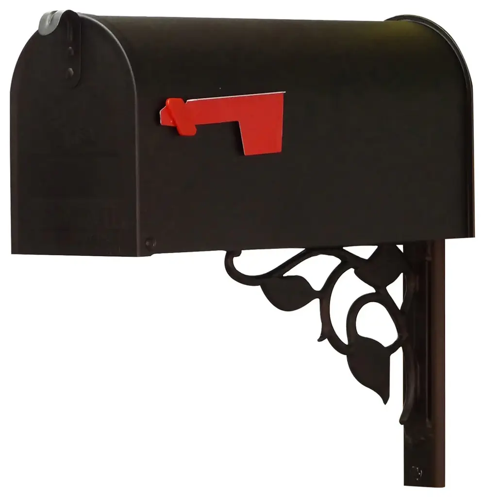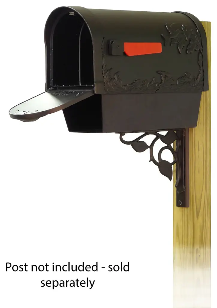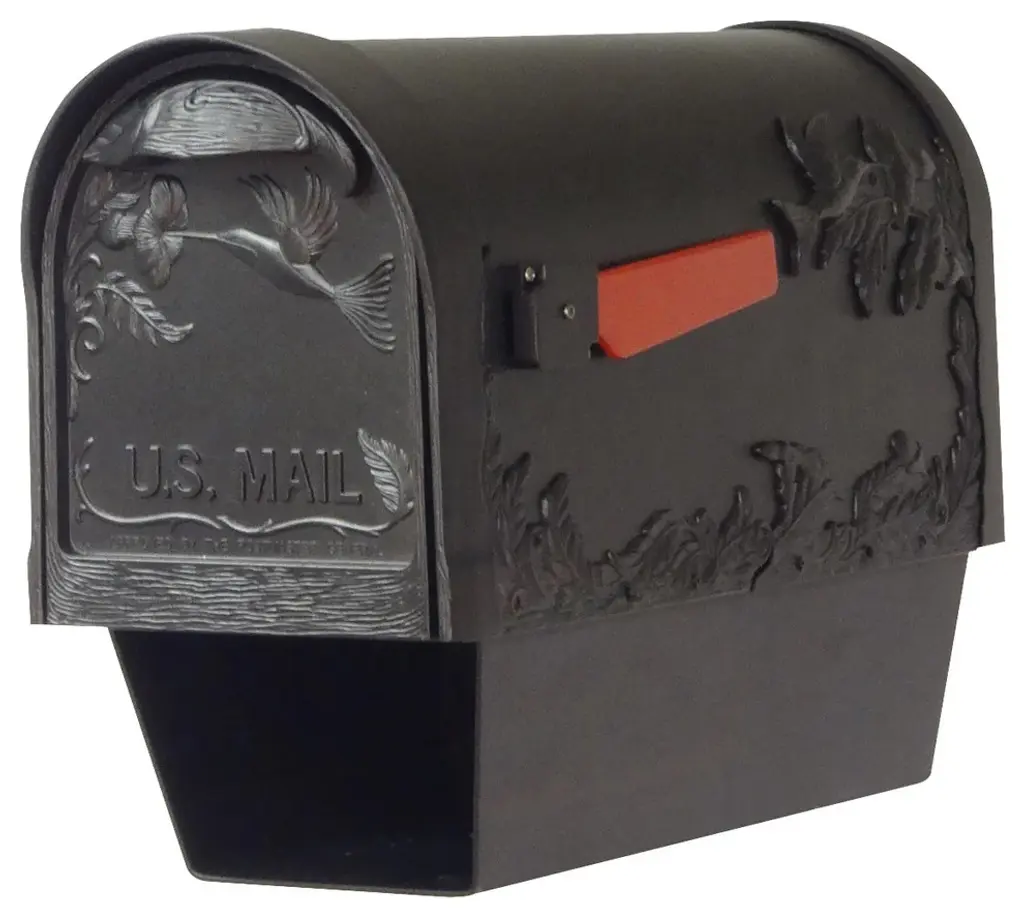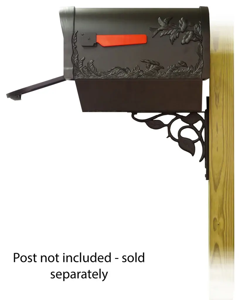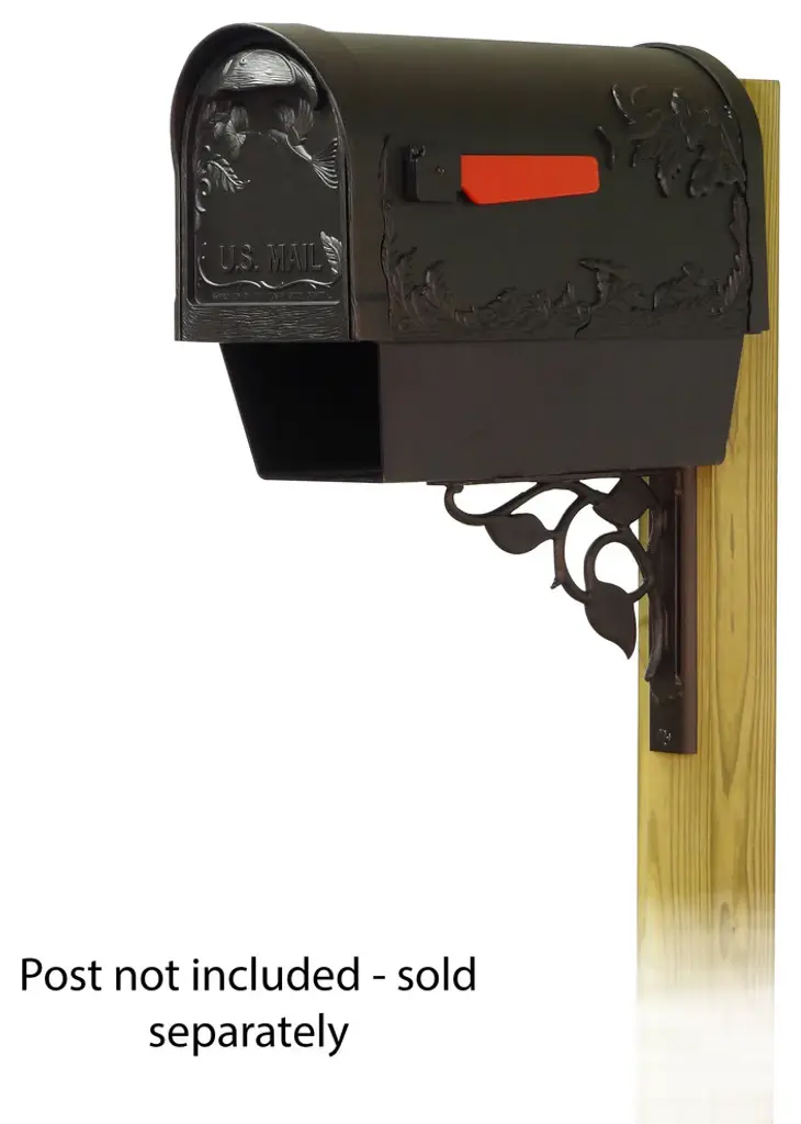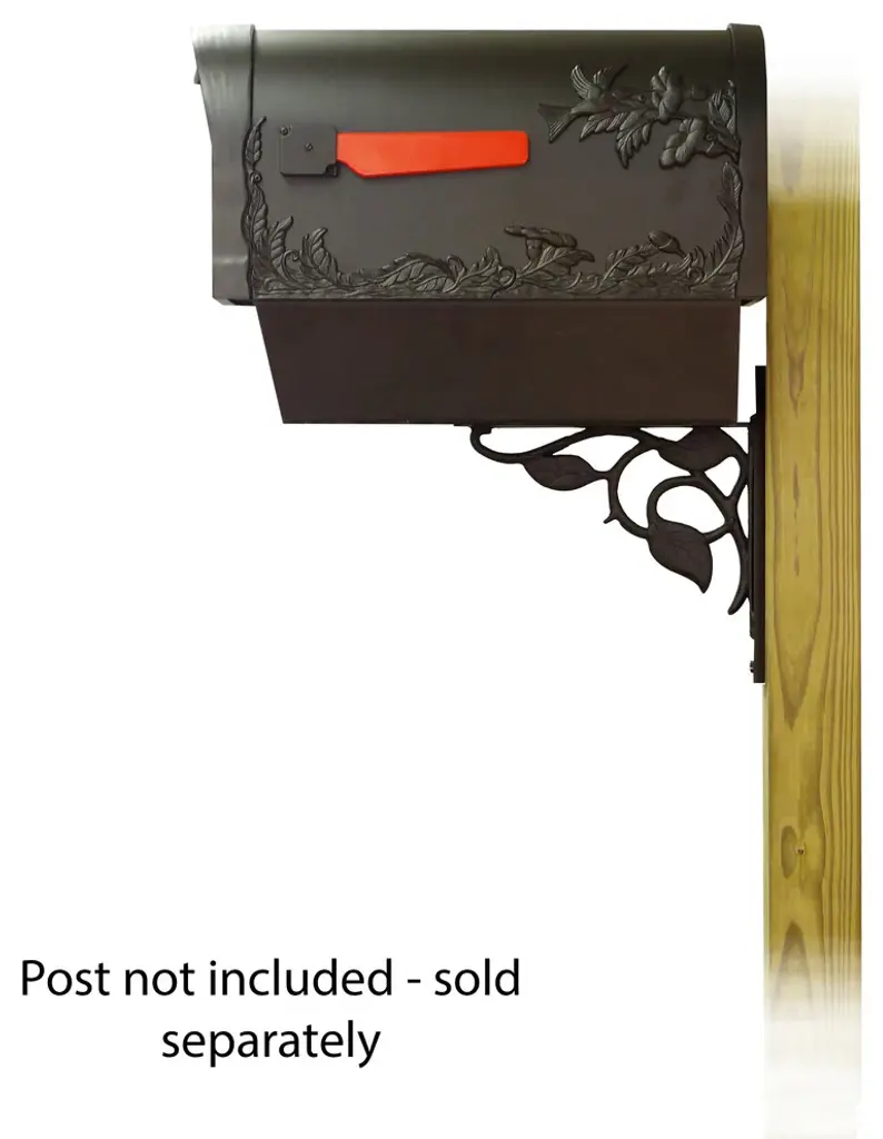The Hummingbird Mailbox and Floral mounting bracket combination presents a decorative alternative for the typical wood post curbside mailbox. The striking hummingbird details on both sides and the front of this mailbox make it more than your average mailbox. The deeply embossed designs show your love of nature and will last through a lifetime of weathering. The Floral mounting bracket is a decorative cast aluminum bracket that will bring an elegant appearance to your mailbox. Newspaper tube, mailbox and mailbox mounting bracket included. This set does NOT include a post as it is intended to be mounted on an existing wood post or solid surface, or a new wood post that can be purchased separately. Mounting hardware is included.