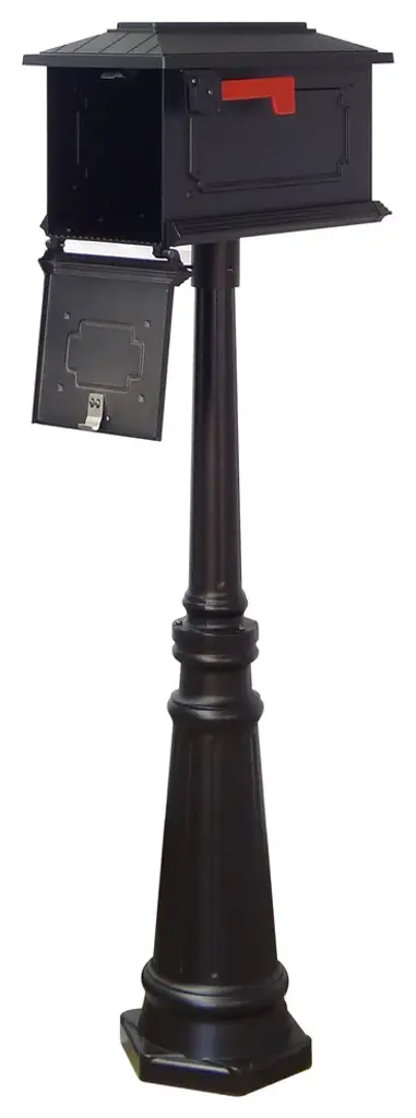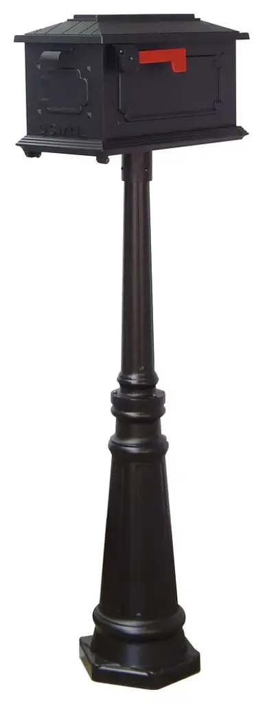 The Kingston Curbside Mailbox will add a unique look to your curb appeal. The solid cast aluminum construction and deometric styling makes this mailbox the perfect choice for modern or contemporary architecture. No mounting plate is required. The Tacoma surface mount mailbox post is made of cast aluminum. Post dimensions are 42" H x 9" Dia. Base. A direct burial kit is included for easy installation into soil.