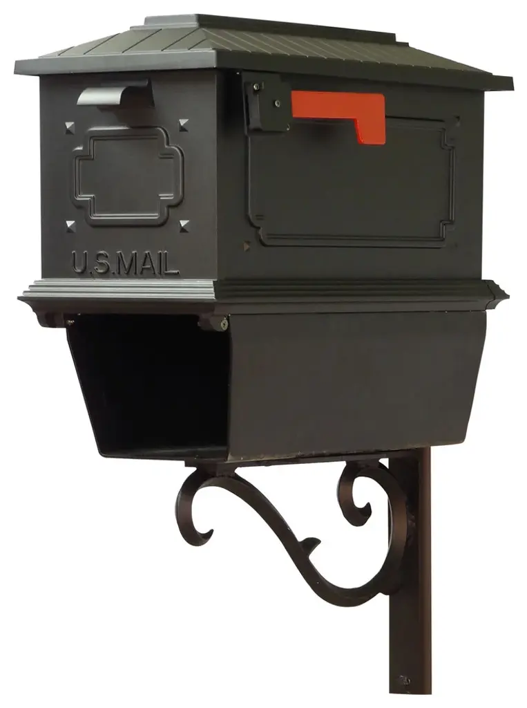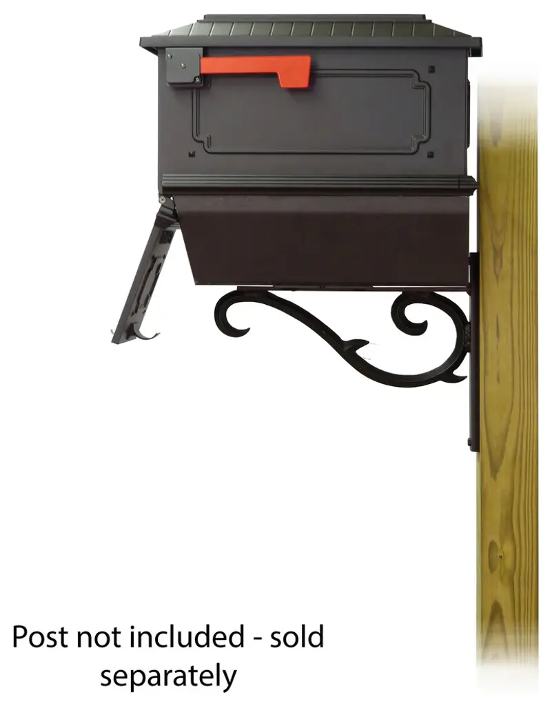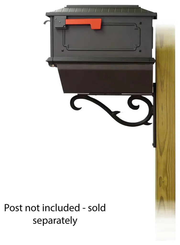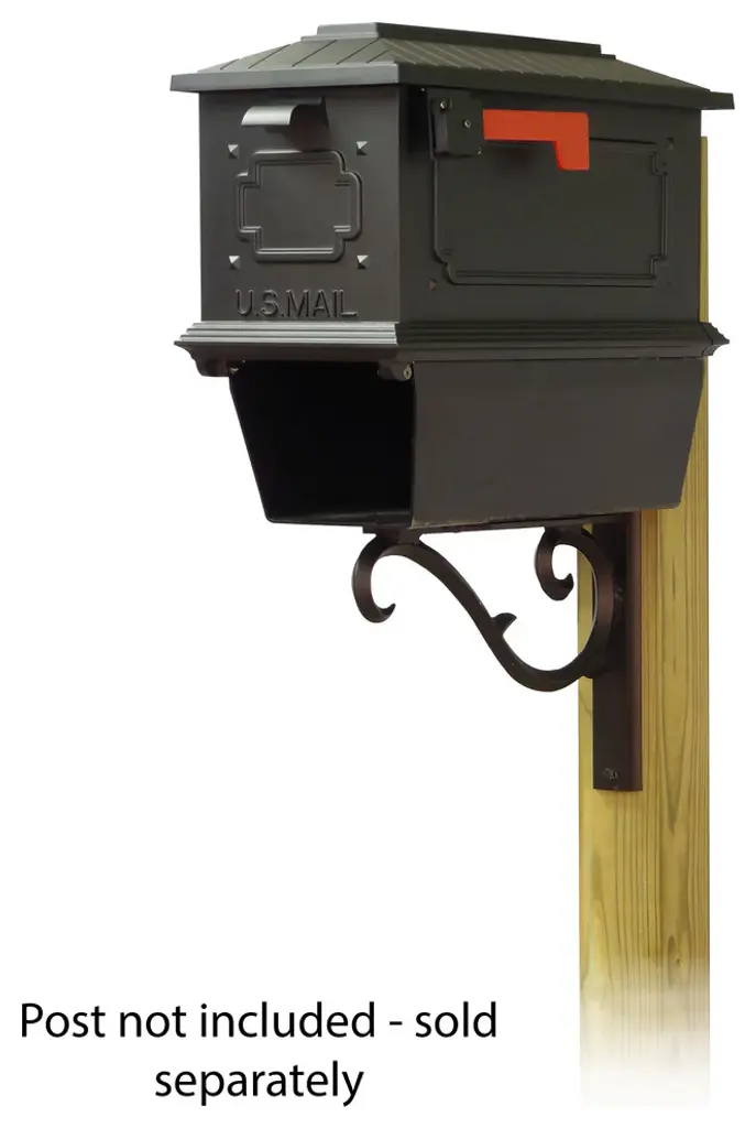 The Kingston Mailbox and Sorrento mounting bracket combination presents a upscale alternative for the typical wood post curbside mailbox. The Kingston Curbside Mailbox will add a unique look to your curb appeal. The solid cast aluminum construction and geometric styling makes this mailbox the perfect choice for modern or contemporary architecture. No mounting plate is required. The Sorrento mounting bracket is an elegant cast aluminum scroll that will give a high class, decorative appearance to your mailbox. Newspaper tube, mailbox and mailbox mounting bracket included. This set does NOT include a post as it is intended to be mounted on an existing wood post or solid surface, or a new wood post that can be purchased separately. Mounting hardware is included.