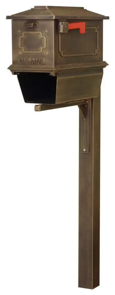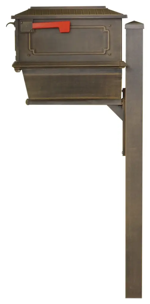 Our Kingston Curbside Mailbox has universal appeal with this smooth geometric styling accented with a simple decorative embossing. The low profile belies the spacious interior. Sturdy with clean lines the Wellington post fits perfectly with any style of home architecture. If you are looking for a geometric design that adds more curb appeal to your home, the Kingston and Wellington are for you. The adjustable door latch mechanism will allow you the modify the amount of tension when opening and closing the door. No matter your preference the door will stay secure while the rust proof cast aluminum, powder coated body construction creates a weather resistant mailbox. The Kingston�s size will fit your important mail, documents, packages and keep them dry. The housing around the die cast flag is finished to match the body and will ensure the flag will stay upright to signify pickup at your mailbox. The side panels of the Kingston easily will accommodate 3-inch address digits. No mounting plate is required. Newspaper tube included.The traditional square mailbox post design with a decorative upgrade! Sturdy with clean lines the Wellington post fits perfectly with any style of home architecture. Quick and easy direct burial will make assembly simple. No wood post needed! This is not a sleeve like many other companies use. This is a single 3" x 3" aluminum sturdy bodied post capped with a pyramid topper. The contemporary aluminummounting bracket easily attaches to the post. Made entirely of aluminum with stainless steel components to eliminate rusting. Direct burial installation is required.