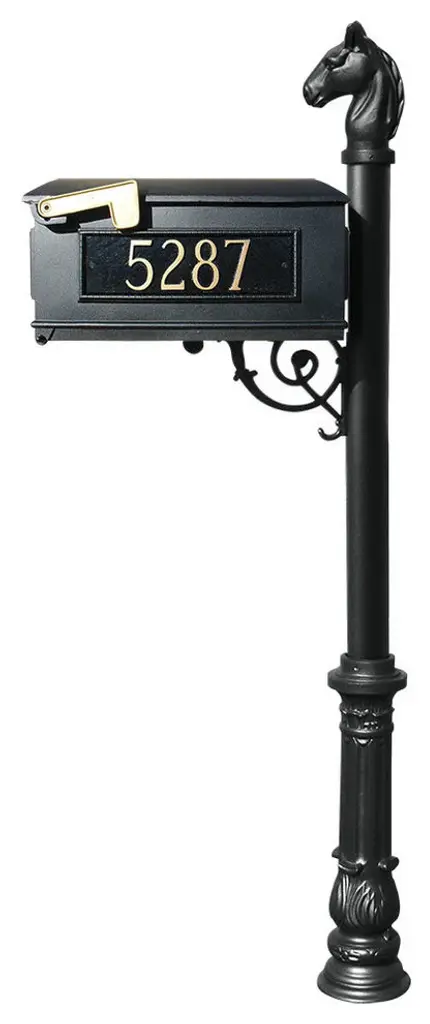 Lewiston Equine Mailbox Post System with decorative fluted base, horsehead finial and Gold Vinyl personalized numbers, WhiteOur Lewiston Equine Mailbox Collection is made from rust-free cast aluminum with a durable weather resistant finish. Mailbox comes with post, support brace, decorative horsehead finial and fluted base. Mailbox color is white and features either Black or Gold vinyl numbers that are attached to all three sides of mailbox. Post, support brace, finial and base color: WhiteMade of cast aluminum with vinyl numbersTough powder-coat finishMailbox has cast gold masonry flagProduct Dimension: 8"x20"x5''2"Color: White